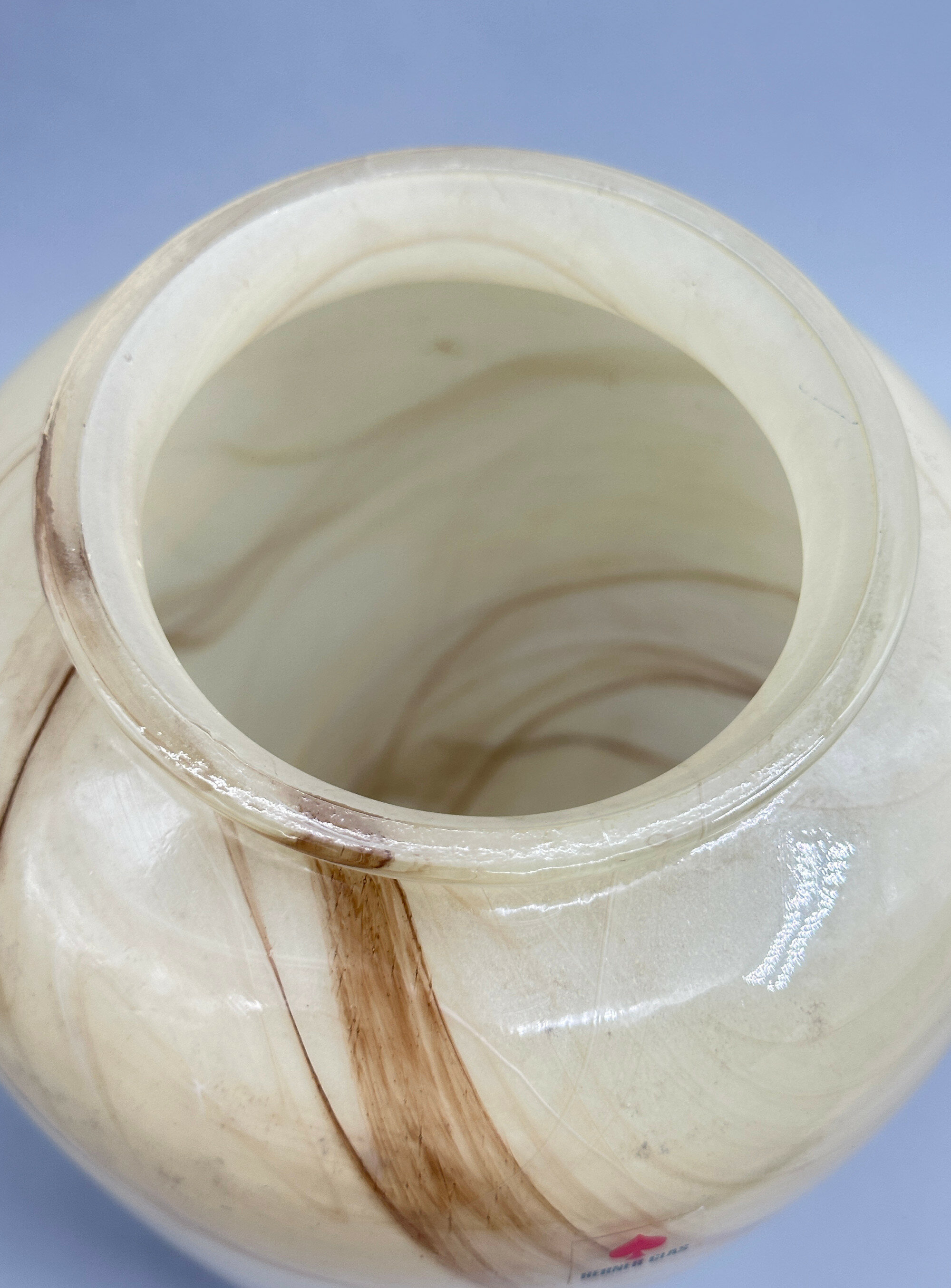 A tall glass vase, the body of tapering form with a short concave neck and flaring rim, decorated in mustard and brown colourings and traces of white with a trailing swirl pattern, a small label to the side reading ‘Herner Glas’. The firm ‘Herner Glas’ was founded in 1986 at Herne, a town in the Ruhr area of Germany. It specialises in hand blown art glass and marble effect pieces, as here, are one of its particular specialities. Many of its pieces survive with the original maker’s label containing the distinctive red ace of spades and some also include the model number.| Size: | H 24 cm Diameter 15 cm |