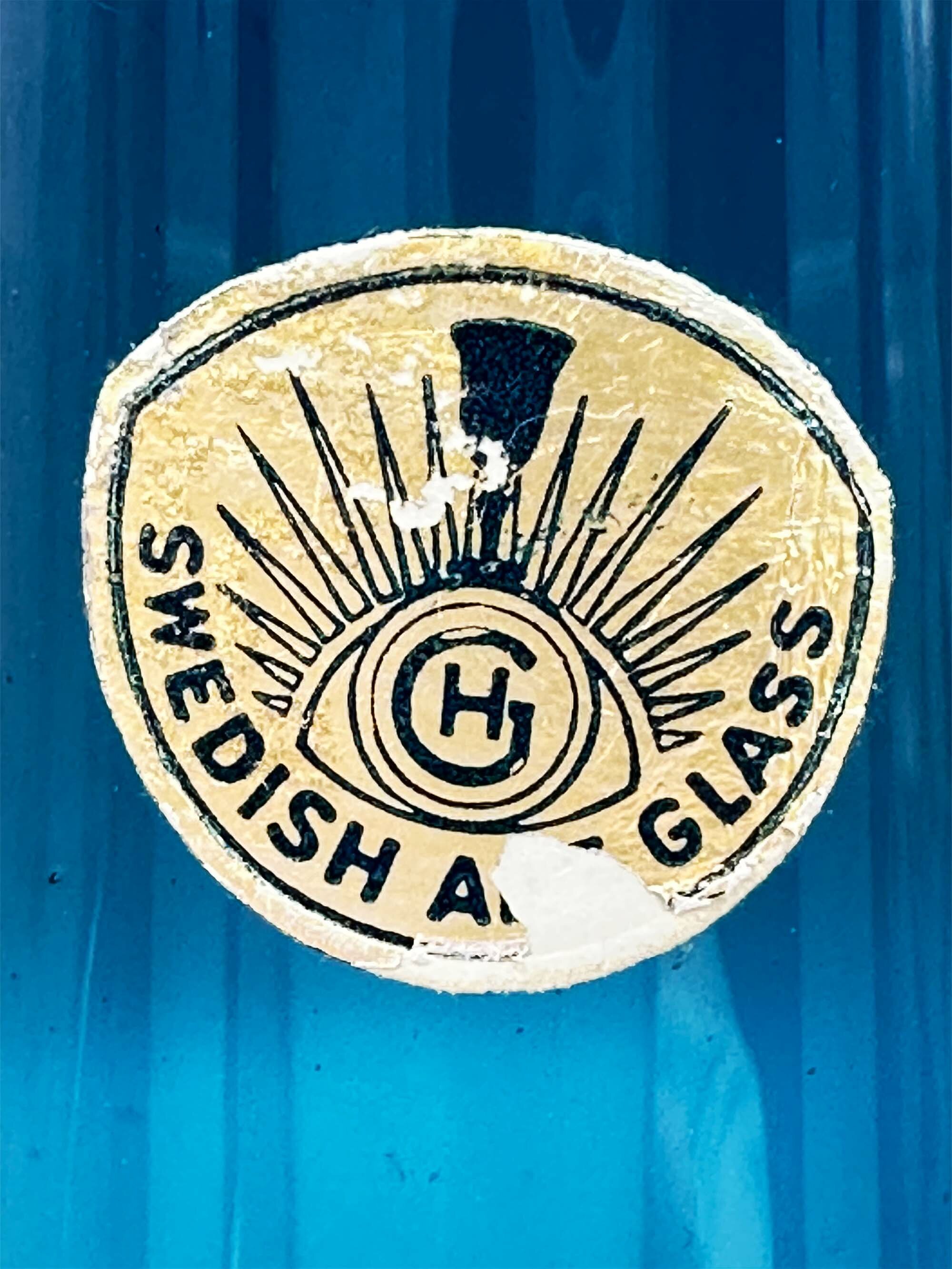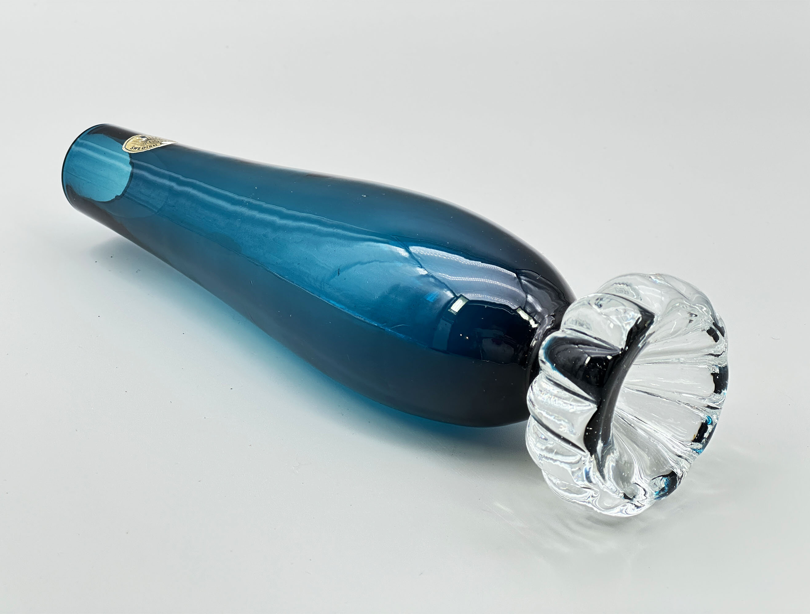 An art glass vase, probably for the display of a single flower, the slender ovoid blue glass body supported by a ribbed clear glass circular foot. Towards the top is a label reading ‘Swedish Art Glass’ with a monogram ‘GH’ within a stylised crown which points to the Swedish glassmakers ‘Hjorts Glasbruk’, rather less well known than some of their competitors. Dating is most likely to the later years of the twentieth century.| Size: | Ht (max) 22.5cm, Width (body max) 5.5cm, Base 6cm |