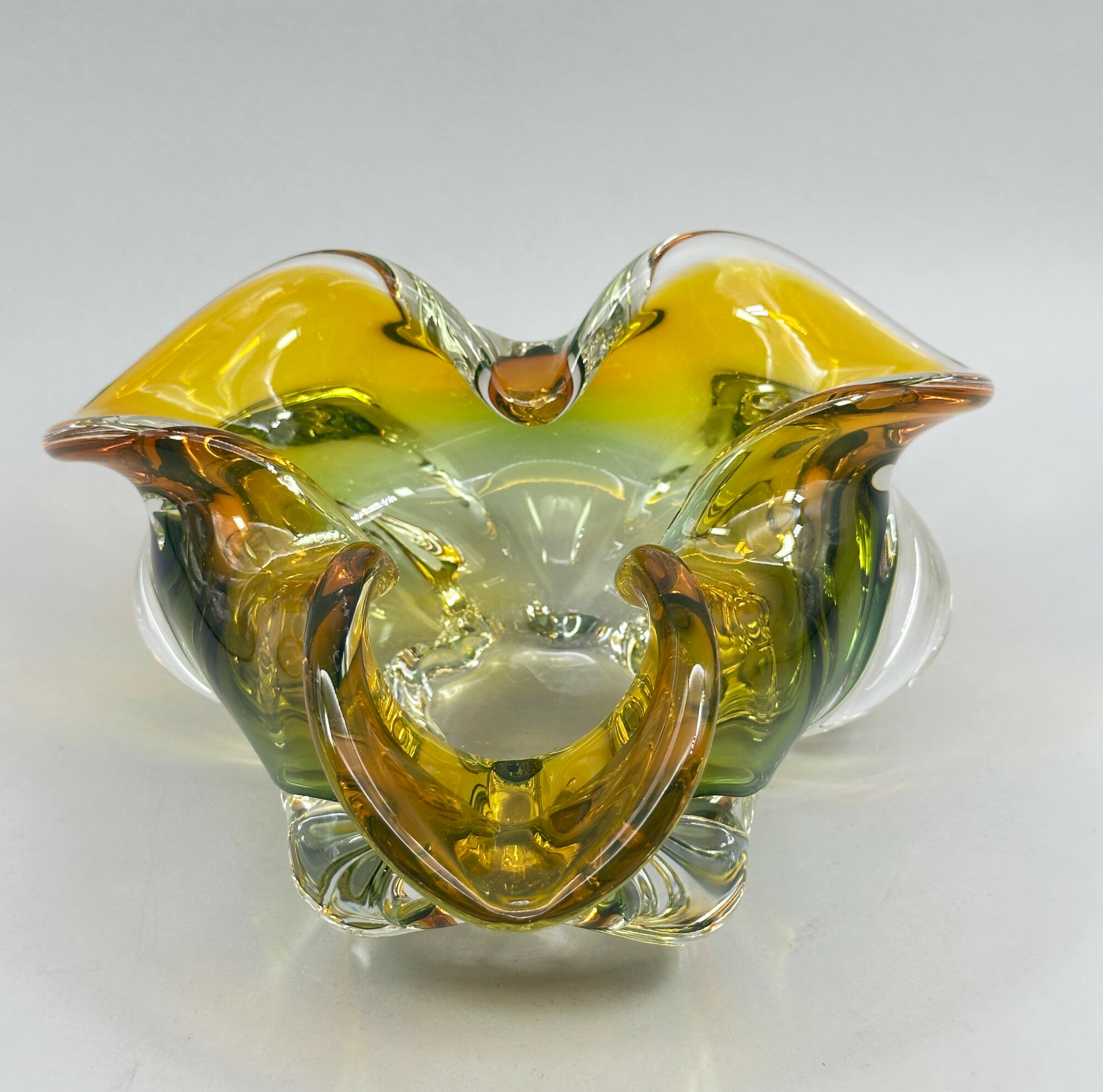 An organically formed sculptural glass bowl or ashtray, of trefoil form with an undulating rim and three projecting ‘knobs’ above the flat base, the colourings merging from green to amber with clear glass at the base. This piece was made at the Chřibská glassworks in Czechoslovakia and can be seen in their 1970s catalogue with the pattern number 240/5/20. An entry in issue 12 of the 1964 Czech Glass Review confirms the designer as Josef Hospodka who was chief designer at Chřibská from 1958 to 1970 and again from 1985 to 1989. His organic, sculptural blown glass designs enjoyed great popularity and some remained in production until the factory closed in 2007. The colourings here are particularly pleasing and this is an excellent example of his work.| Size: | Ht (max) 10cm, Width (max) 20cm, Base (max) 5.8cm |