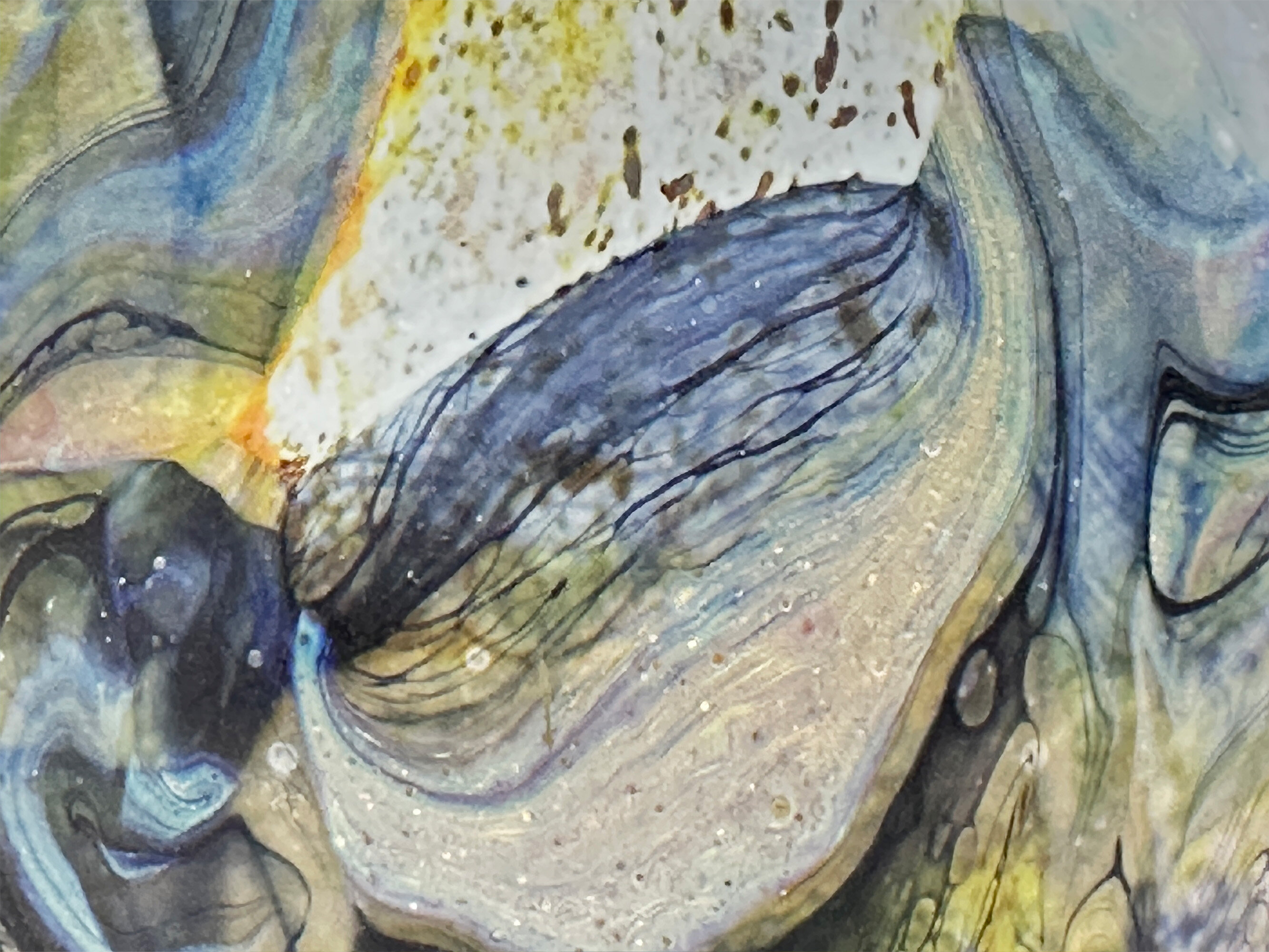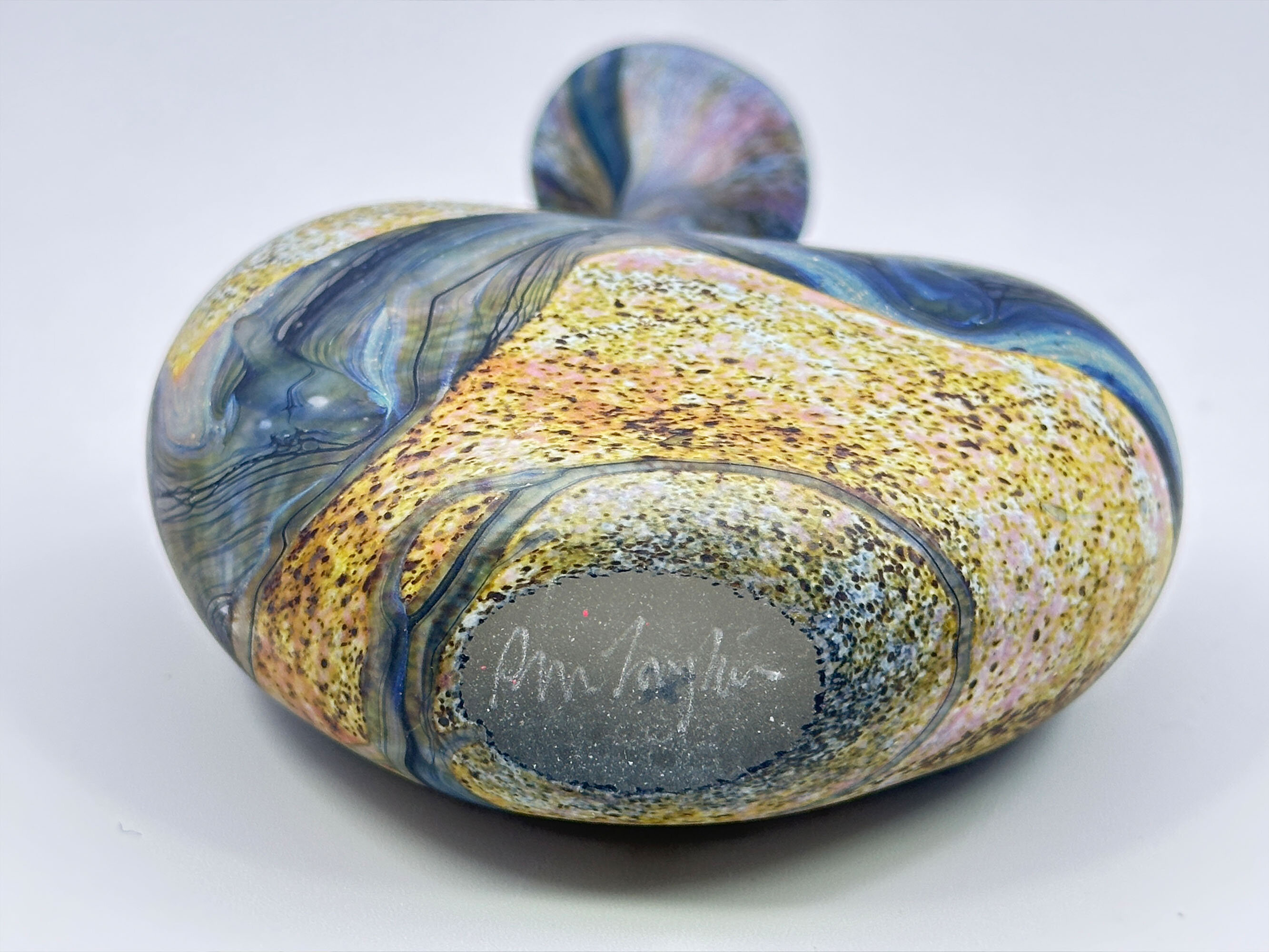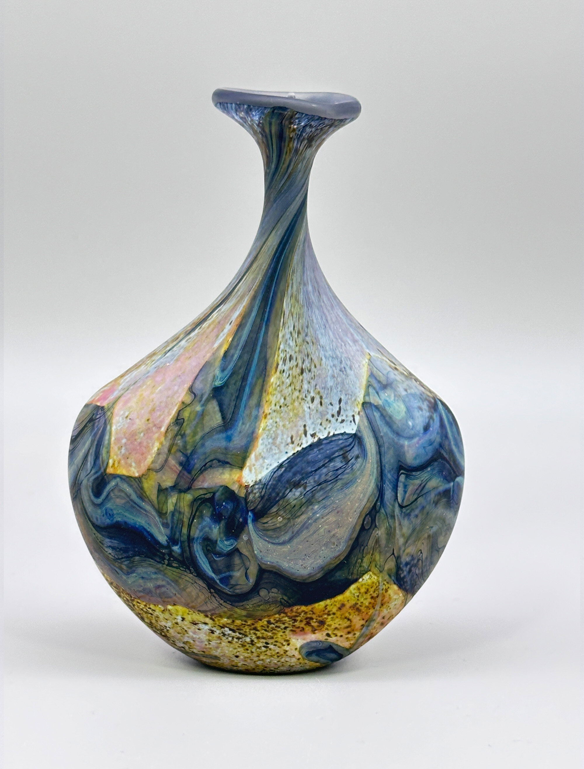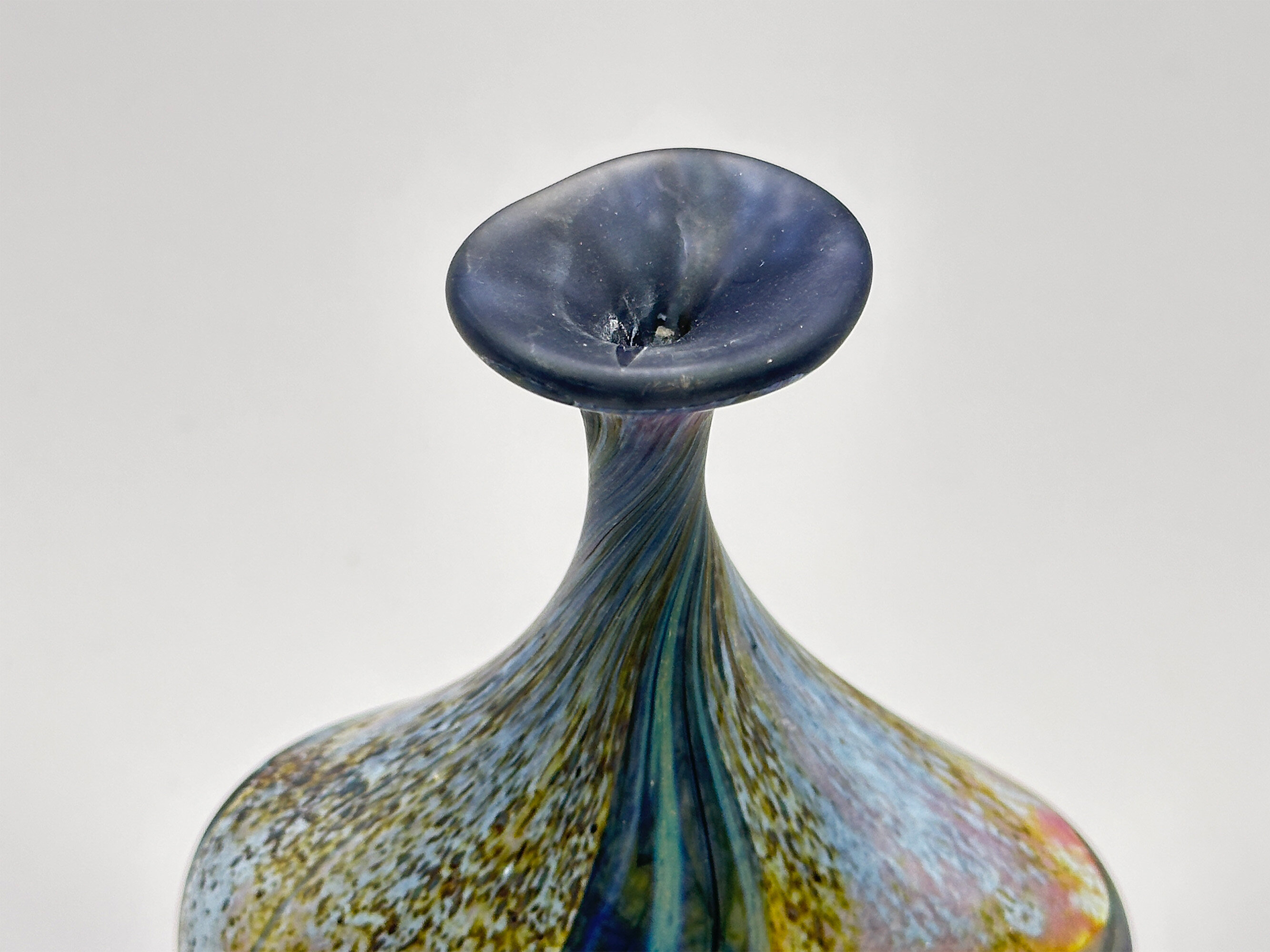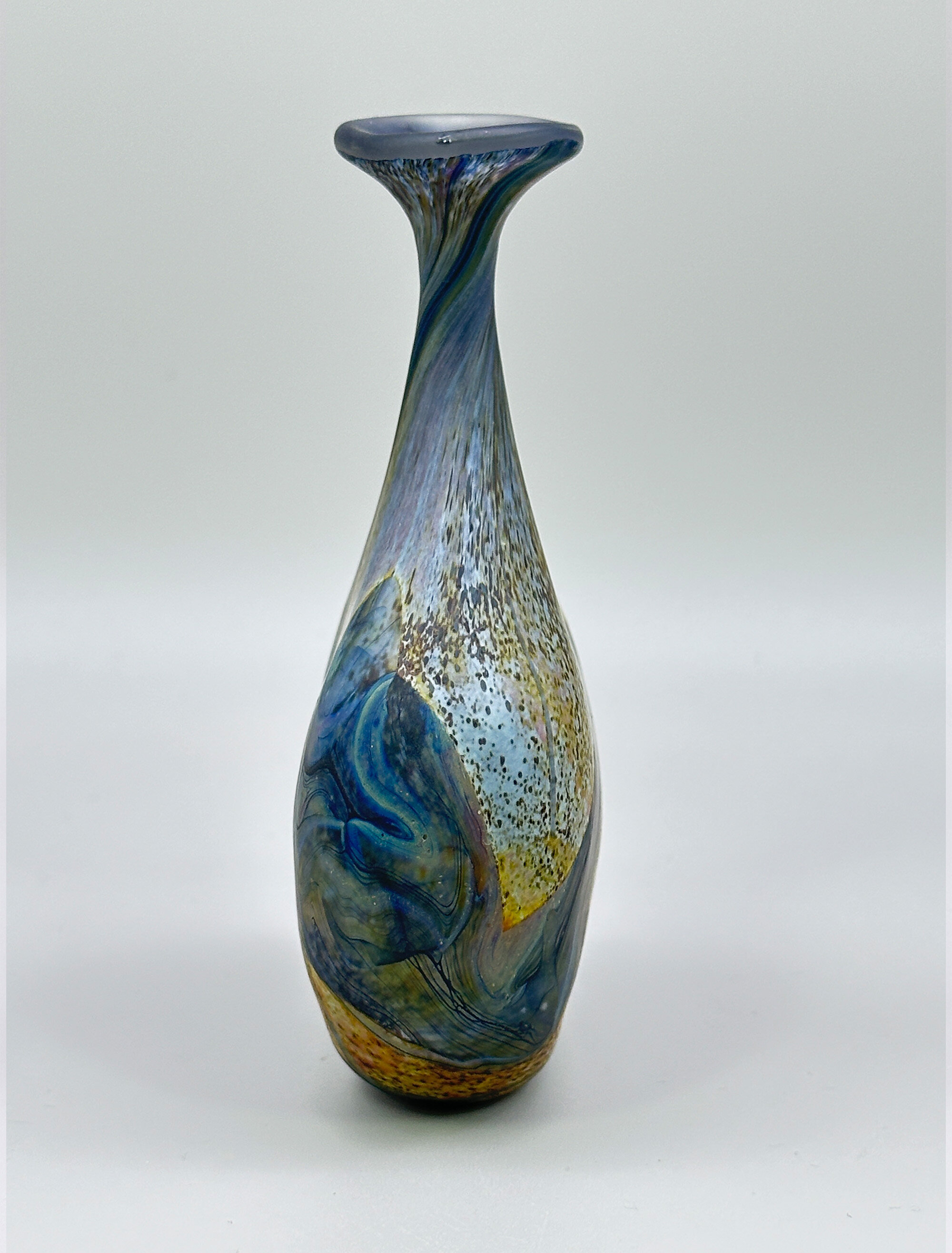 A frosted art glass vase of near ‘lollipop’ form the broad and narrow rounded body with the shoulder curving sharply inwards towards the slender neck which flares outwards to the wavy top rim, the base flat with an etched signature for Peter Layton, the decoration a mixture of abstract and organic segments in tones of blue, brown and mustard with flecking and wave like effects, the whole with a naturalistic ‘feel’.Peter Layton is one of Britain’s most celebrated glass artists. Born in 1936, his initial interest was in ceramics but in 1965, while on a teaching post at the University of Iowa, his focus changed and he began to study the art of glass blowing, at a time when the art glass movement in America had an enthusiastic following. Returning to England in 1968, he started a a small glass studio in the Highlands of Scotland while relying on pottery to earn a living. Eight years later, in 1976, he opened the ‘London Glassblowing’ studio which continues to this day and where Peter Layton, now in his eighties, continues to train and supervise upcoming glass artists as well as producing his own work.