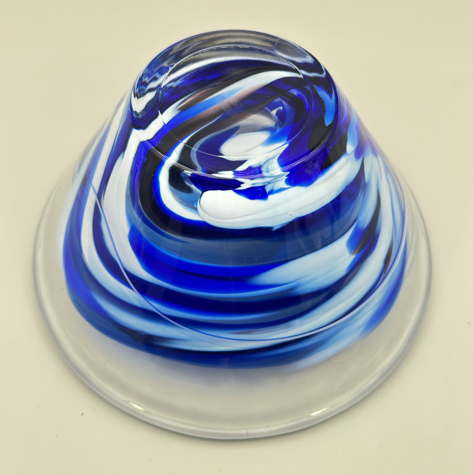 A small glass bowl with a straight flaring profile and a flat base, the decoration with swirling trails of blue glass on a clear glass ground, the label for Kosta Boda attached and reading ‘‘KOSTA BODA since 1742’.Kosta Boda, previously known as Kosta Glasbruk, is a Swedish glassmaking company founded by two foreign officers in Charles XII's army, Anders Koskull and Georg Bogislaus Staël von Holstein, in 1742.It is located in Kosta, Sweden. Early production consisted of window glass, chandeliers and drinking glasses. From the 1840s, the factory was at the forefront of new trends and technical developments, producing pressed glass, and in the 1880s setting up a new glass-cutting workshop. In 1903, the company merged with the Reijmyre glassworks but both retained their own names and Kosta went on to maintain its reputation as one of the leading Swedish manufacturers with a range of fine art glass and tableware by distinguished designers.