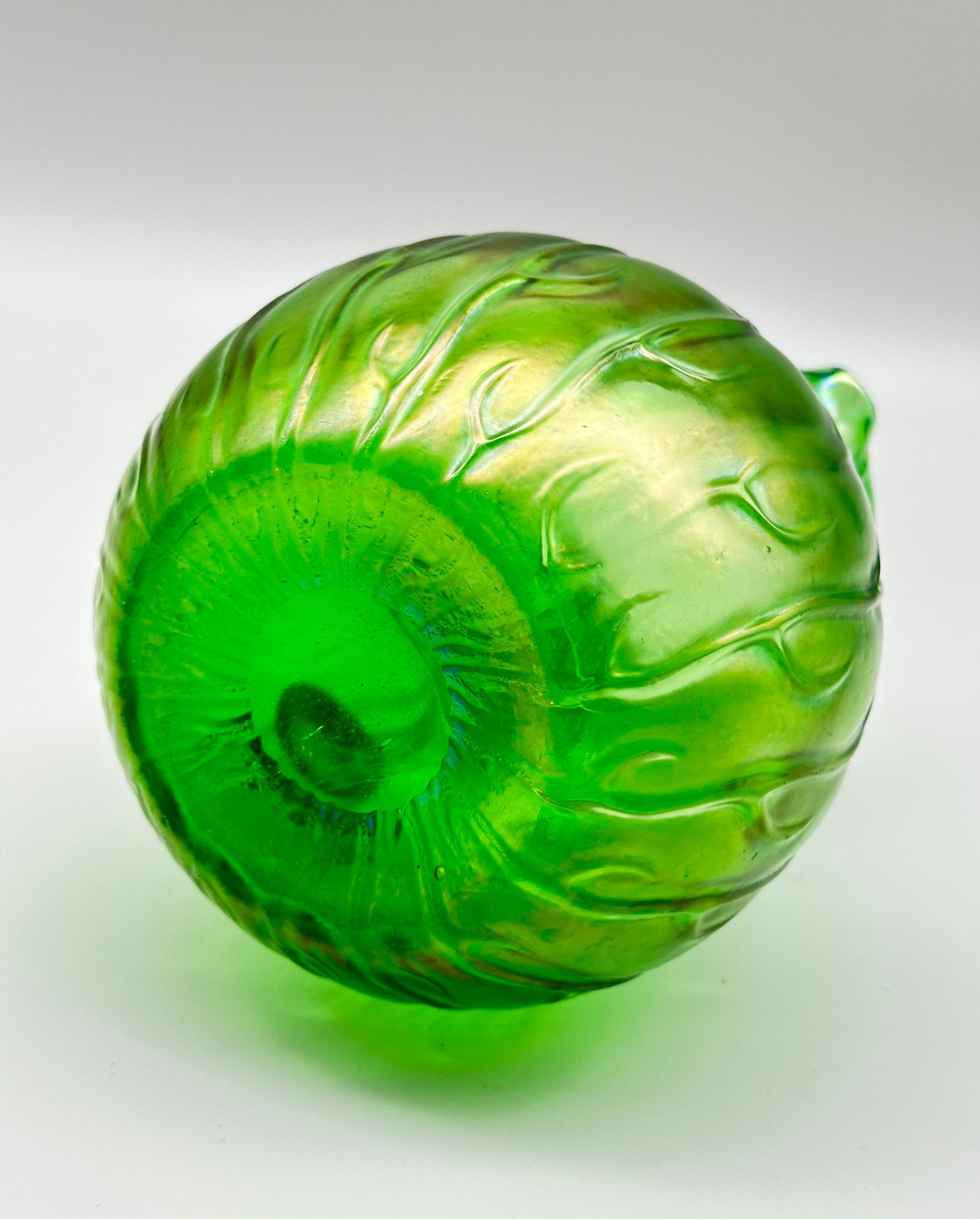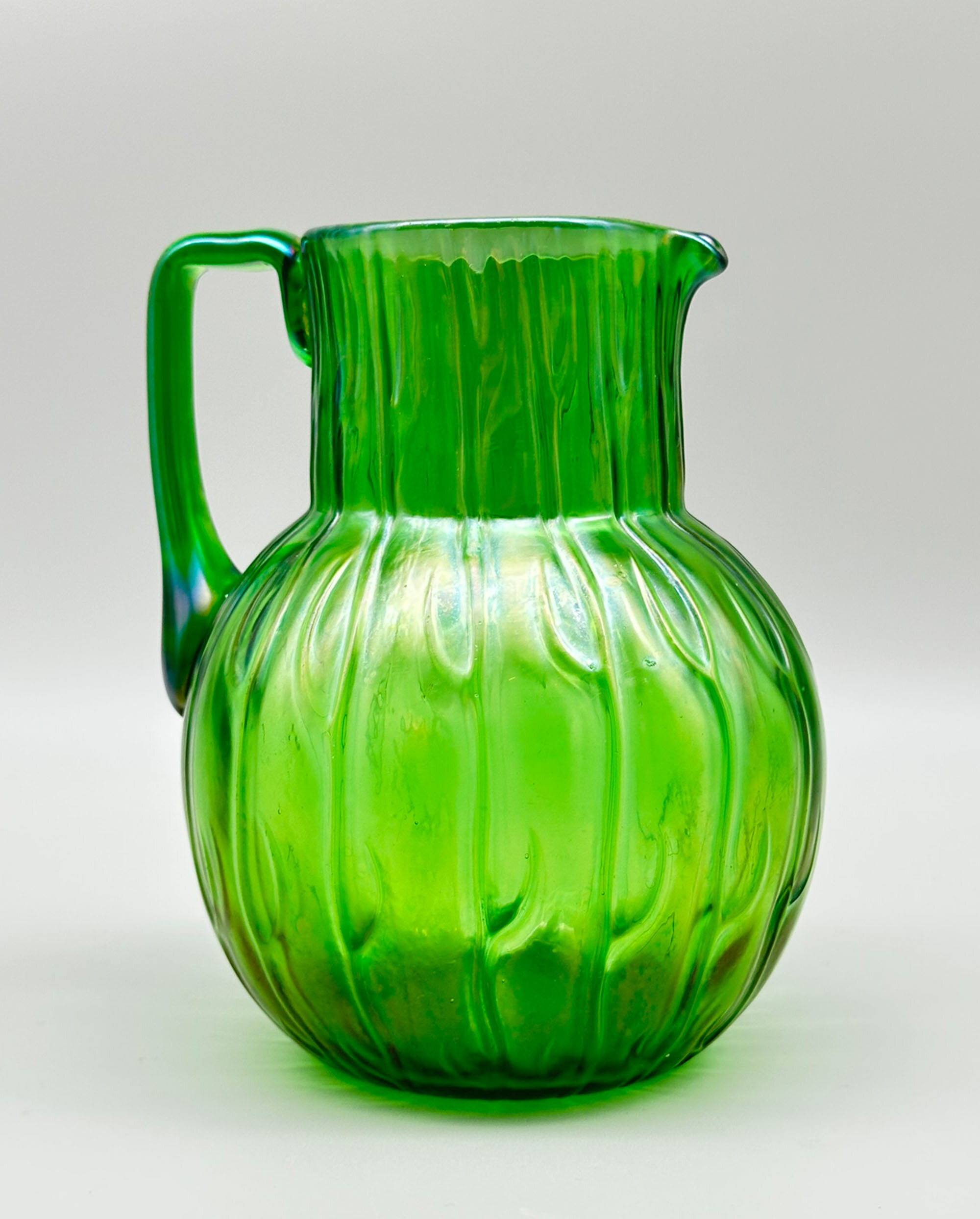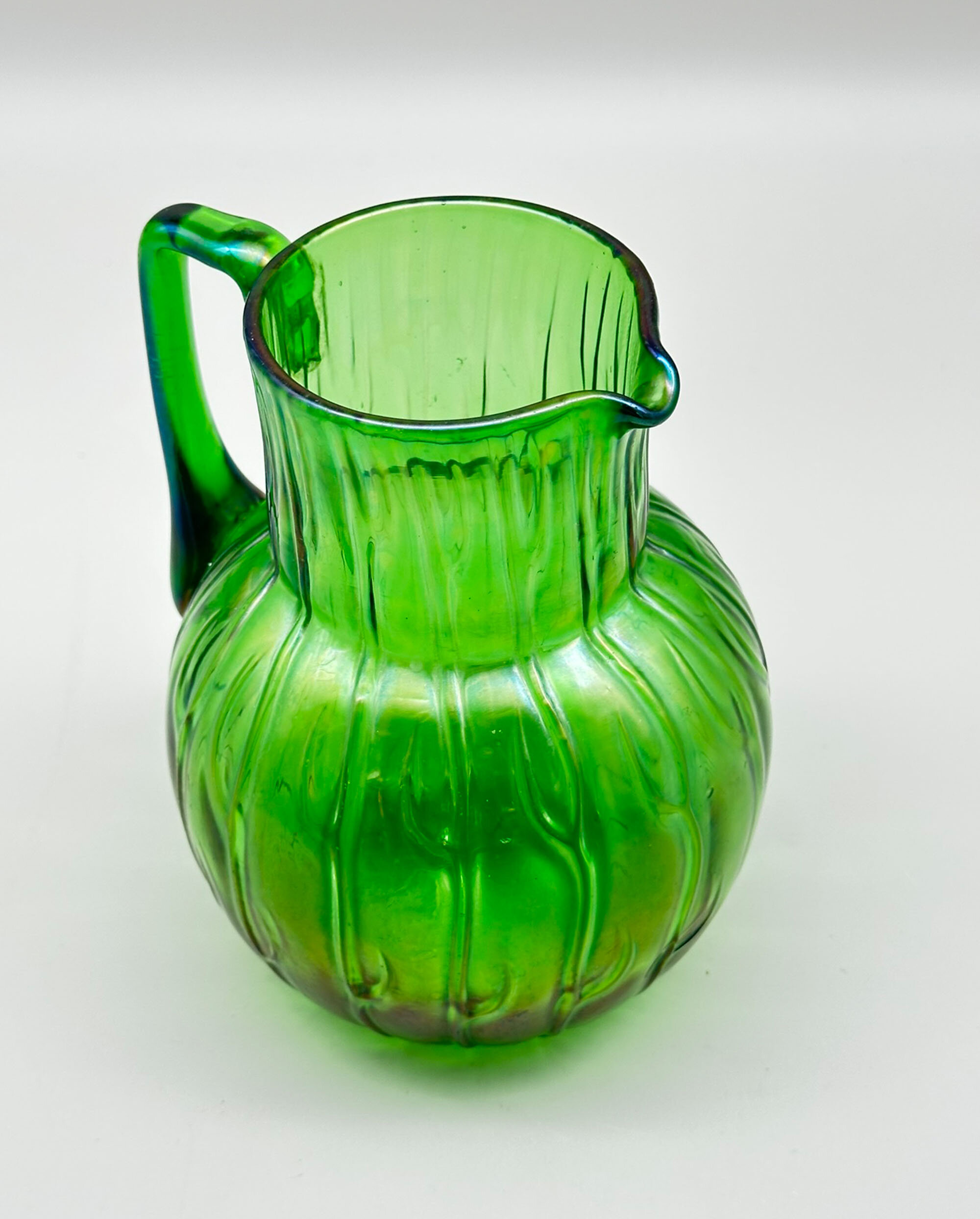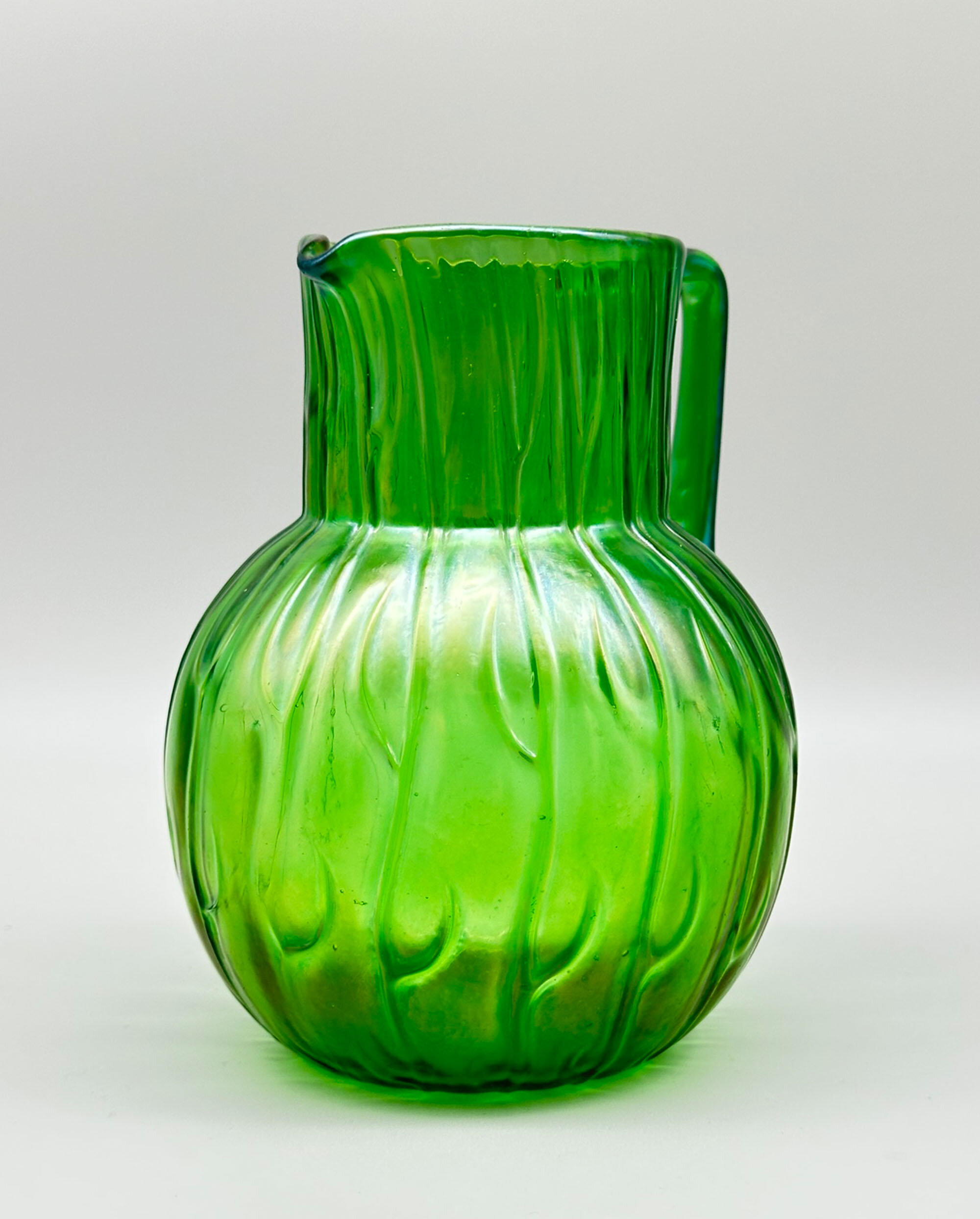 An iridescent green glass jug of plain form, the globular body below a wide cylindrical neck with a short curved spout and opposite an angular loop handle, the whole with a modelled design of repeating stylised leaf forms, often held to be seaweed. This well known design is from the ‘Neptun’ range produced by the celebrated Bohemian glassmakers, Loetz. A variety of shapes were produced of which this small pitcher is perhaps the most pleasing. The pattern was first produced in 1903 and this jug doubtless dates to the early years of the twentieth century.The Loetz glass factory has its origins in the nineteenth century, when the widow of Johann Lötz, Susanna, remarried after his death in 1844 and with her new husband bought in 1851 the glassworks firm Klastersky Mlyn which was henceforth named Johann Lötz Witwe (the widow of Johann Lötz). The factory was situated at Klostermühle (Klášterský Mlýn, now part of Rejštejn) in southwestern Bohemia, Austria-Hungary and then Czechoslovakia. Johann’s grandson, Max Ritter von Spaun took over the business from his grandmother in 1879 and continued to run it under the old company name, ‘Joh. Lötz Witwe’, which was later changed to ‘Lötz’ and around 1900 changed again to the anglicised version of this ‘Loetz’. Around this time, the firm began producing the range of iridescent lustre finish glass in the Art Nouveau style for which they are now so famous. Production continued until the closure of the factory in 1947.