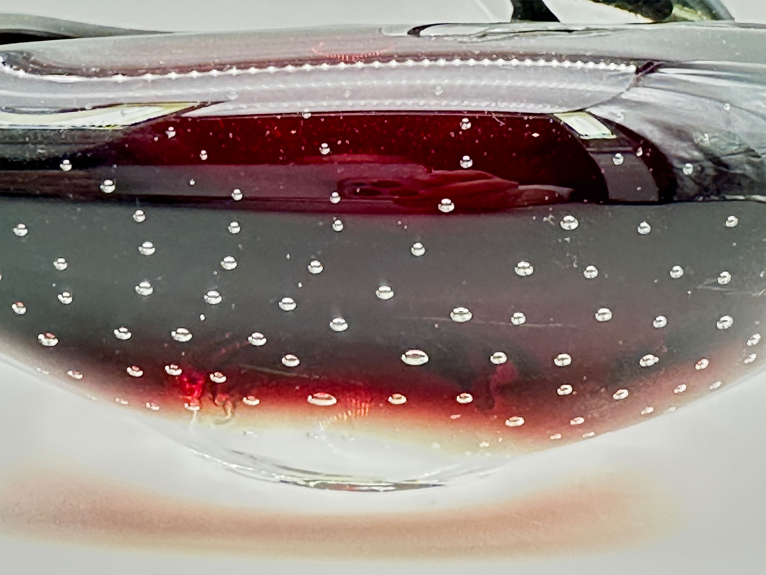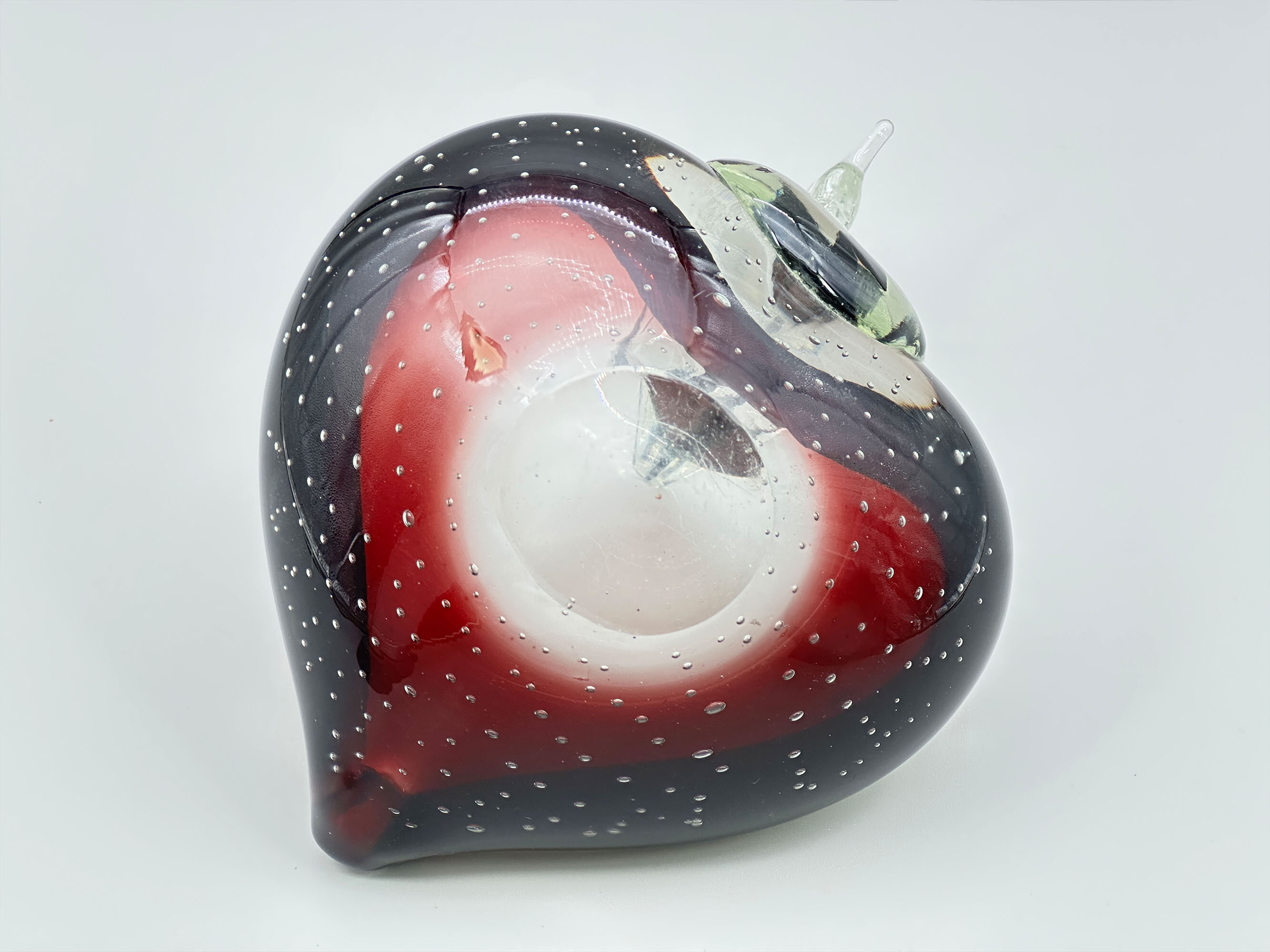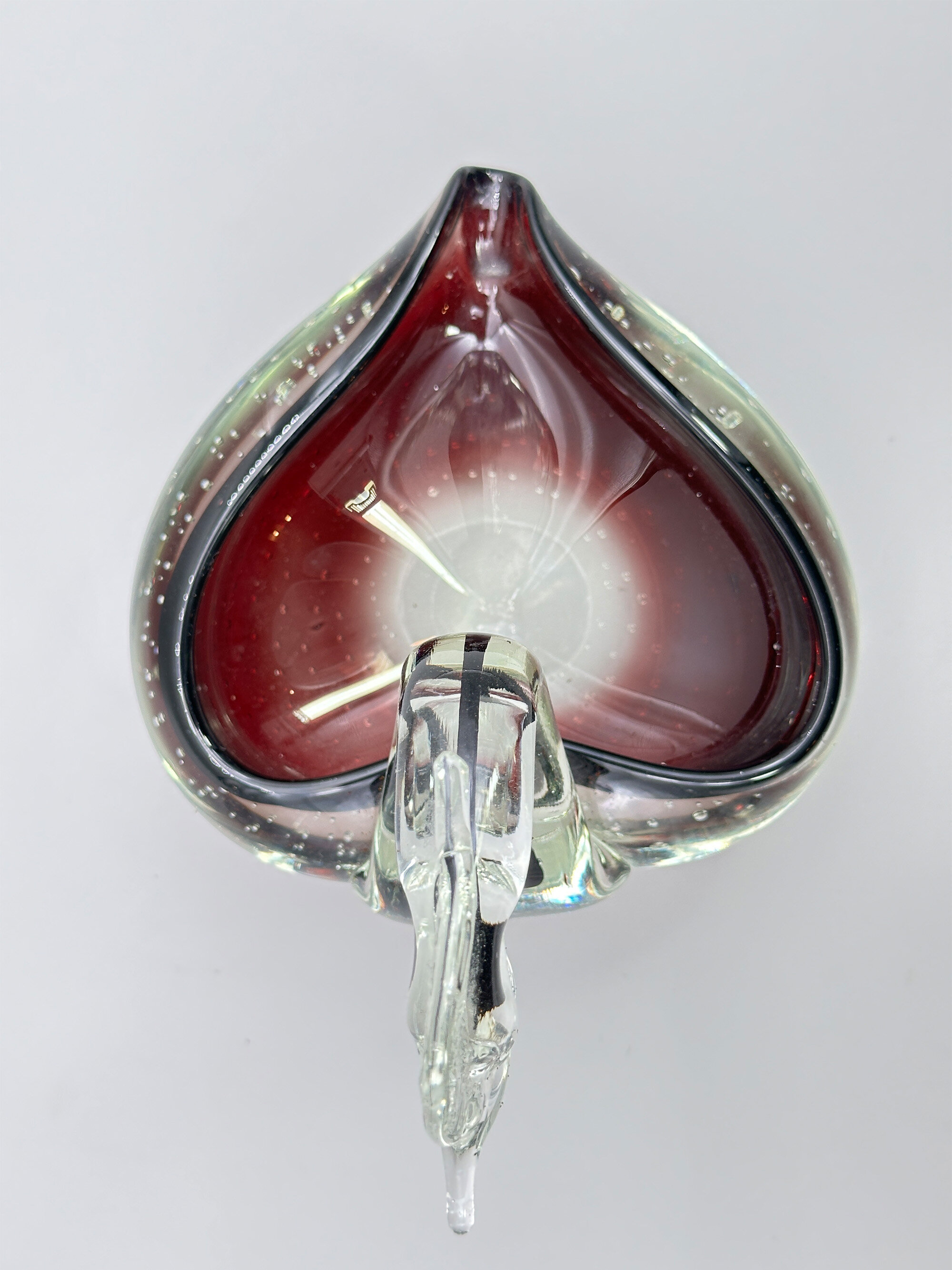 A glass dish in the form of a stylised swan, the heart shape body hollowed out in the centre, the two ‘wings’ with a small lip opening at the rear, the front with a clear glass curved neck and head, a black streak to the interior and the crest and beak modelled, the almost circular base flat, the deep purple glass with trapped bubbles in the ‘bullicante’ effect. ‘Bullicante’ is the Italian word for ‘boiling’ and the process for creating small bubbles encased in the glass surface so named was developed and perfected at Murano during the 1930’s by Archimede Seguso. But its use continued and this swan dish, which bears all the hallmarks of Murano work, probably dates to the 1960s or 1970s. Most likely intended as a trinket dish or possibly an ash tray, it can also be enjoyed as miniature sculpture in itself.| Size: | Width (max) 17.5cm, Ht (max) 14.5cm, Depth (max) 13.5cm, Base (irregular) 4/4.5cm |