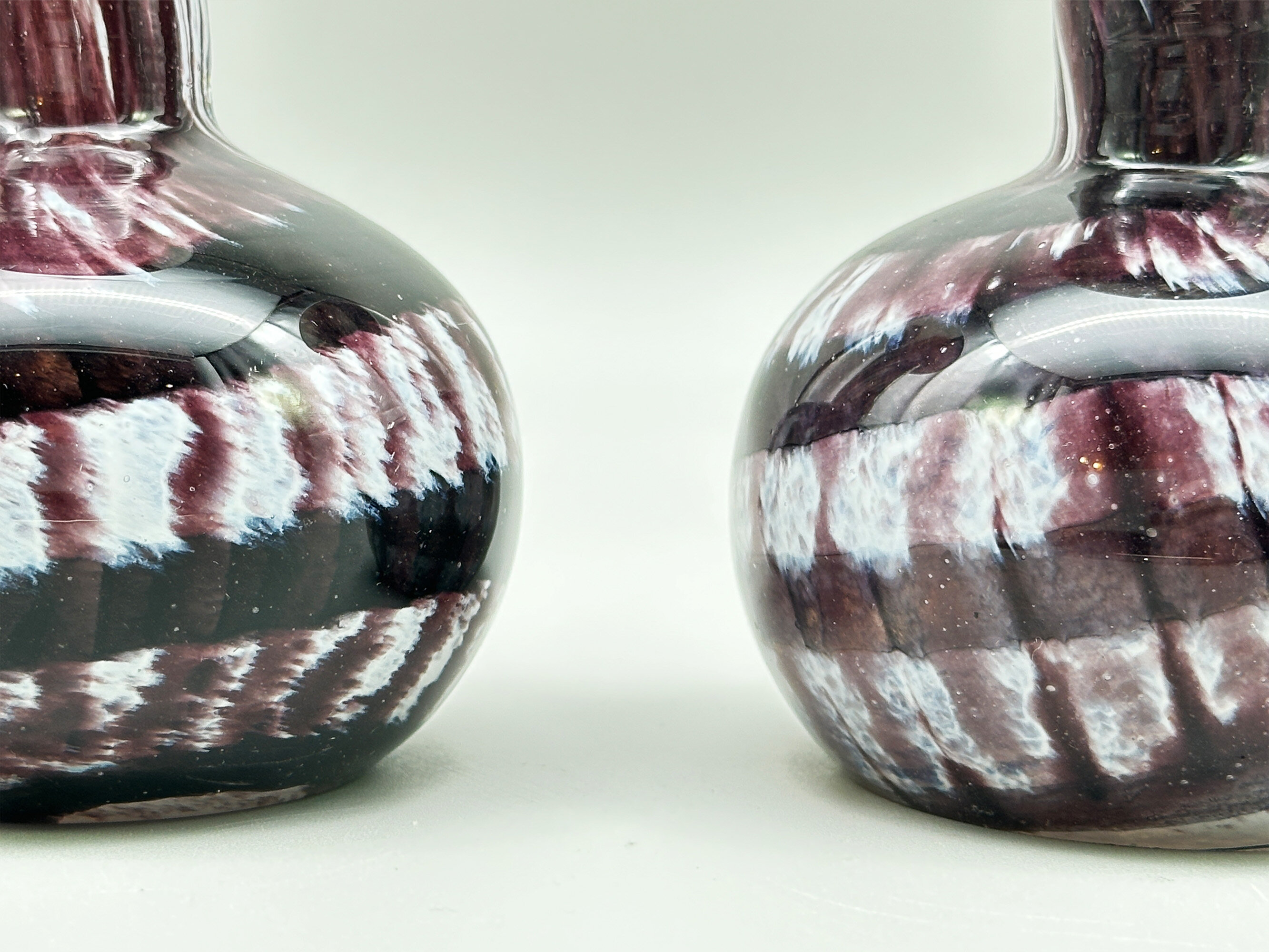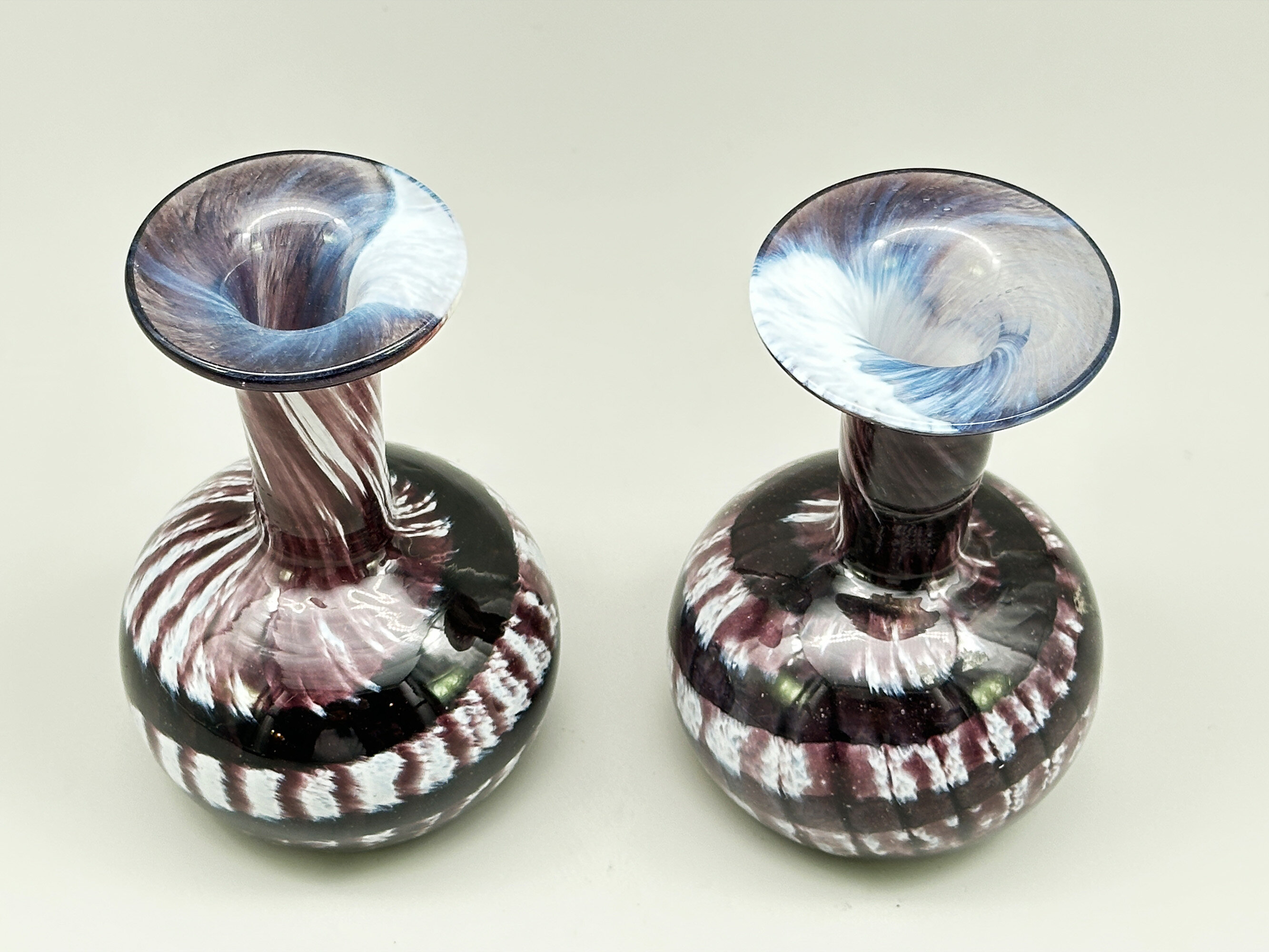 Closely resembling the work of the Mdina studio, this pair of vases derive from another of Malta’s glassworks, Mtarfa. Founded in 1979 by Paul Said, the brother of Joseph Said who was at the time the owner of Mdina Glass, the studio produced pieces which were similar in both form and decoration to those made by its more famous rival. Indeed, both brothers were originally trained by Michael Harris, the founder of Mdina Glass, where they both worked. As with the Mdina pieces the glassmakers at Mtarfa took their inspiration from the colourings of the sea and landscape of the Mediterranean which surrounded them. The form here was distinctive to them though, a bottle shape with a squat globular body below a narrow cylindrical neck with a broad flat top rim. The purple and white glass is in a distinctive ‘pulled feather’ design with broad swirling bands to the body and narrow ones to the neck. The signature on one can be made out (with a little imagination) as reading ‘Mtarfa’ and is very similar to other signatures, equally slightly indistinct, found on other pieces which also bear the Mtarfa paper label confirming the identification. This pair of vases was almost certainly made in the 1980s or early 1990s before the rebranding of the firm as ‘Valletta Glass’ which still produces pieces today.| Size: | Left : Ht 13.8cm, Top diam 6.1cm, Width (max) 8.5cm, Base 6cm Right : Ht 13cm, Top diam 6.7cm, Width (max) 8.5cm, Base 6.5cm |