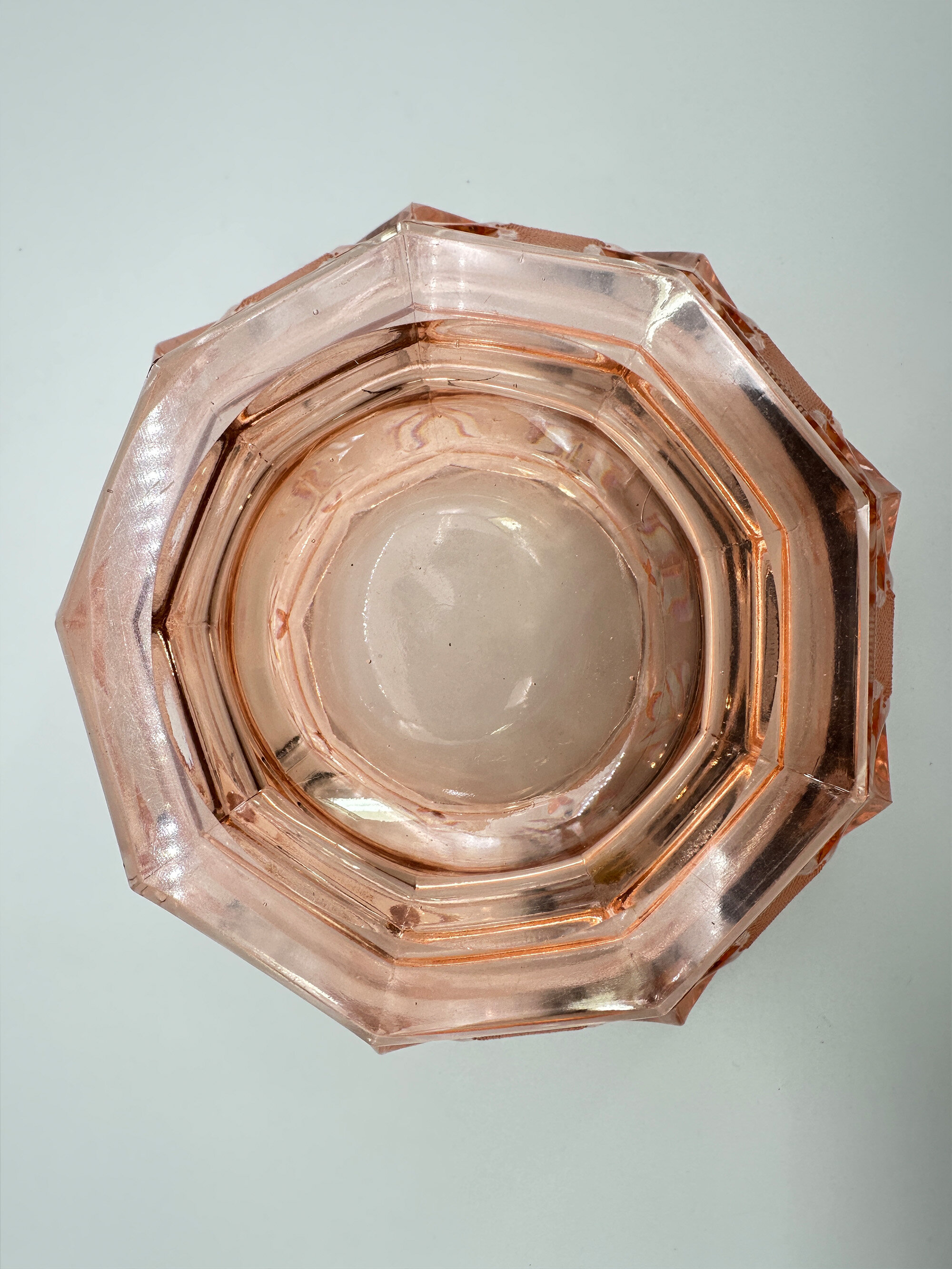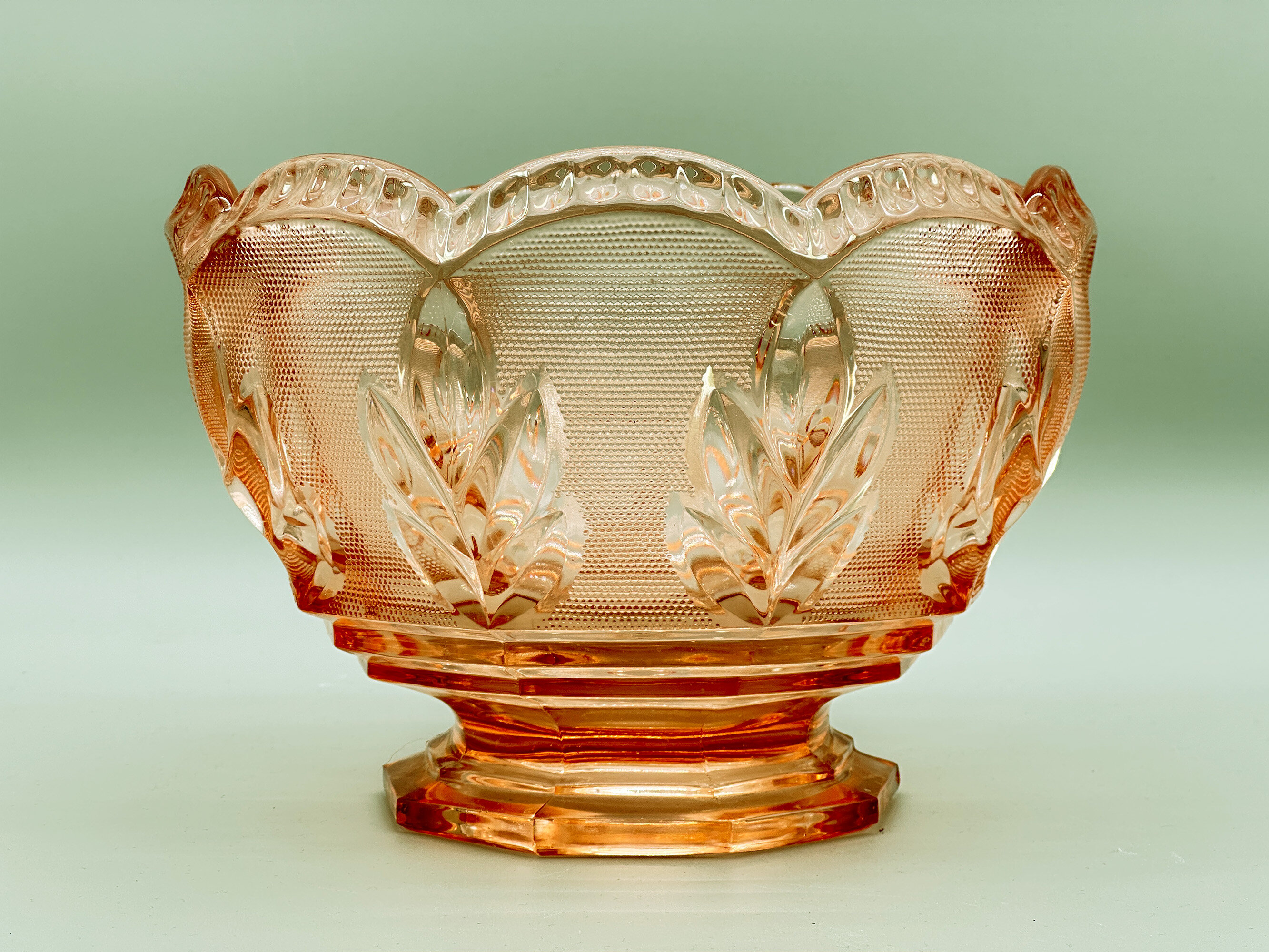 A pressed glass bowl of rounded octagonal form with a stepped concave foot and a wavy edge rim, the peach colour glass with a design of repeating leaves on a micro dot ground, the rim with rope twist edging. The design, pattern and technique here all point to the German manufacturer Walther & Söhne, or more correctly August Walther & Söhne AG, founded by August Walther in 1888. In 1932, the firm merged with Saxonian glass and began producing a wide range of Art Deco inspired pieces including centrepieces, figurines, bowls and vases. After the war, the firm was nationalised and was renamed VEB Sachsenglas, continuing production of its Art Deco designs until its closure in 1990. This bowl comes from the ‘Wilhelm’ range which was made in a variety of shapes and colours including green ‘uranium’ glass. The Art Deco influence is clear, particularly in the clean lines of the stepped foot. Dating is most likely to the 1930s, but, as indicated above, this model may also have continued in production been produced in the years following.| Size: | Ht (max) 15.5cm, Top diam (max) 22cm, Base (max) 12.5cm |