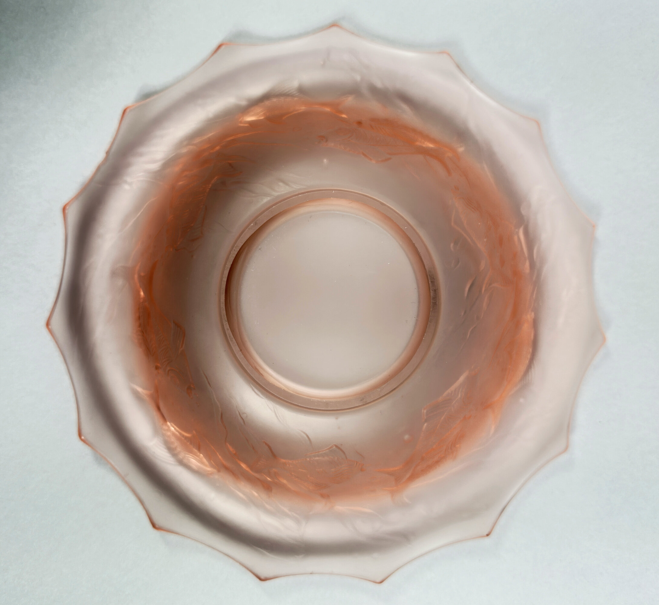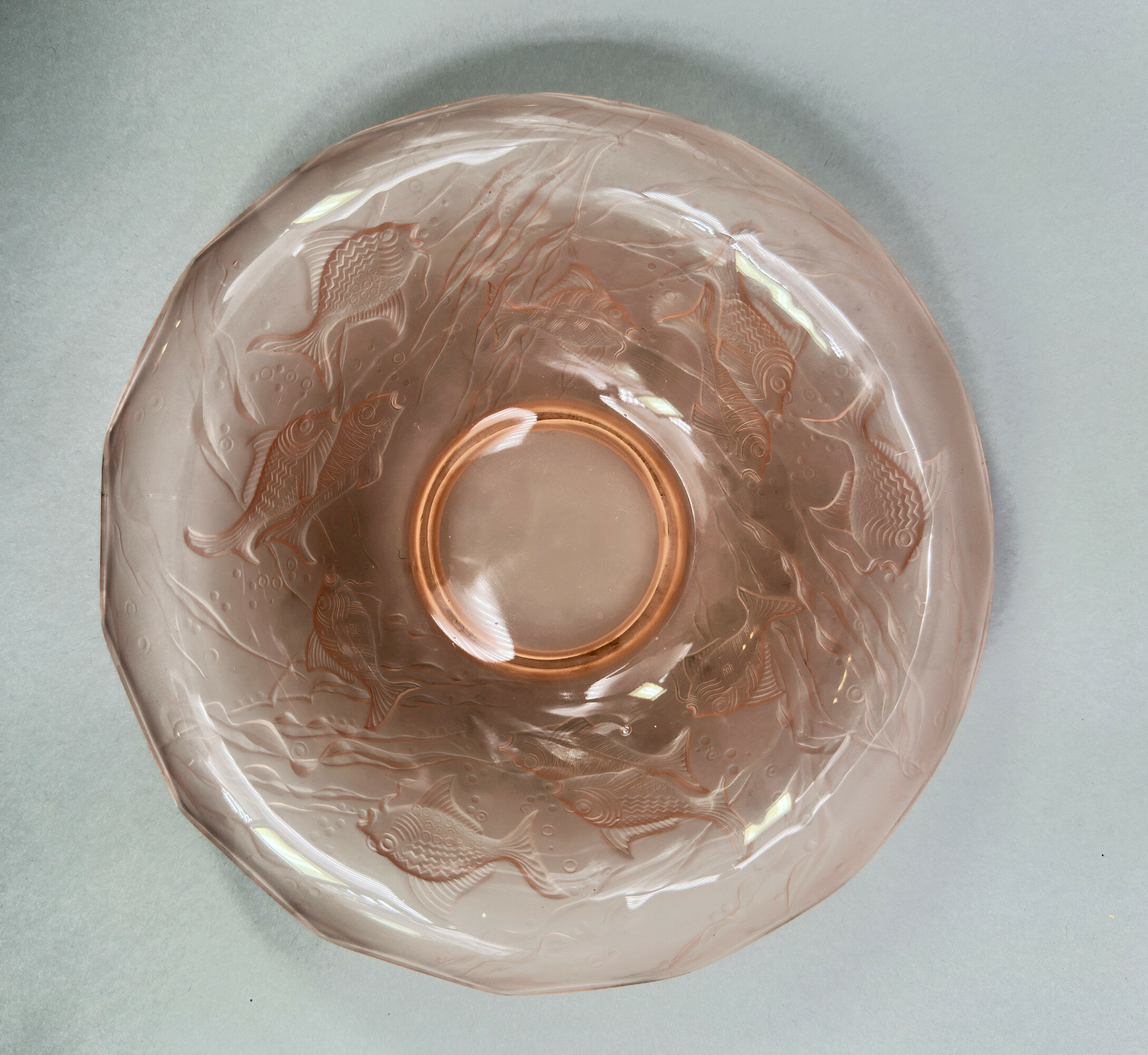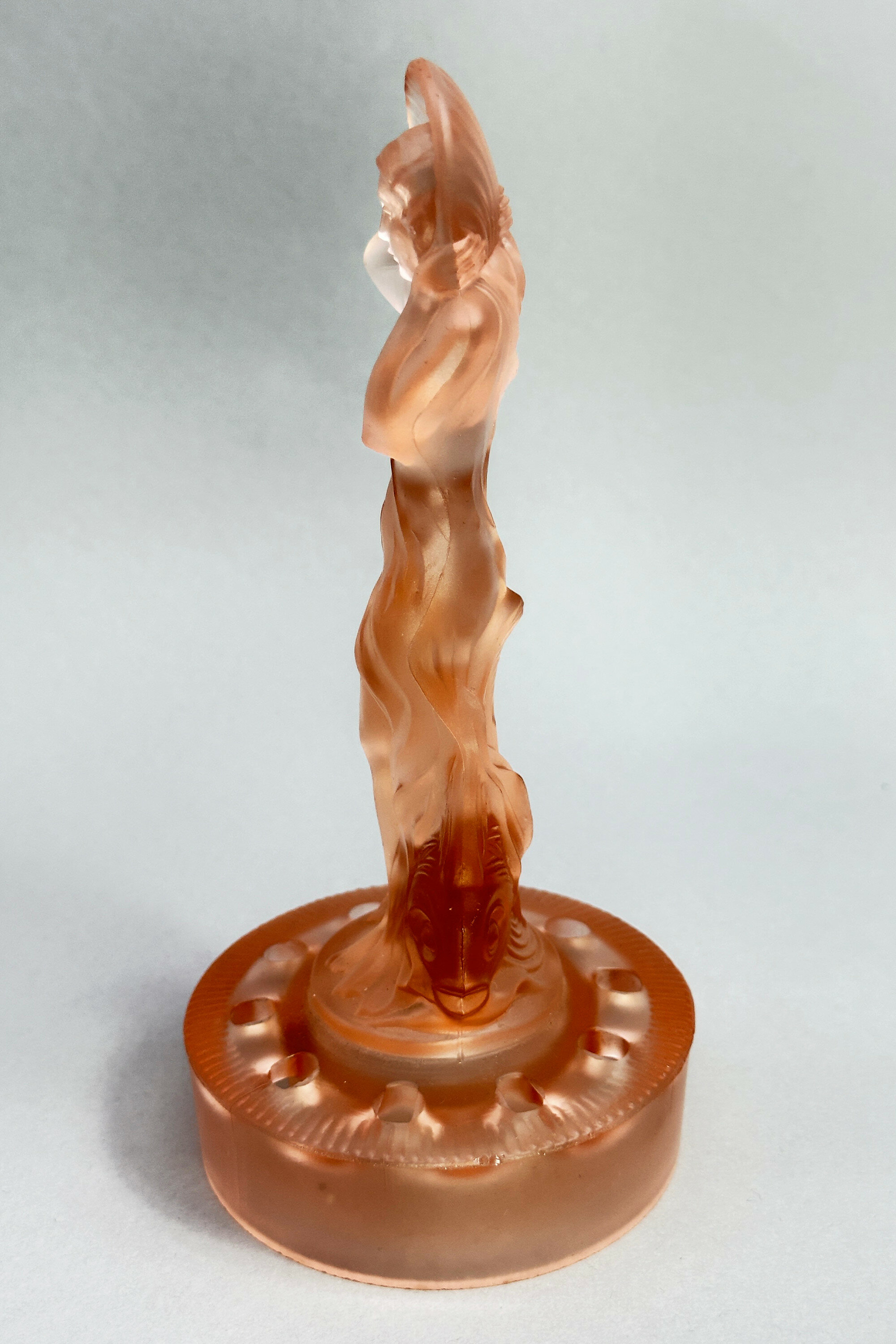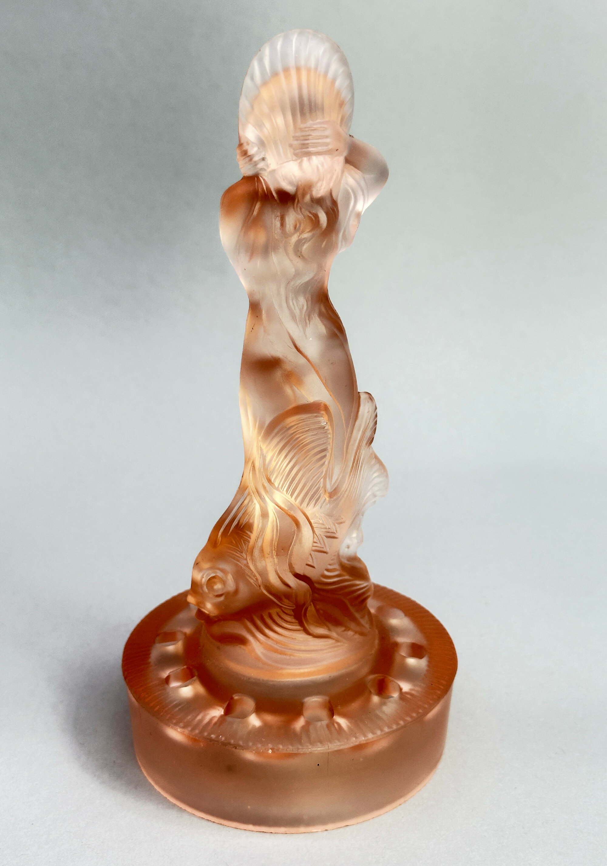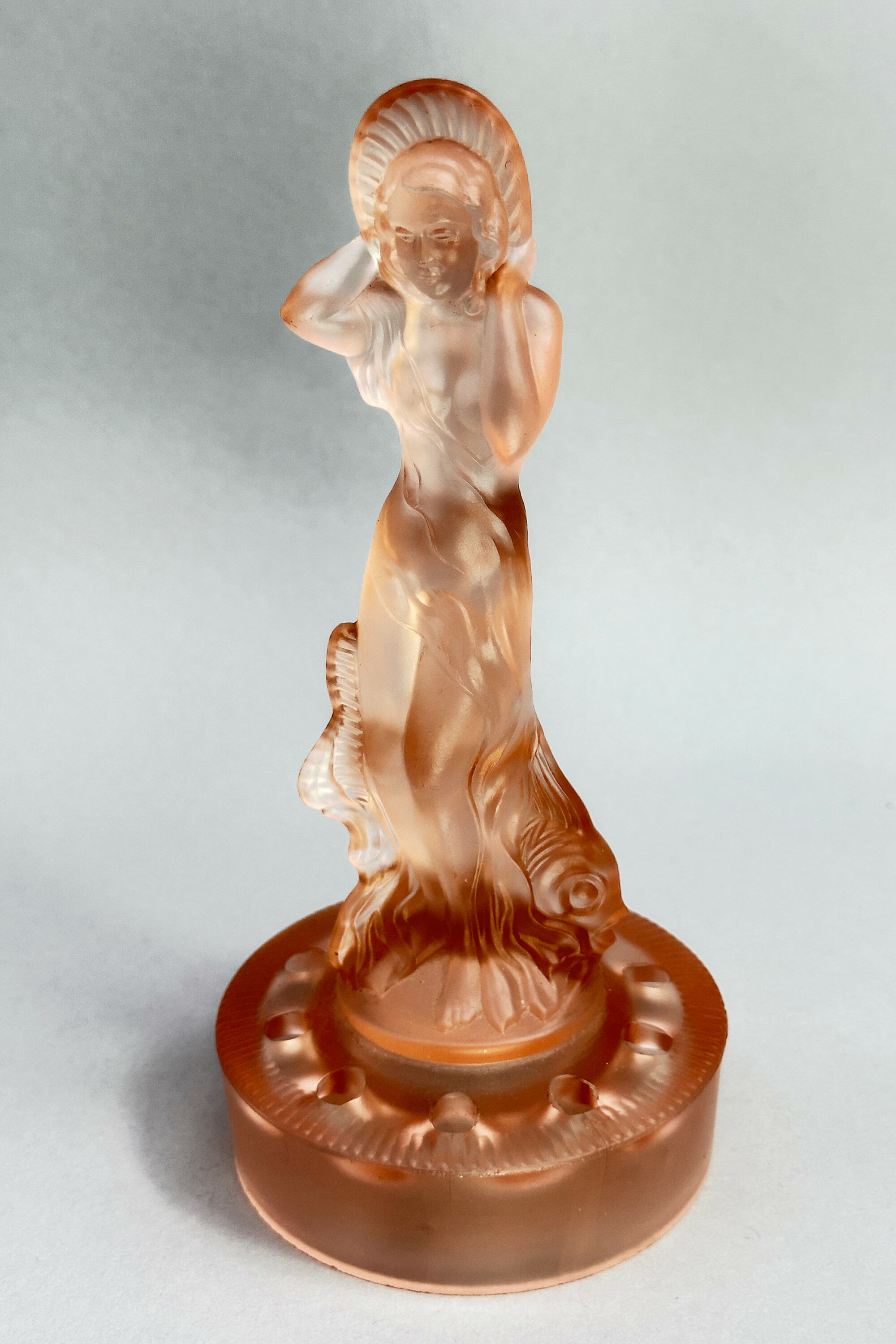 A centrepiece set formed from frosted and clear pink glass comprising a figure of a lady, semi nude, her flowing drapery exposed to reveal her body, a dolphin at her rear and a pierced circular base below to act as a ‘frog’ or flower holder together with a scalloped edge dish with pointed corners and a turnover rim with pressed decoration of fish and waves.The influence of Art Deco style of this piece is clear and it does indeed date to the 1930s. The model, termed ‘Arabella’ can apparently be seen in the 1934 catalogue of the German glass manufacturers Walther and Sohne, founded by August Walther in 1888 at Ottendorf-Akrilla near Dresden. In the 1930s the firm was famous for its Art Deco designs and also produced a version of ‘cloud glass’ which at one time was held to be exclusive to the English manufacturer Davidson. But some of the English glass makers also drew on their German rival’s work such that Walther and Sohne patented some of their designs in the UK in 1937, presumably to protect their work. This centrepiece set is a classic example of Walther and Sohne’s pre war productions and a distinctive example of Art Deco glassware.