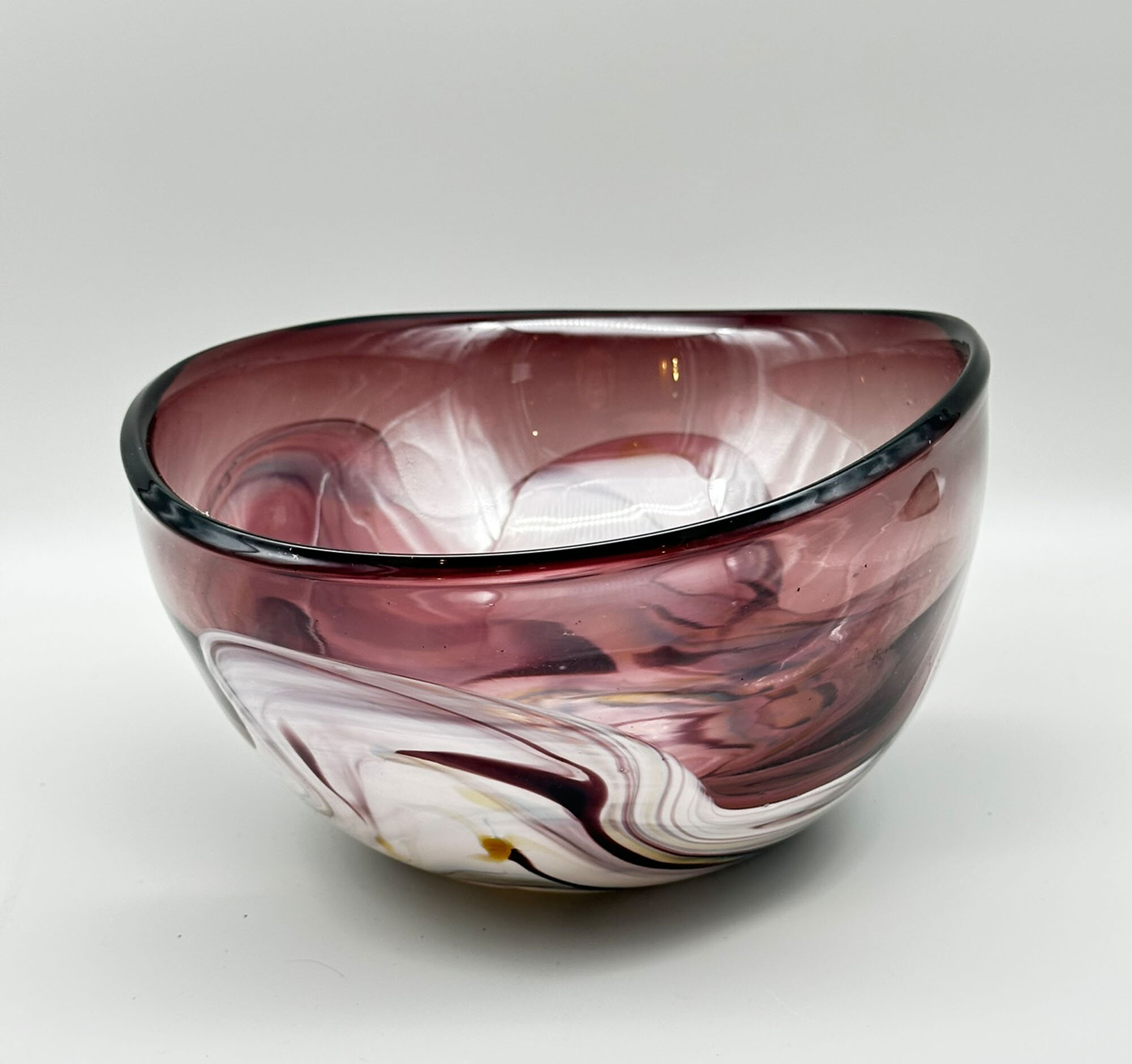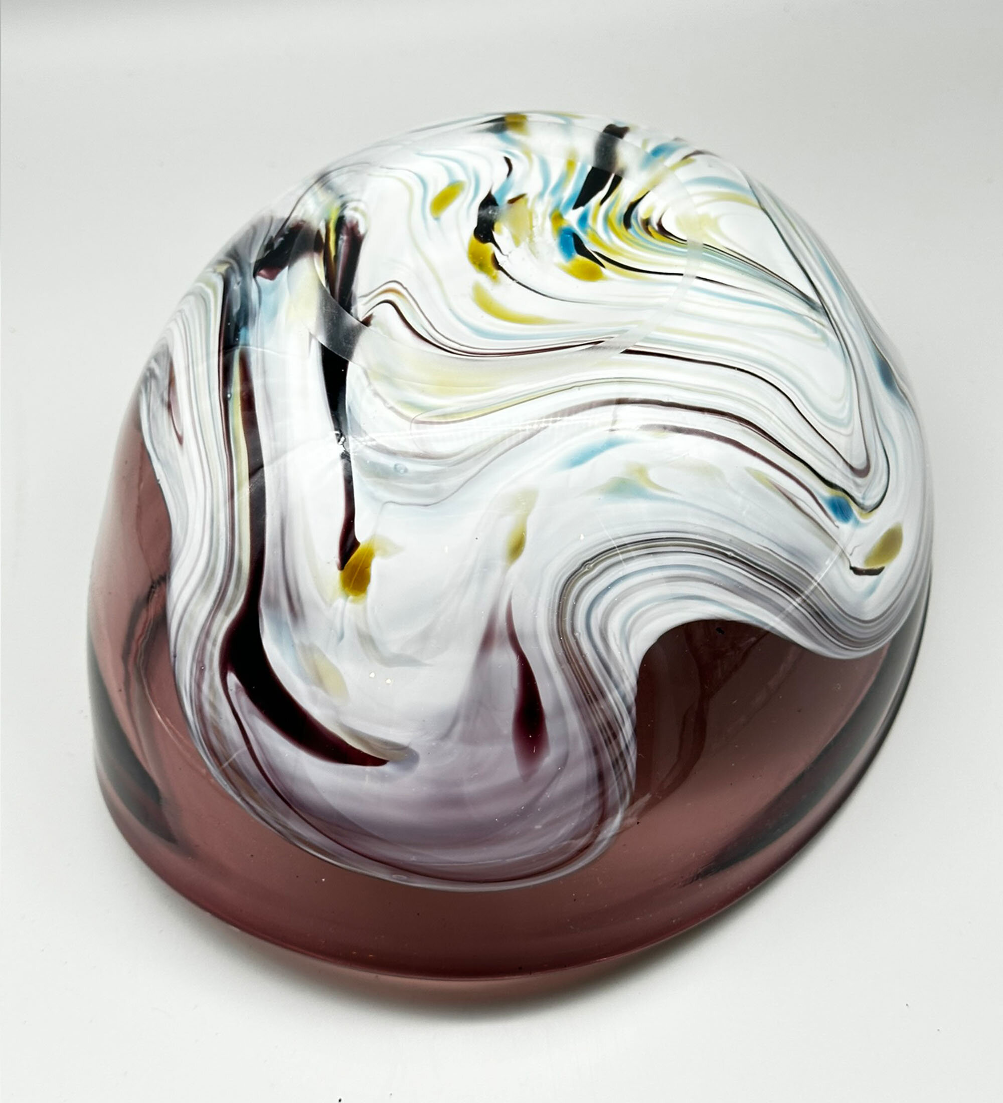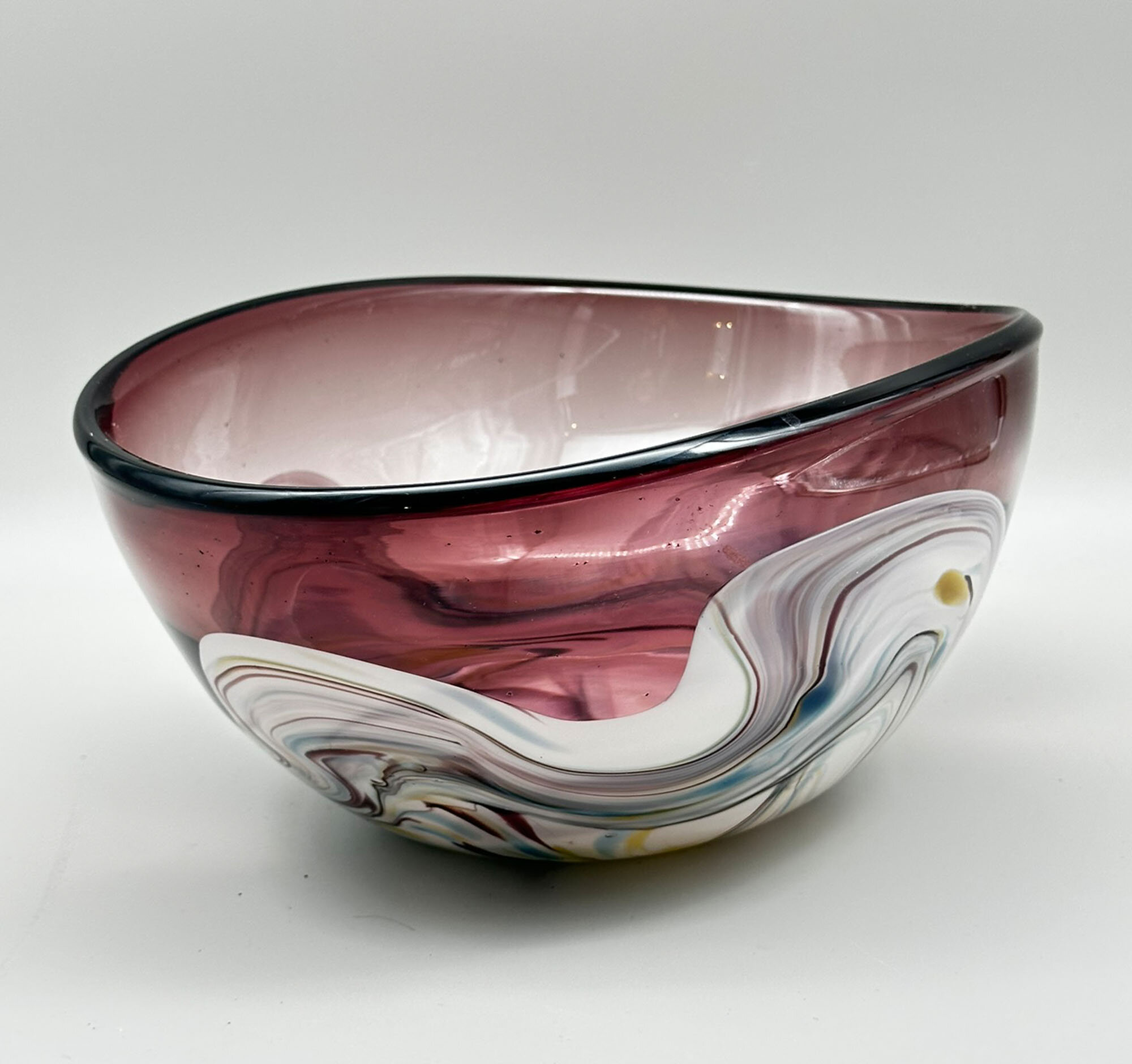 This is an unusual glass bowl of irregular ovoid form, the purple glass thickening at the rim and merging with a polychrome streaked wavy design at the base. There are no exact parallels for this bowl although it clearly required considerable skill in its construction. Slightly similar designs can be seen in a series of bowls, ‘Contrast’, designed by Anna Ehrner for Kosta Boda, and slightly similar shapes in the ‘folded’ bowls made at Murano; indeed the streaked wave design is also very similar to effects found in Murano pieces. While neither of these are close matches, an Italian provenance seems the most likely but perhaps not one of the Murano workshops. More research is needed but for the time being this interesting bowl well deserves to be enjoyed on its own merits.| Size: | Width (max) 27.5cm, Depth (max) 21.5cm, Ht (max) 12.5cm, Base (oval) 10.7cm x 10cm |