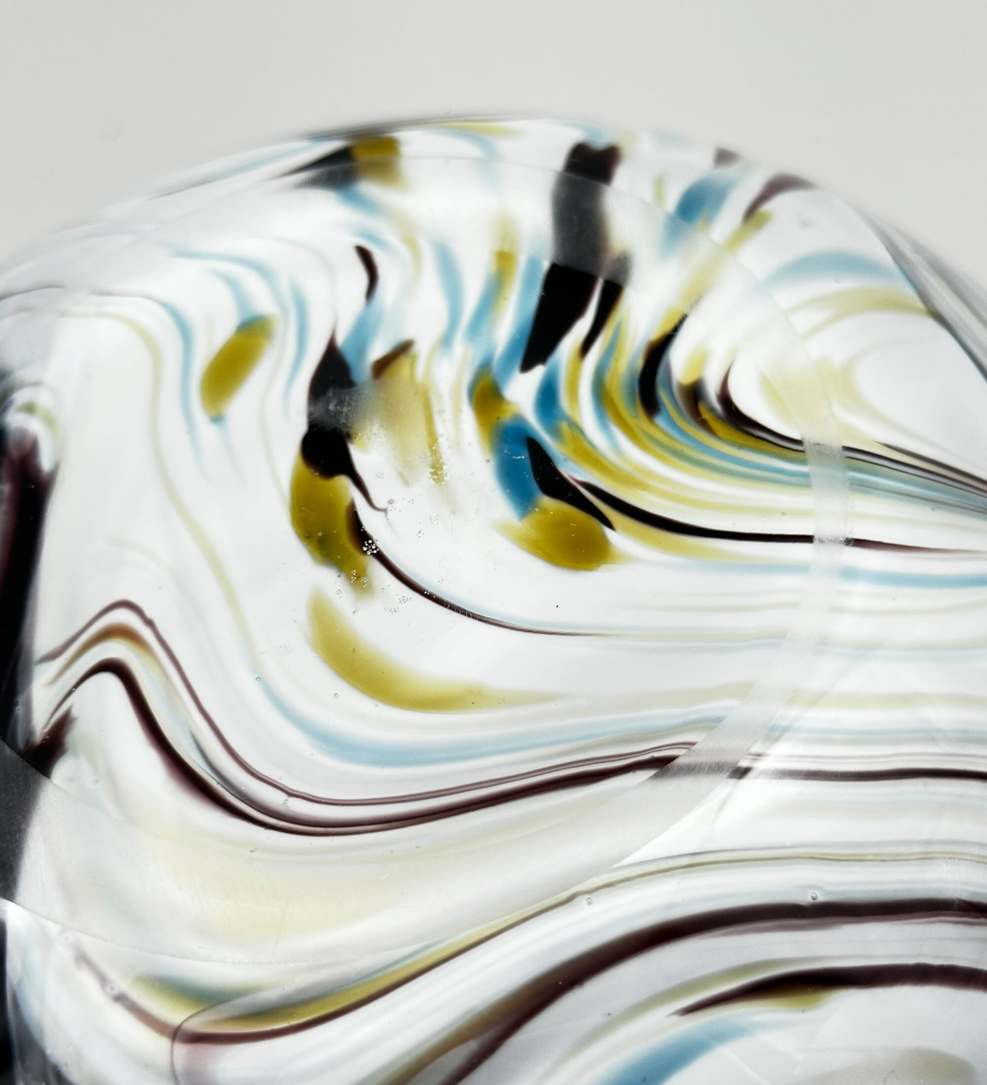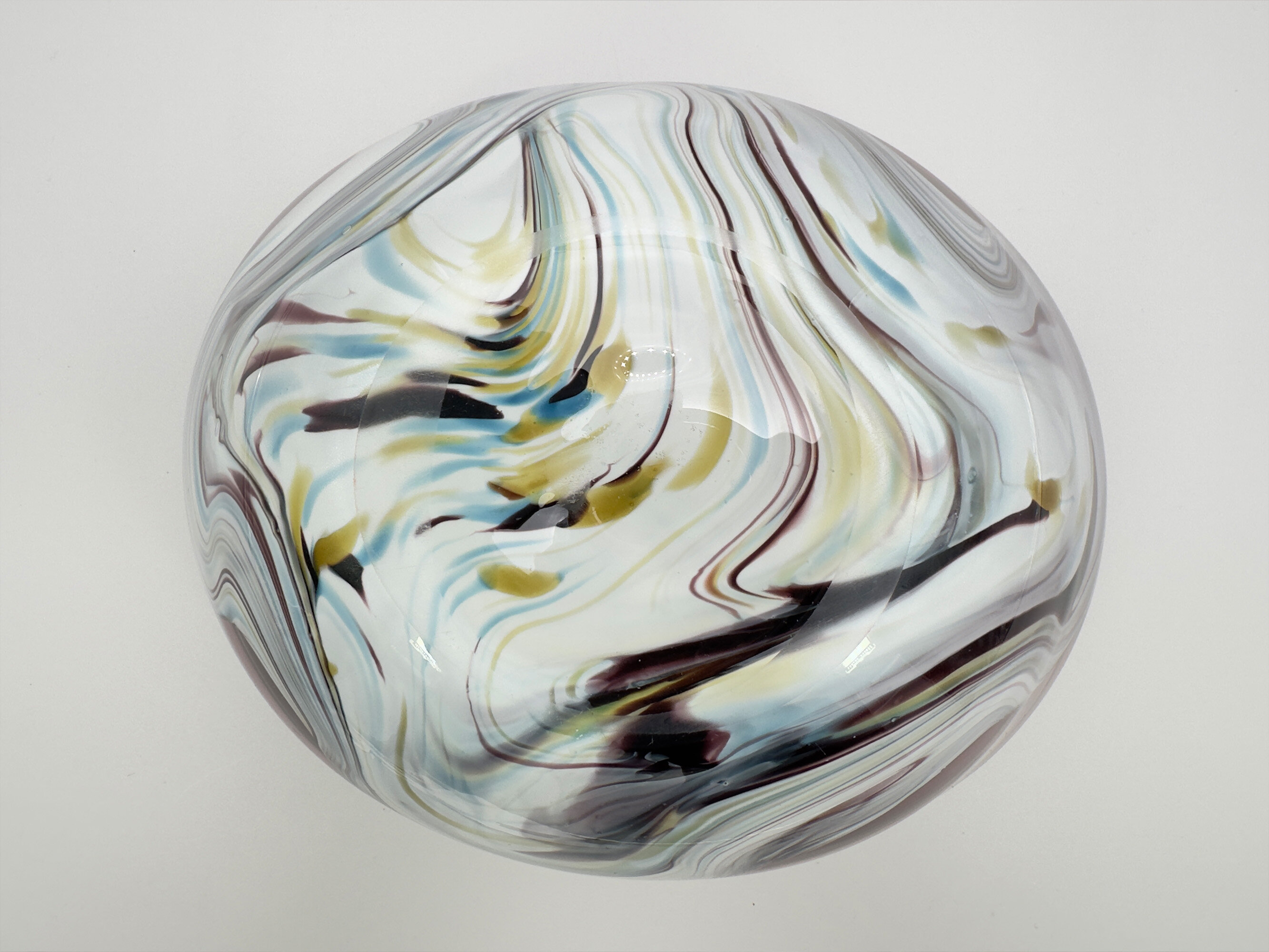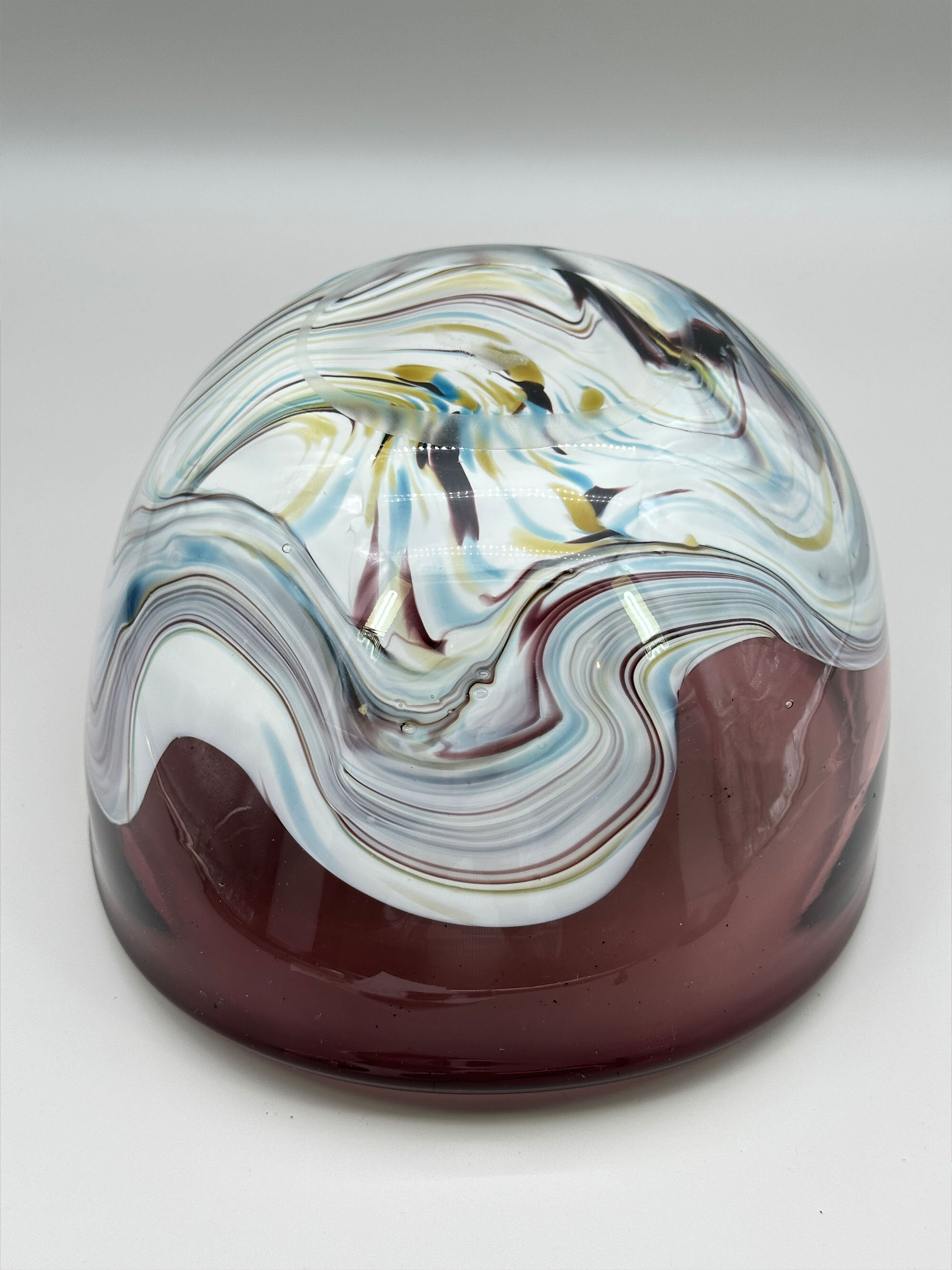 This is an unusual glass bowl of irregular ovoid form, the purple glass thickening at the rim and merging with a polychrome streaked wavy design at the base. There are no exact parallels for this bowl although it clearly required considerable skill in its construction. Slightly similar designs can be seen in a series of bowls, ‘Contrast’, designed by Anna Ehrner for Kosta Boda, and slightly similar shapes in the ‘folded’ bowls made at Murano; indeed the streaked wave design is also very similar to effects found in Murano pieces. While neither of these are close matches, an Italian provenance seems the most likely but perhaps not one of the Murano workshops. More research is needed but for the time being this interesting bowl well deserves to be enjoyed on its own merits.| Size: | Width (max) 27.5cm, Depth (max) 21.5cm, Ht (max) 12.5cm, Base (oval) 10.7cm x 10cm |