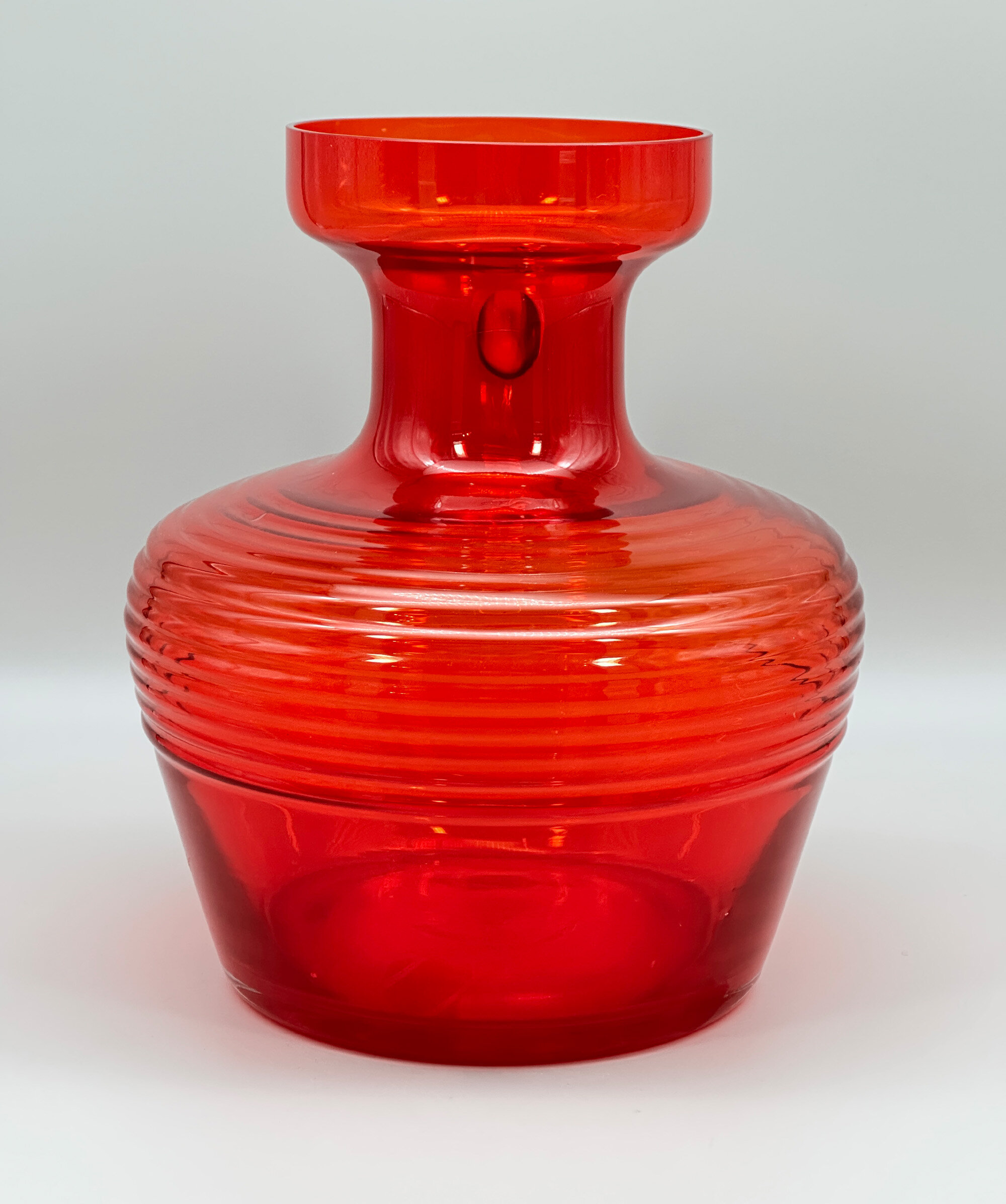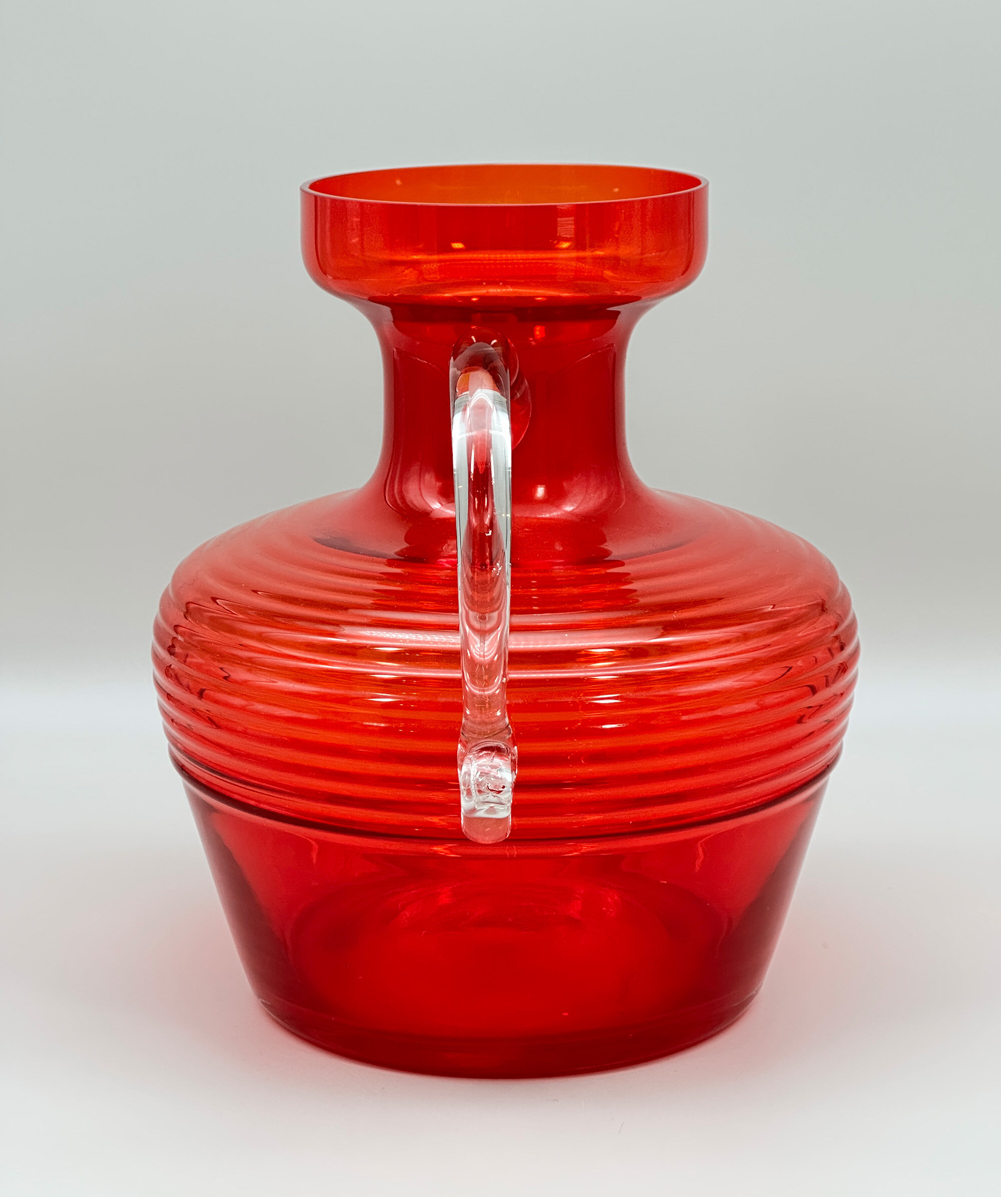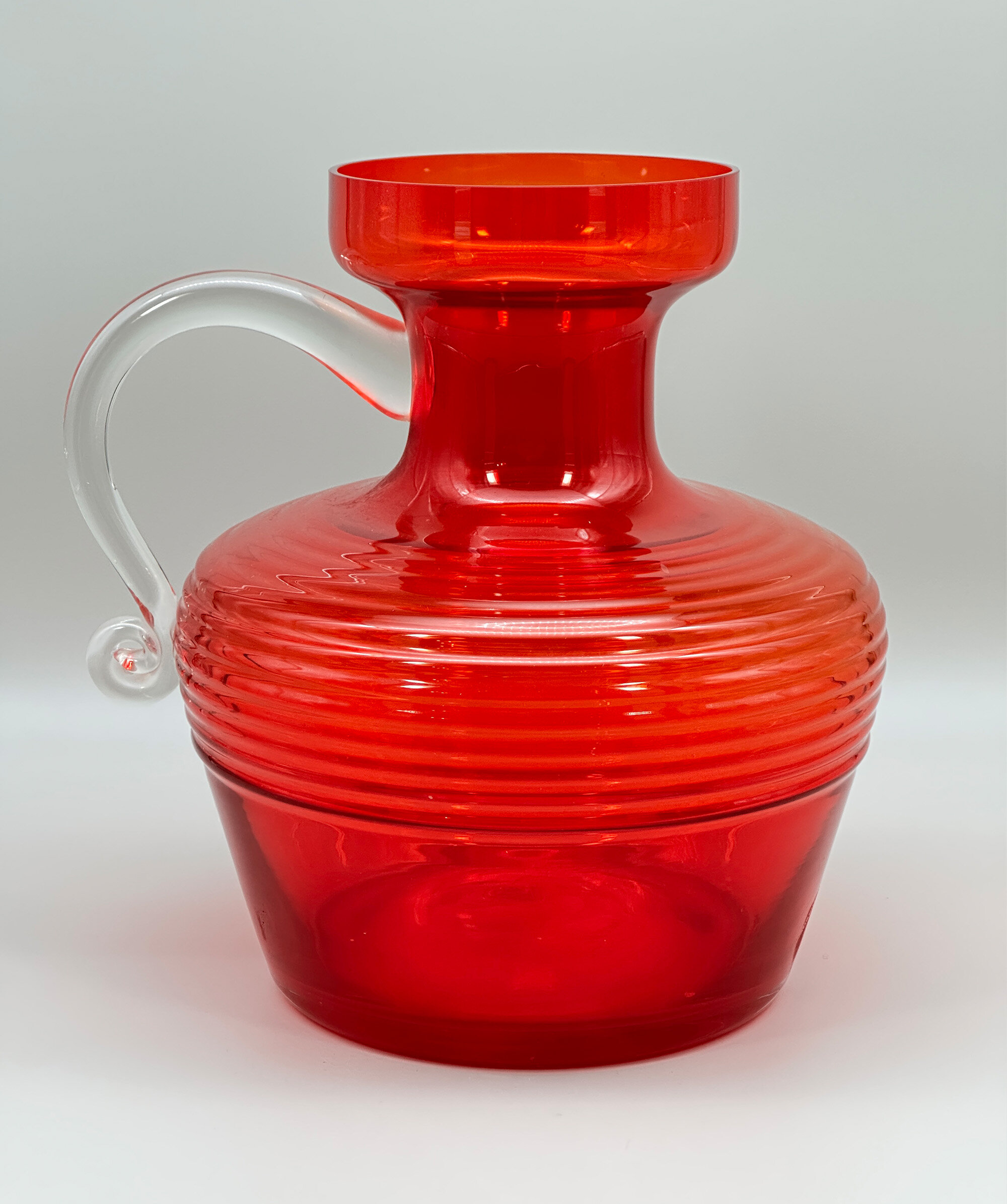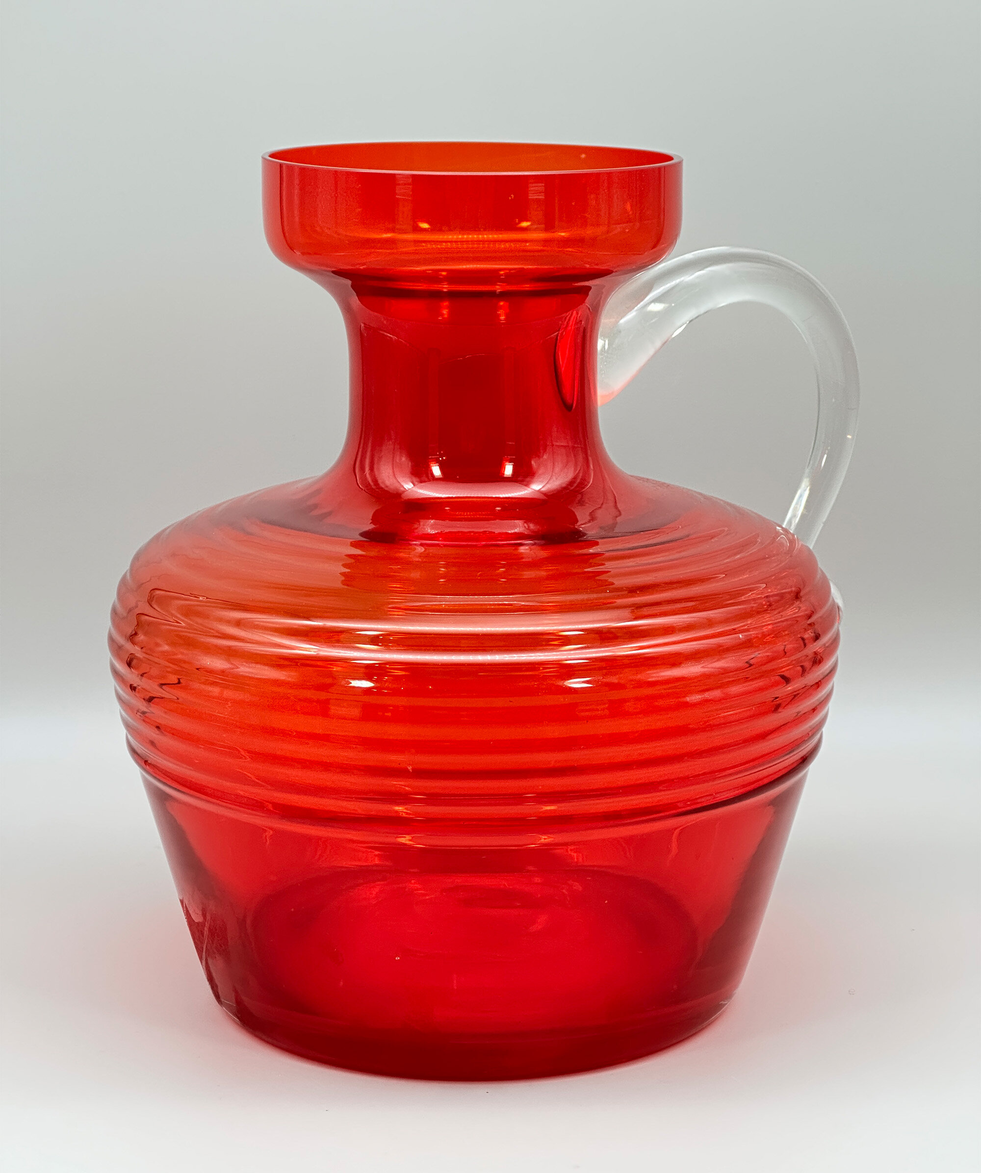 A red glass jug of broad proportions the rounded body tapering inwards towards the base below a concave neck and a galleried rim, the loop handle with a volute terminal and the base slightly countersunk, the clear red glass press moulded with ribbing. This striking design was created for the Finnish glassworks Riihimäen Lasi by Tamara Aladin, one of their prominent designers who worked with them from 1959 to 1976, and formed part of the ‘Cleopatra’ range which was produced from 1970 to 1976. Riihimäen Lasi had been founded in 1910 at Riihimäki, Finland, by Mikko Aadolf Kolehmainen and Adolf Paavali Kolehmainen and soon grew to become Finland’s largest glass factory and a pioneer in glass design. Their talented designers produced a wide range of inventive pieces which enjoyed enormous popularity but economic pressures in the 1970s caused art glass production to cease in 1976 and eventually the factory closed in 1990. Aladin’s designs live on, though, and this jug is a fine example of her work demonstrating that the techniques of mass production did not inhibit the creation of individual and stylish pieces.| Size: | Ht 24.5cm, Top diam 12cm, Width (max) 23cm, Depth 20cm, Base 15.5cm |