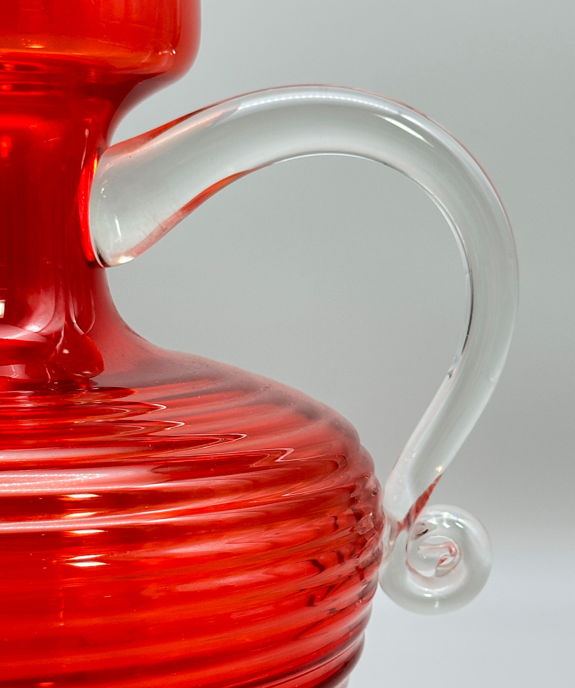 Red glass jug, Cleopatra range, Tamara Aladin for Riihimäen Lasi, Finnish 1970s