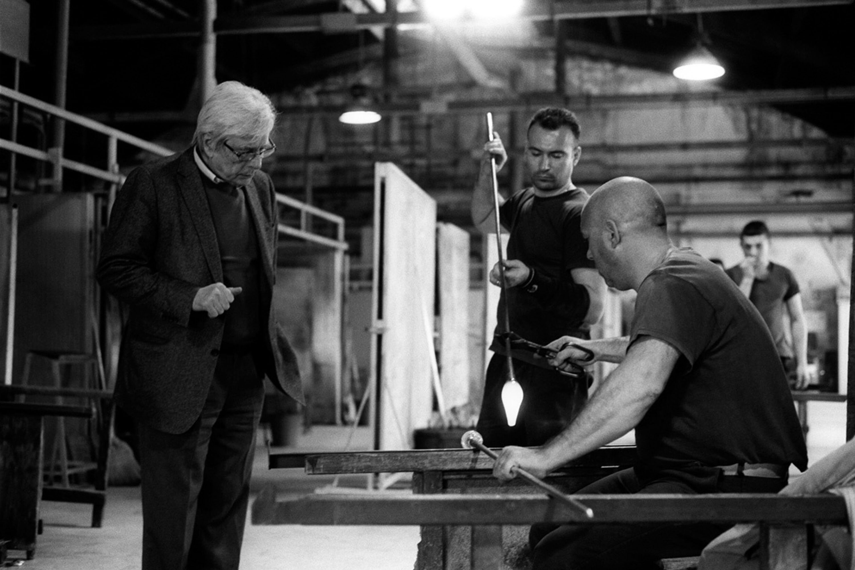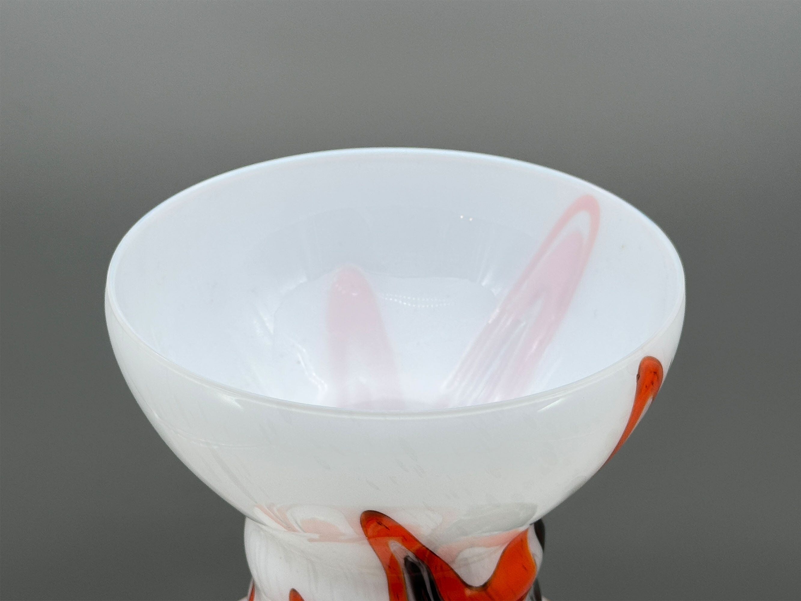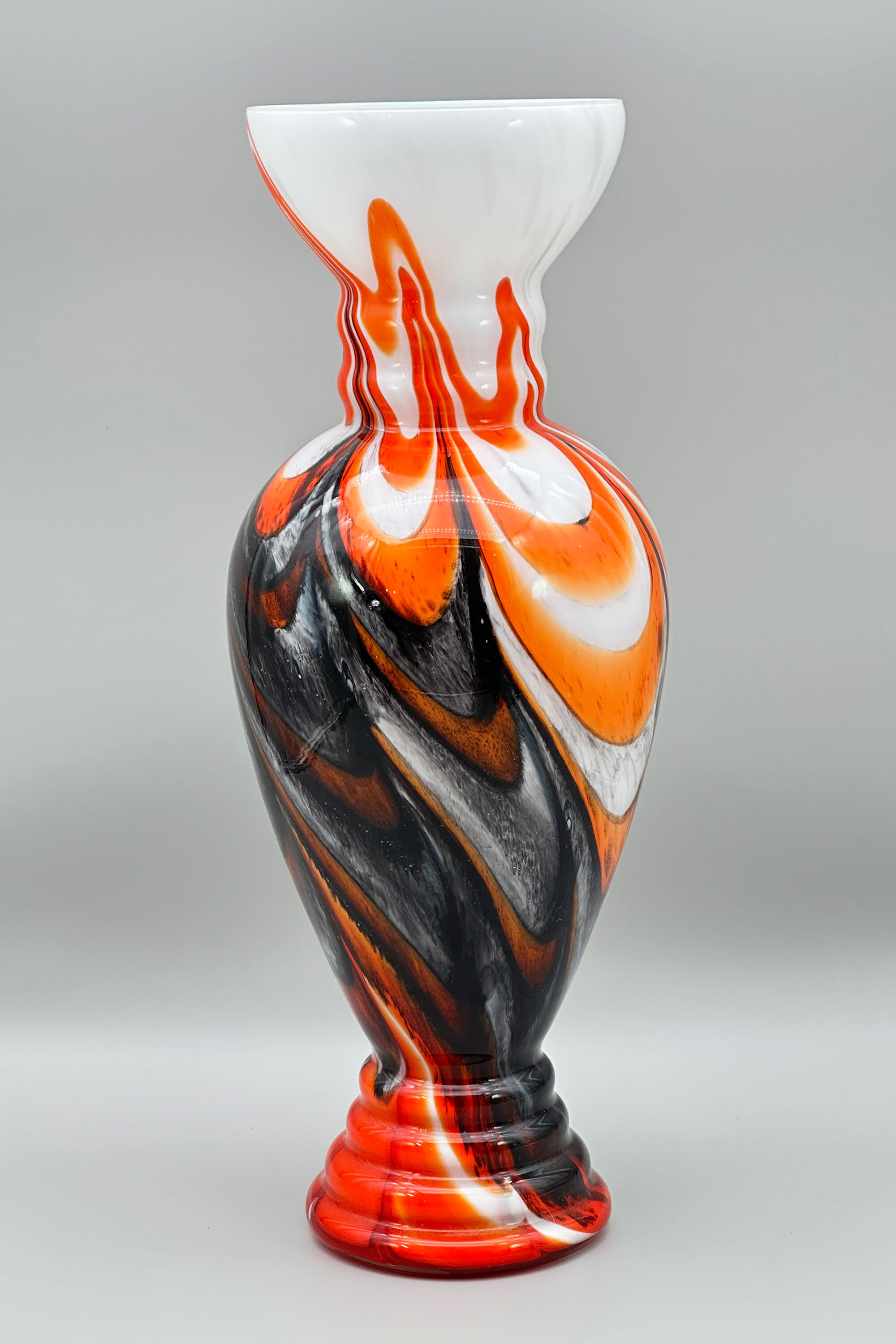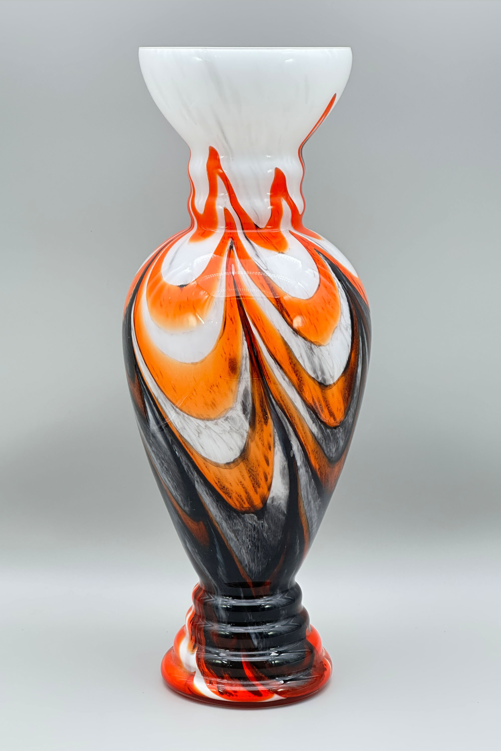 This is a striking glass vase of slender proportions, the ovoid body above a flaring stepped foot, the short ridged neck flaring outwards to the top rim, decorated with a continuous design of black, grey and orange trailing swirls on a white ground. While similar to pieces produced by ‘Vetreria Barbieri’ at Empoli, vases of this type are usually attributed to the Murano based designer Carlo Moretti. Born in Murano in 1934, he founded in 1958 with his brother Giovanni a glassworks named after him which enjoyed great success and was eventually sold by Giovanni in 2013, five years after Carlo’s death, to an Italian fashion company who continue production under the name. Vases in this style were made in the 1970s and this is an exceptionally fine and large example, well deserving a place in a collection of contemporary Italian glass.| Size: | Ht 44cm, Top rim 14cm, Width (max) 15.5cm, Base 12cm |