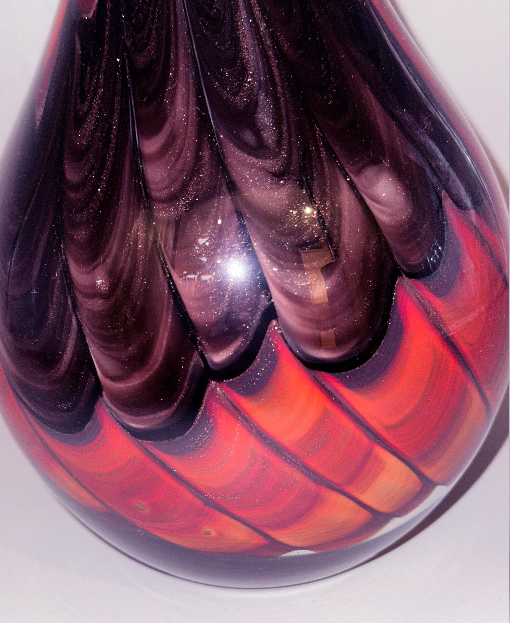 This is an exceptionally tall art glass bottle vase, the pear shape body rising to a tall, slender neck very slightly tapering inwards and then flaring gently outwards to the uneven profile top rim, the base flat and the decoration with trails of gently spiralling mottled and feathered orange glass on a black ground heightened with gilt speckle [CHECK]. The techniques used here have all the hallmarks of the Murano glassworks and the form, while unusual, is not inconsistent with the work produced there but, while these vases are often described as ‘Murano’ there is no proof of this and ‘Murano style’ is perhaps a safer description. But this does not detract from the grand magnificence of this piece, which would have been a striking decorative accessory when it was made, probably in the 1960s or 1970s, and remains so today.| Size: | Ht (max) 47cm, Top diam (max) 5.2cm, Width (max) 14.5cm, Base 8cm |