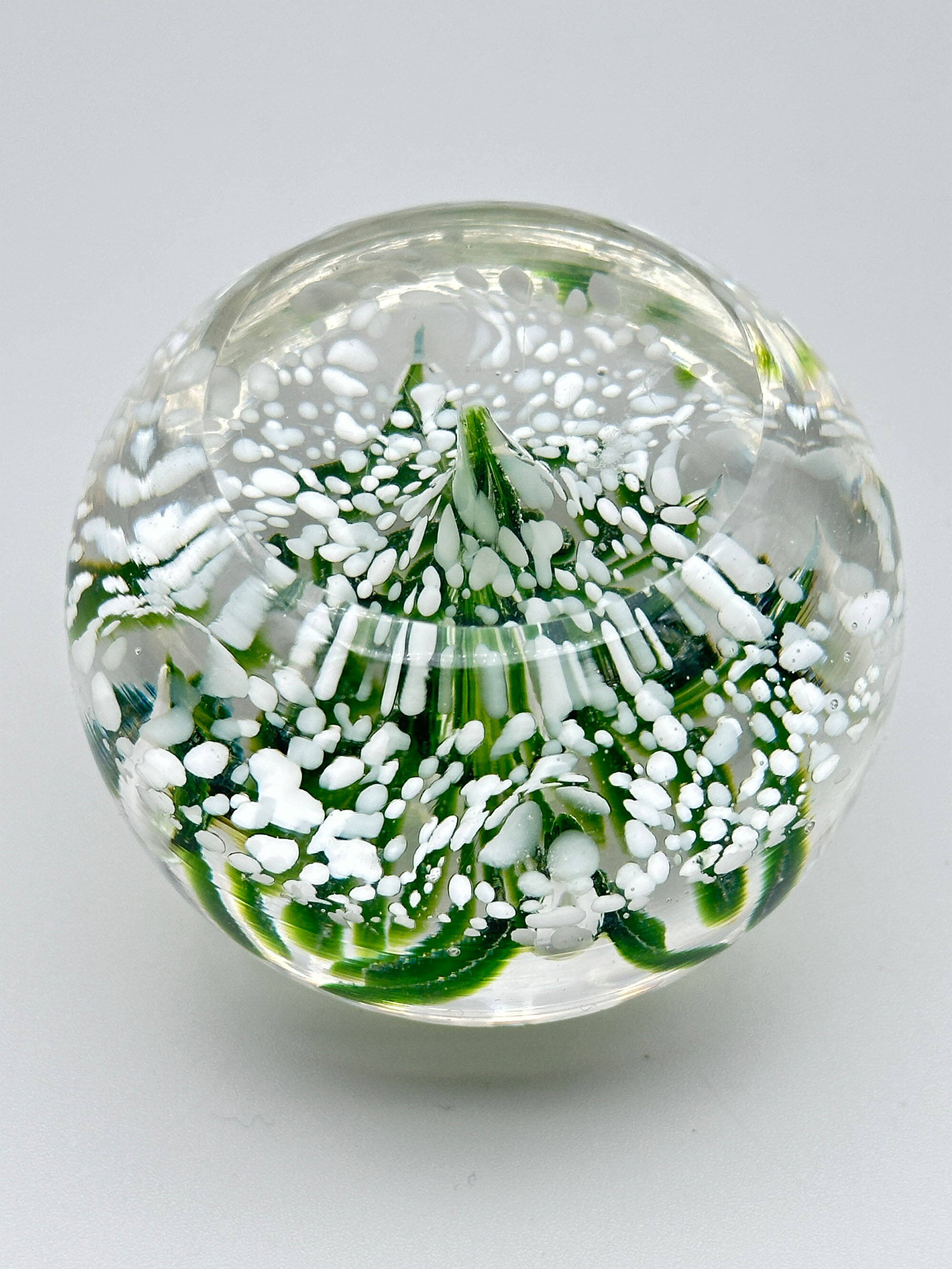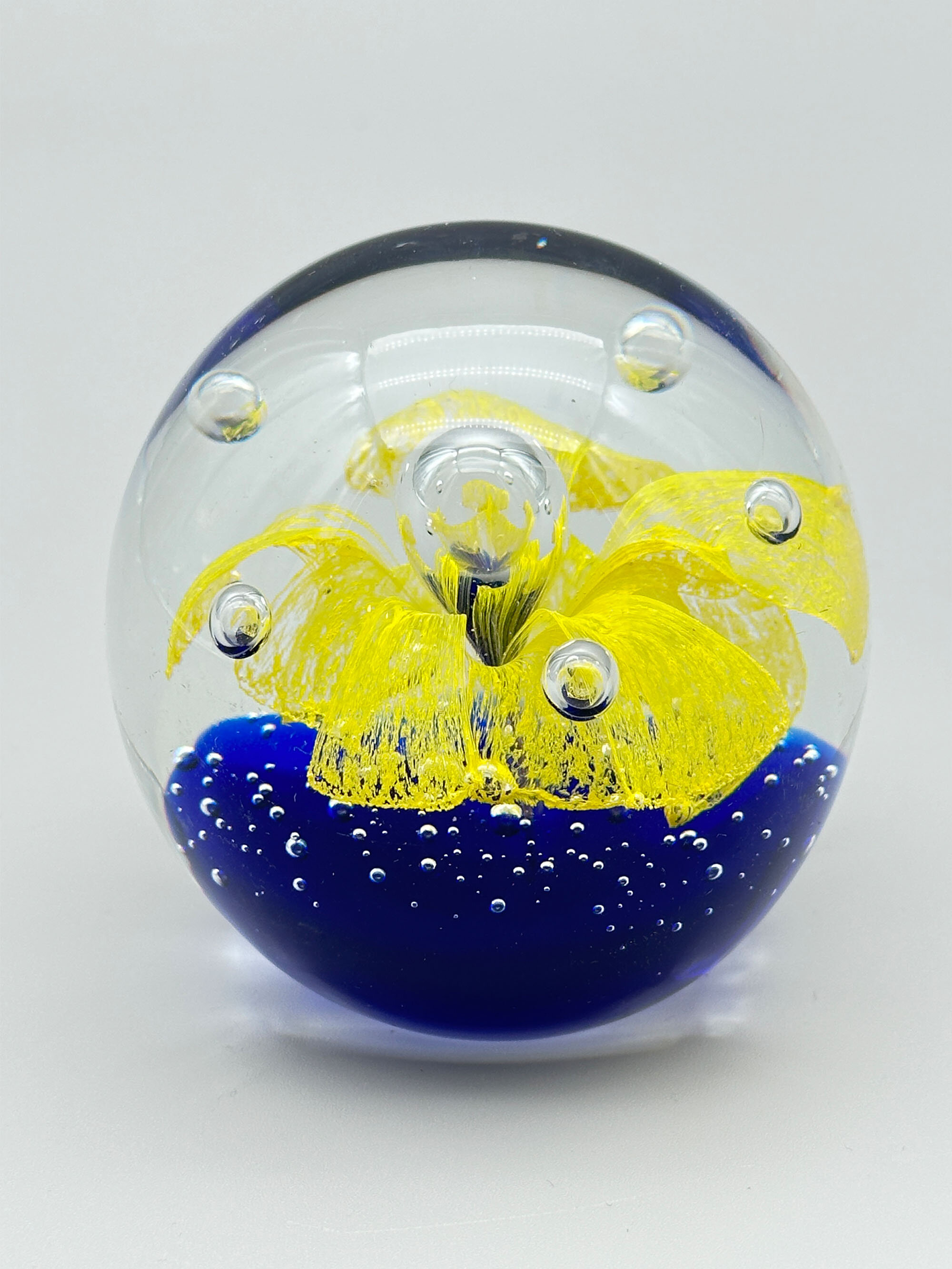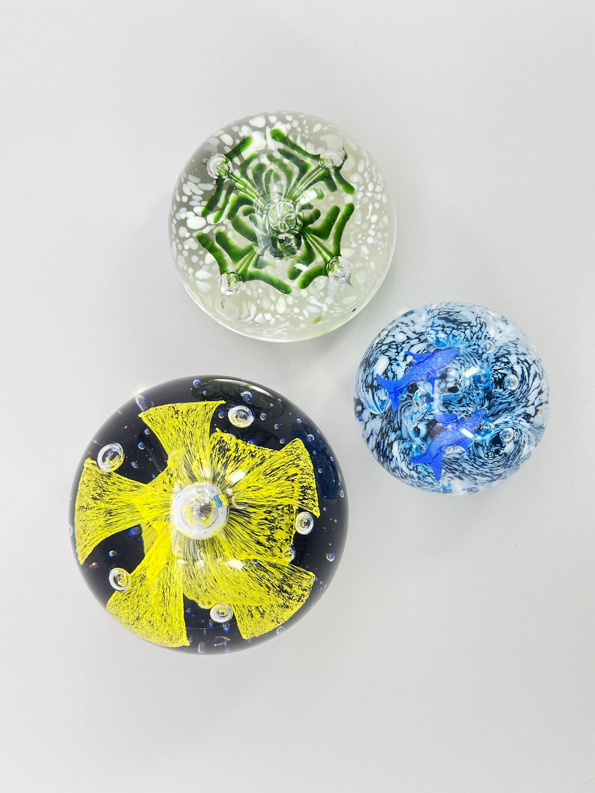Three attractive paperweights of typical globular form with flat bases, the first with a yellow lily growing from deep blue water with bubbles, the second with a green lily like plant issuing from clear water with foam on the top and the third with two dolphins above blue and white flecked waves. Features of the first and the last (the ‘bullicante’ bubbles and the two swimming dolphins) are found in Murano pieces and this may well be their place of manufacture. The second looks more English and could be from one of the many firms who make paperweights, such as Caithness. Dating is probably to the later years of the twentieth century.| Size: | (i) Yellow/Blue : Ht 8cm, Diam (max) 8cm, Base 4.2cm (ii) Blue : Ht 6cm, Diam (max) 6.5cm, Base 4.2cm (iii) Green : Ht 5.5cm, Diam (max) 5.5cm, Base 2.5cm |