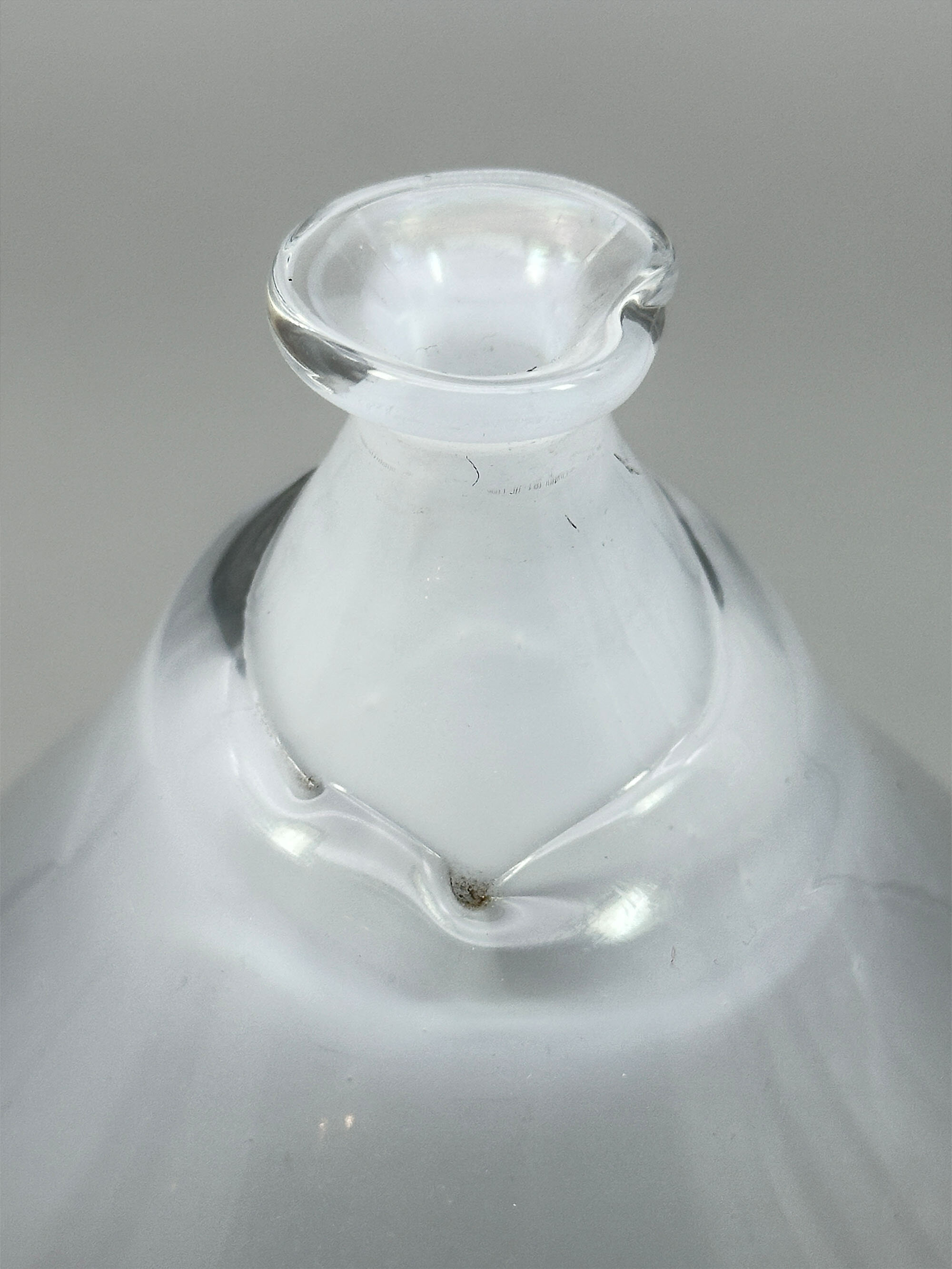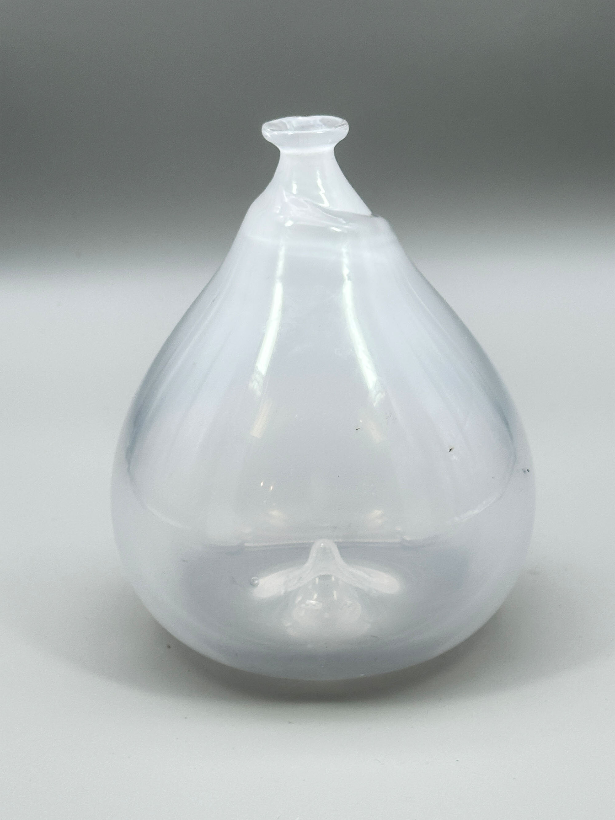 An unusual art glass vase of a broad pear shape, the very narrow neck with ridged rounded decoration matching the top rim, the interior with an abstract leaf shape object at the base, the glass cloudy and with small flecks. There are no clear parallels for this piece, although it loosely resembles designs by Ingeborg Lundin for Orrefors, Sweden, (see image 9) which perhaps suggests a Scandinavian origin although this is far from certain. Elements of the decoration are clearly organic but the precise function of this vase remains something of a mystery.| Size: | Ht 17cm, Diam (max) 13.5cm, Base 7cm |