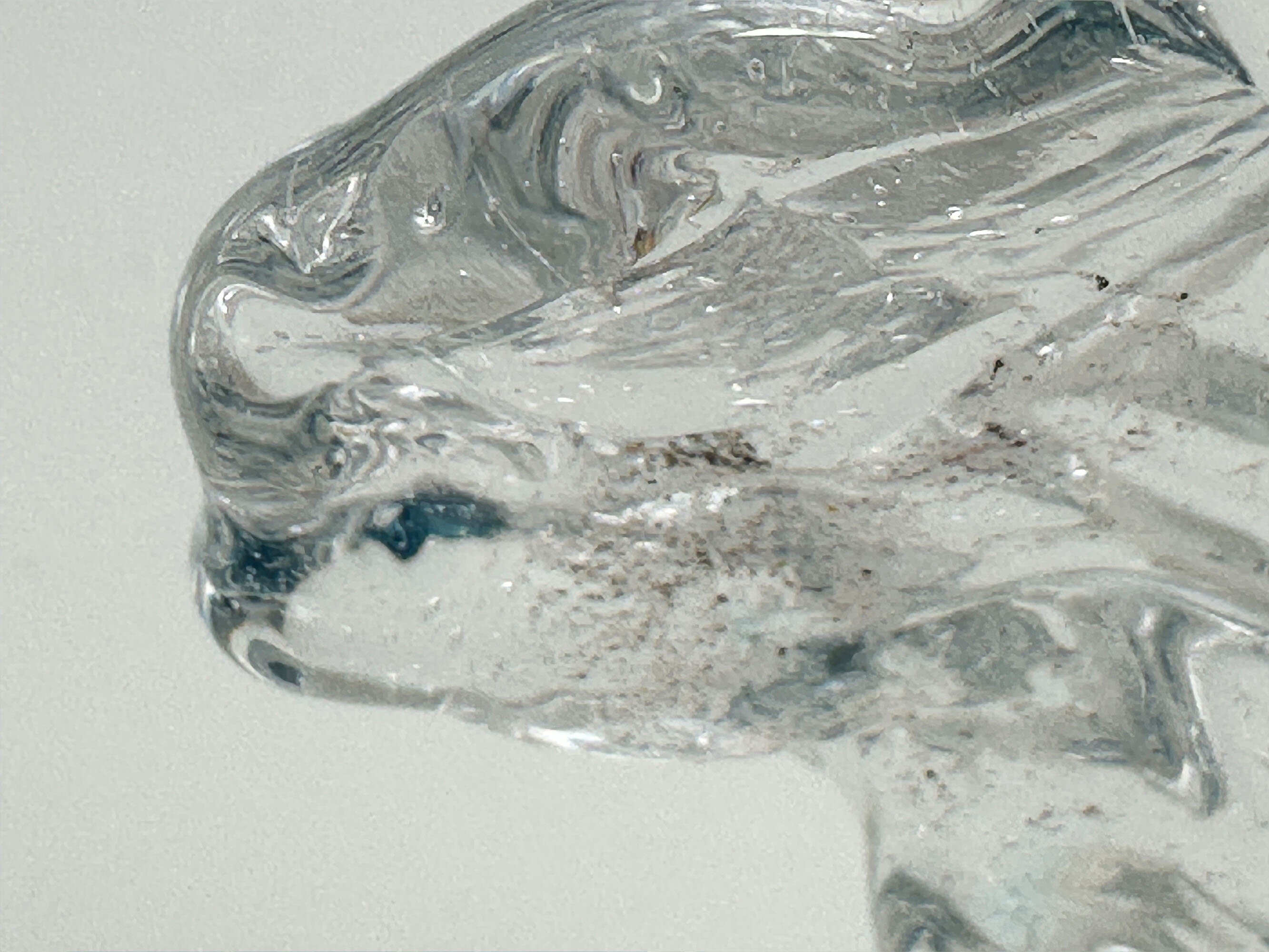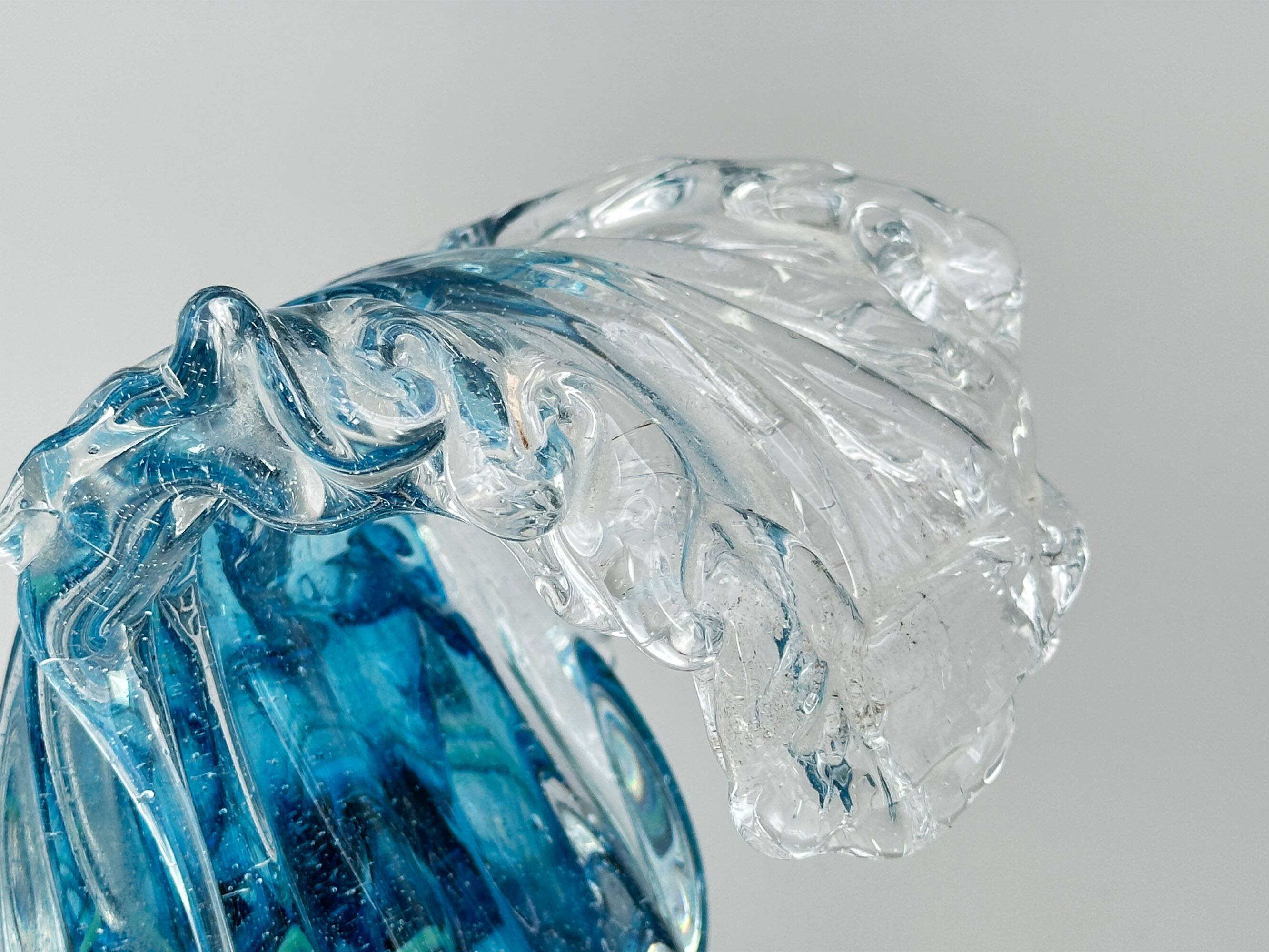 This is a dramatically modelled vase representing a cresting wave, the variegated blue glass with minute bubbles imitating water and blending into clear glass imitating the foam atop. It stands on an irregularly circular base, similarly finished. There are similar wave shape glass sculptures made by British artists such as Alison Vincent or David Wight but this piece resembles more closely the marine inspired designs made at Murano, Italy, in the later part of the twentieth century, some of which are attributed to Cristiano Toso. The maker here must remain anonymous but has created a dynamic piece which successfully recreates the sense of an ocean swell.| Size: | Ht (max) 14cm, Width (max) 11cm, Base 10cm |
