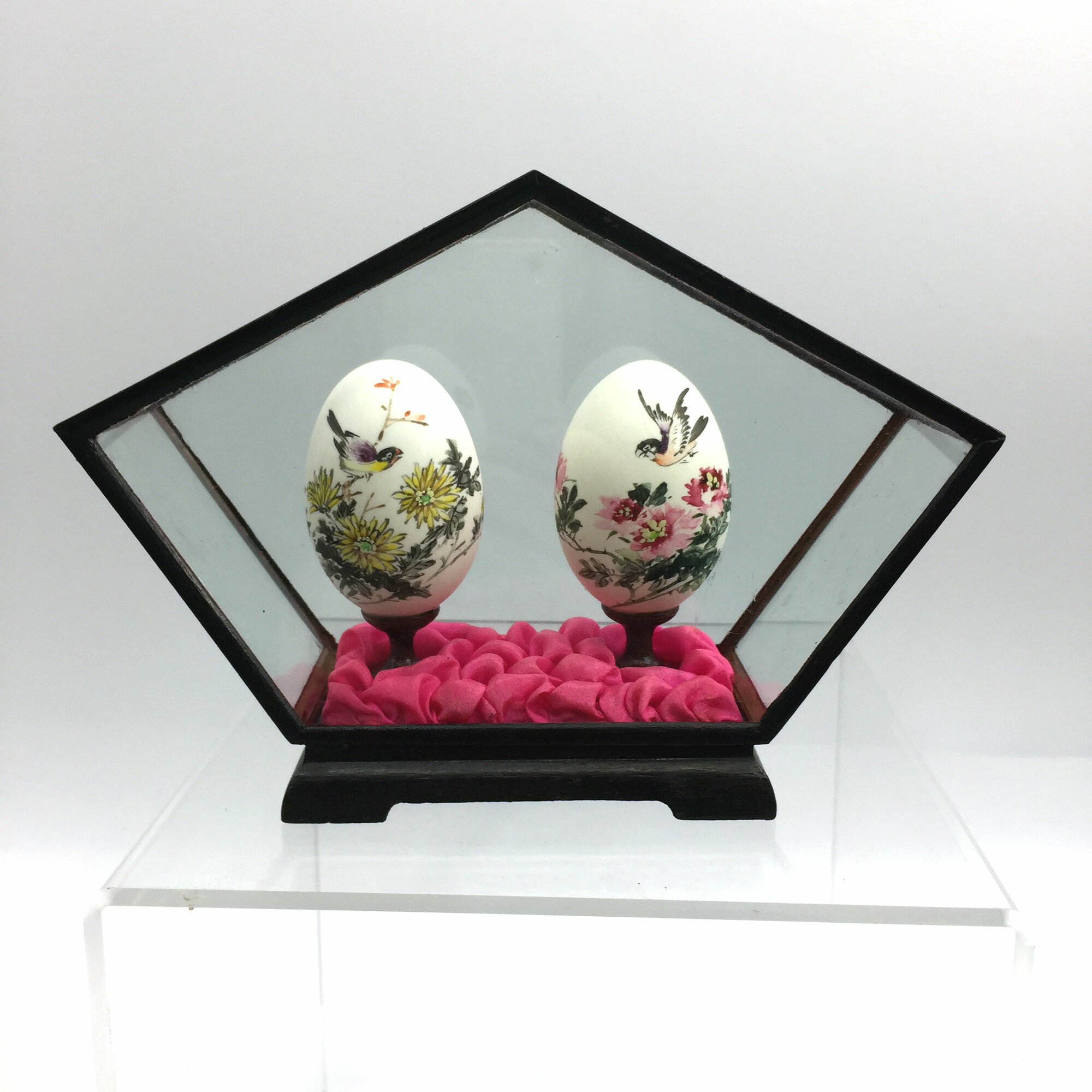 Very fine pair of vintage Chinese painted eggs in a pentagonal glass case