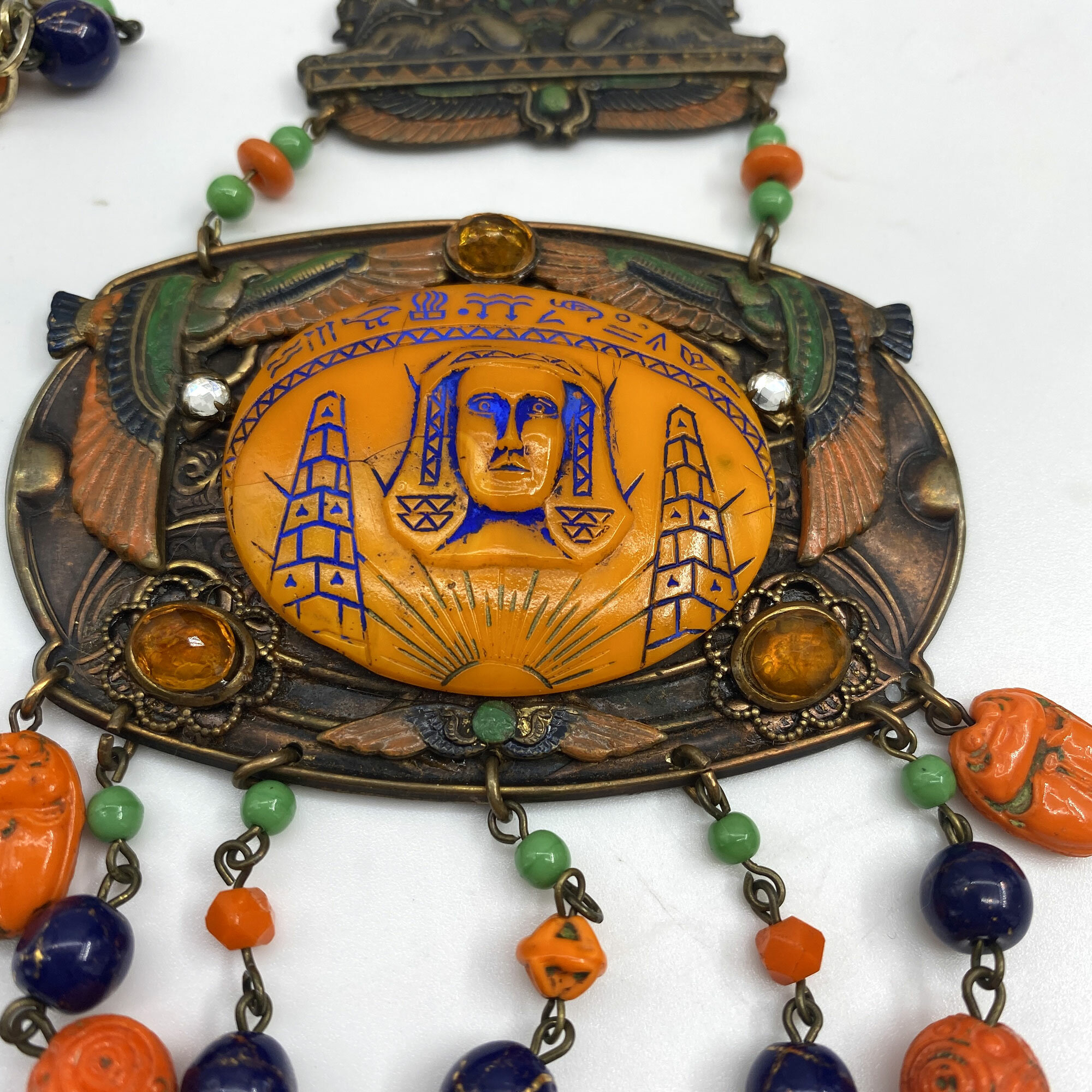 A wonderful necklace by the Czech jewellery makers Neiger Brothers, with the typical pressed glass scarab beads and brass fittings. This piece is quite rare as it also has a glass plaque.| Size: | Necklace 44 cm long with 10 cm extender, main piece is 8 x 6.5 cm |