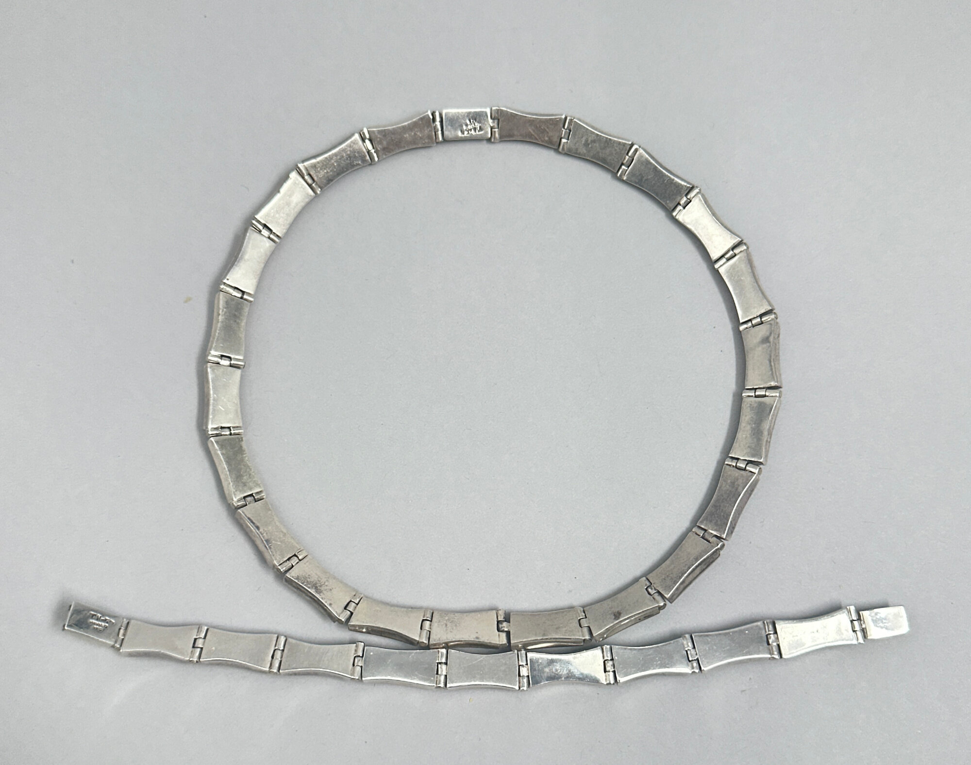 This is a quite rare suite of necklace and earrings that come from the Taxco region of Mexico. Both comprise stations of malachite and onyx that go all the way around each piece. The stations are each individually hinged which gives these pieces a fluidity and quality that only comes from the Taxco workshops. Both have the typical box clasp and are marked 'TN-57' 'Mexico' '925'. The TN number indicates the workshop although there is no definitive list regarding the numbers attached and an exact provenance cannot be determined.| Size: | Necklace is 43 cm long, 9.4 mm wide, bracelet is 20 cm long, 9.4 mm wide |
