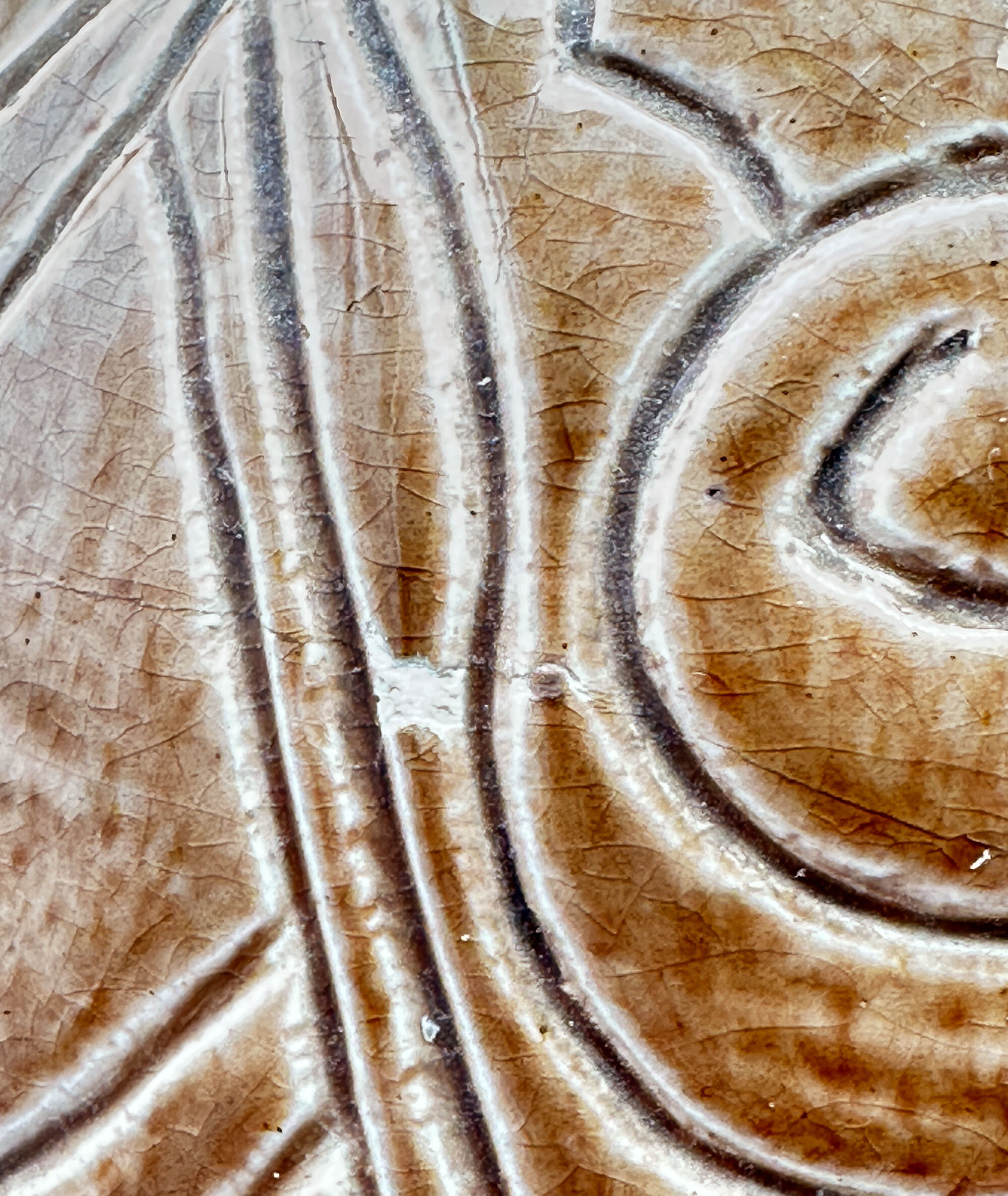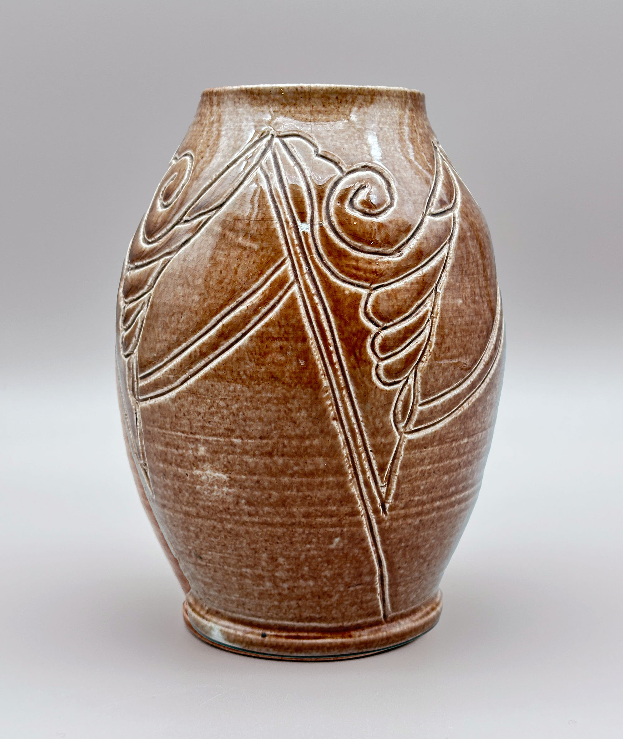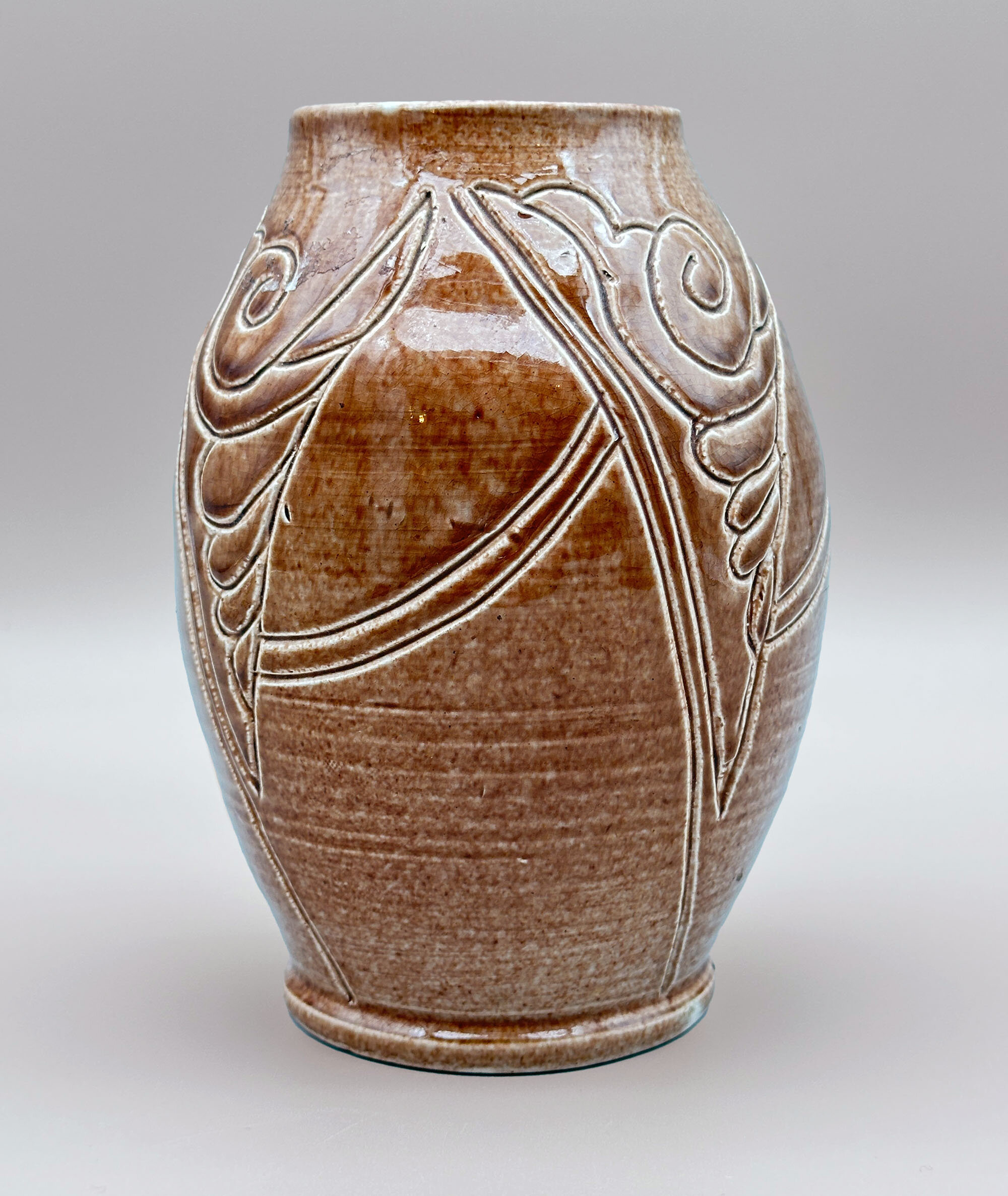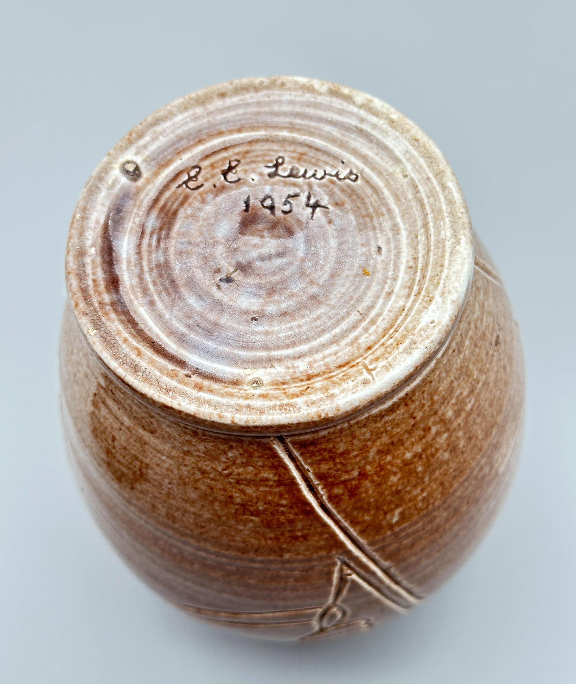 An attractive studio pottery vase of broad ovoid form with a short stepped foot and a cylindrical rim, glazed overall in speckled brown with a slight craquelure, the pronounced potting rings showing through, and decorated with an incised design of abstract organic motifs, the base glazed, also with clear traces of the potting rings, and with an incised signature ‘E.E.Lewis 1954’. The maker cannot be otherwise identified but was clearly an accomplished amateur and the form and decoration combine to produce an elegant decorative piece.