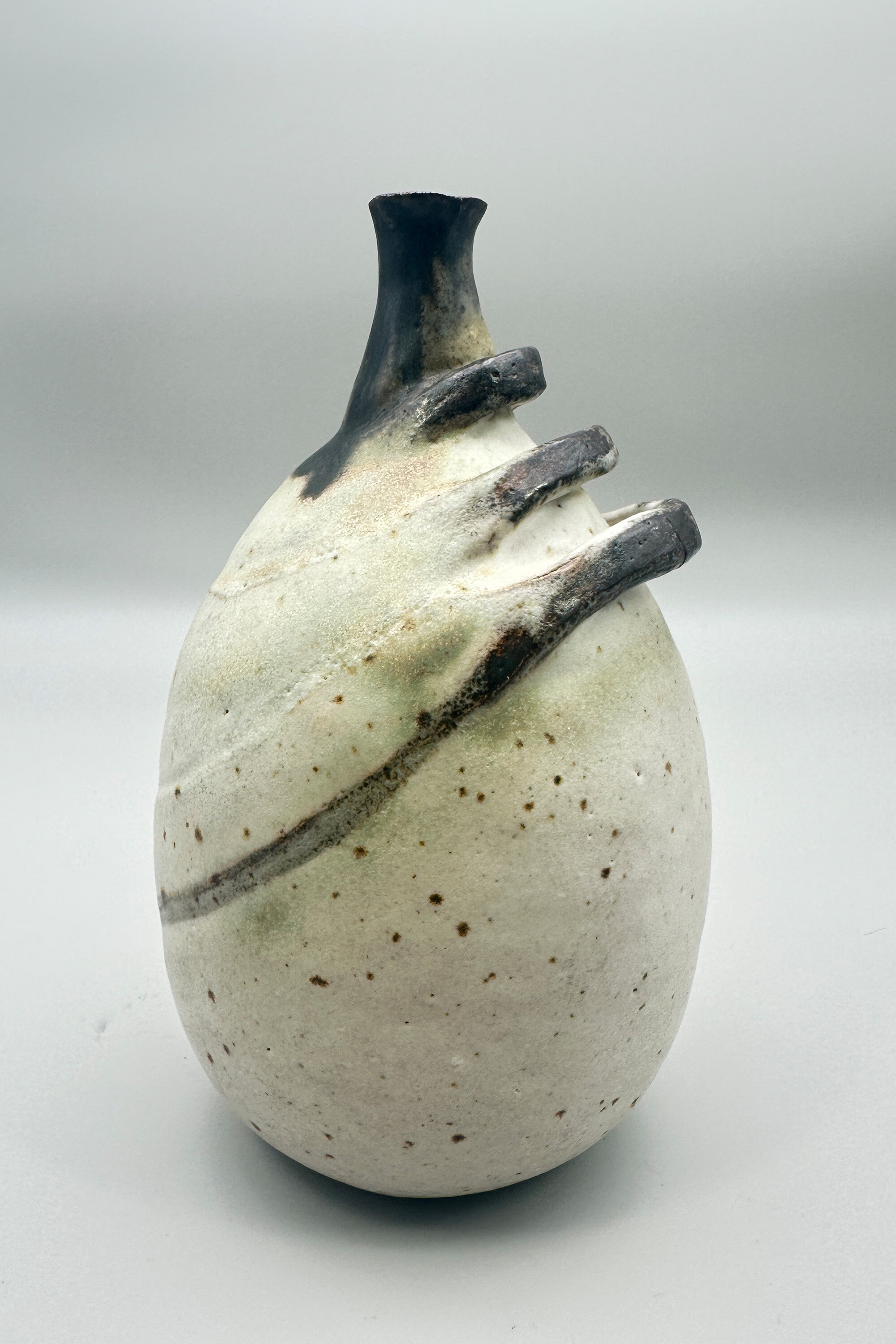 A stoneware vase of ovoid form with a short slender concave neck, the cream mottled glazed body with three looping raised bands in brown and the neck also glazed in brown, the flat base unglazed with an impressed mark ‘BP’ partially obscured by a gilt label for ‘Brenda Piper’, ‘Acorn Pottery’. There is an entry for Brenda Piper in ‘British Studio Potters’ Marks’ by Eric Yates-Owen and Robert Fournier (2nd edition 2005 p401) but little is known about her. She worked at her Henley studio from 1987-1990 and the form of her signature mark changed after 1990 giving a very secure dating here. Other pieces by her display a variety of semi abstract organic forms which is consistent with the design of this vase although its exact significance remains rather unclear.| Size: | Ht 16.5cm, Width (max) 9.5cm, Base 6cm |