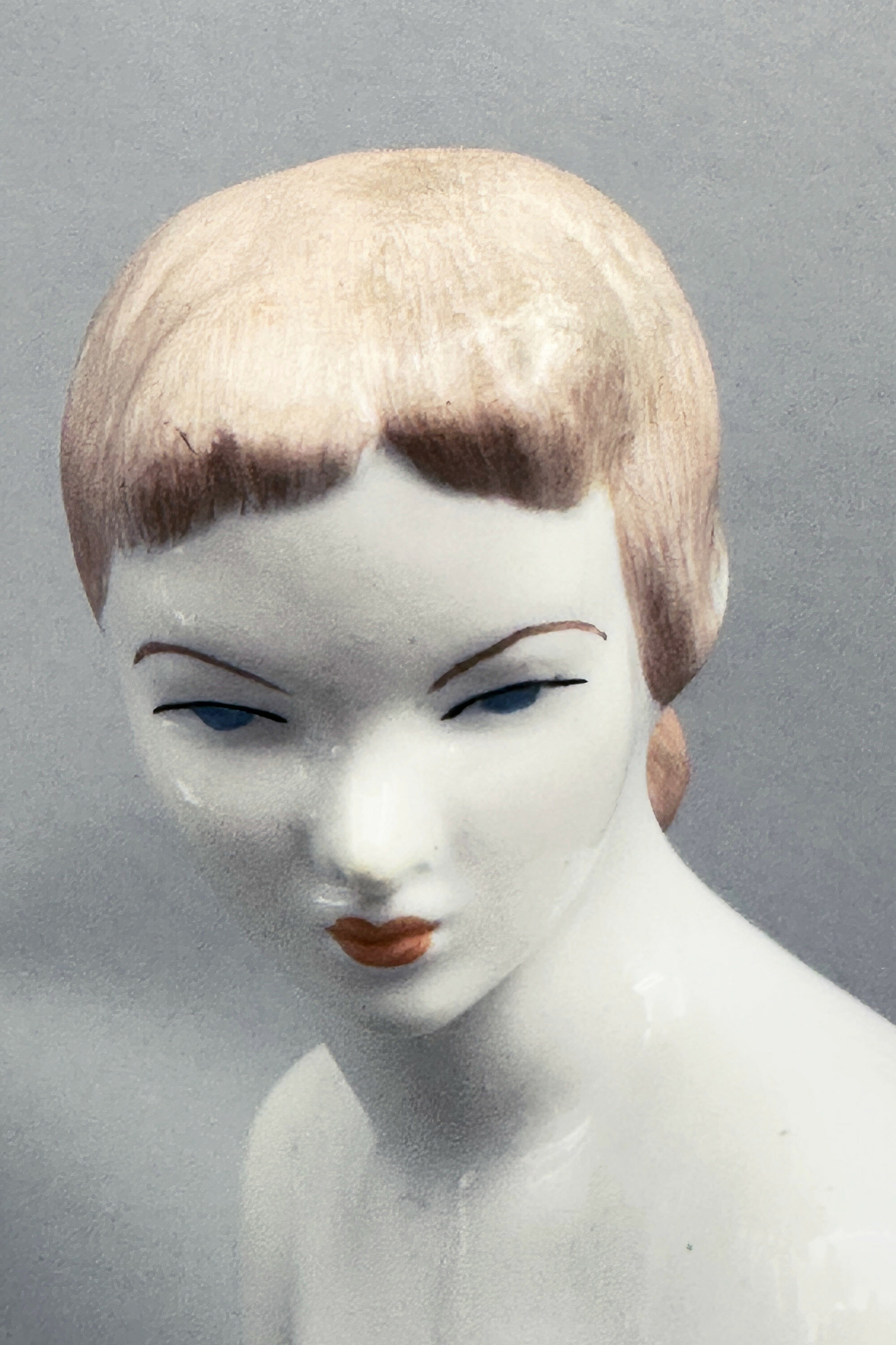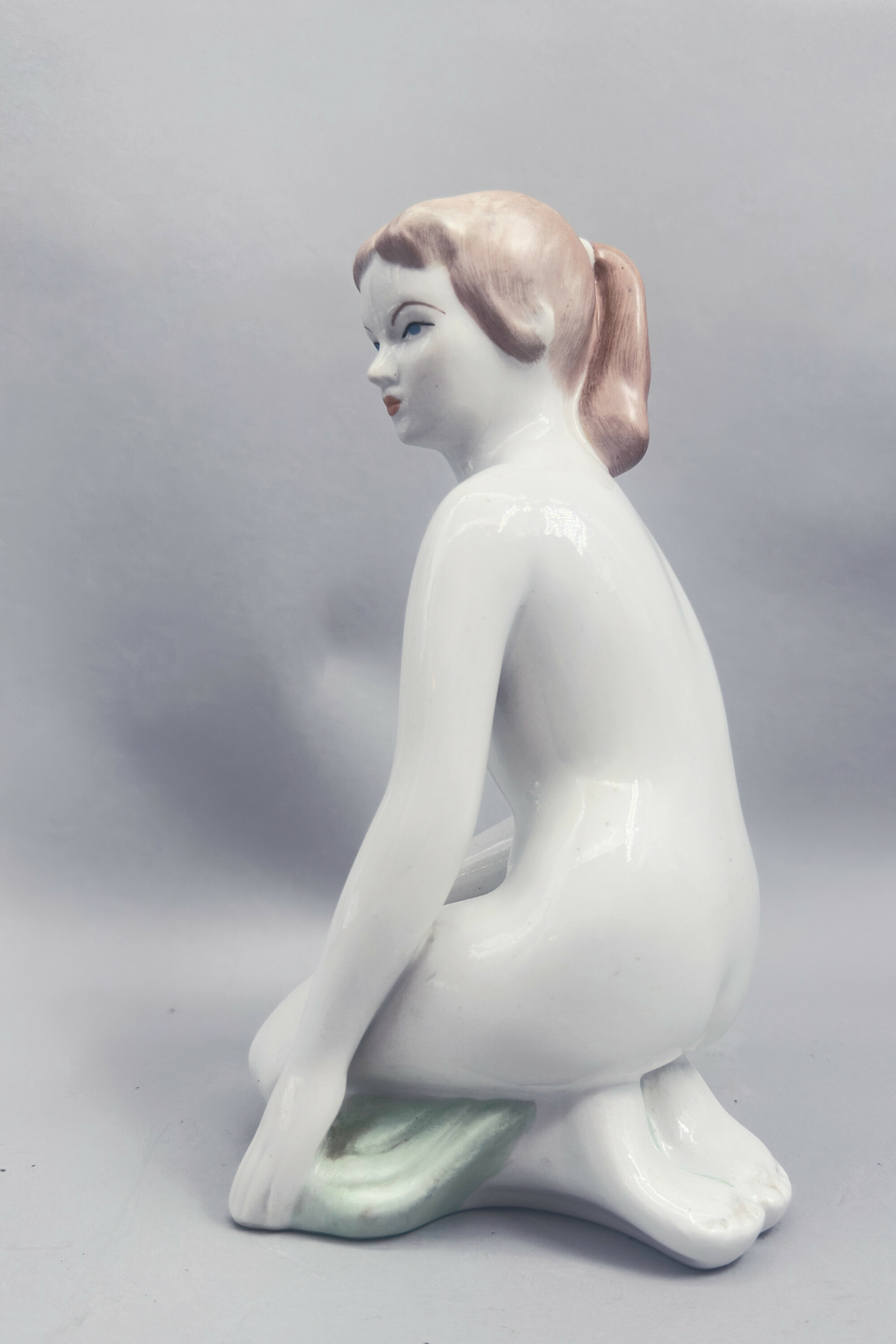 Art Deco style kneeling figure of a Girl, Aquincum Hungary, second half C20th While closely following the models of the 1920s and 1930s, this elegant figure of a young girl bather, unclothed except for the green towel between her knees, is a fine example of the Art Deco style figures produced by the Aquincum porcelain factory at Budapest, Hungary from the 1950s onwards. The white glazed figure is finely modelled with flowing lines and just a hint of colour on the face and towel. The base has a stamped mark in blue, an eagle with ‘BUDAPEST’ above standing on a rectangular base marked ‘Aquincum’.Aquincus was an ancient Roman settlement, eventually to become the town Obuda, the third of the three cities which were merged to form Budapest and the oldest district in the Hungarian capital. In 1854, Hüttl Tivadar set up a shop in Pest selling porcelain eventually becoming involved in porcelain manufacture itself with such success that by the early 1900s he was supplying the court at Buda, eventually supplanting the rival firm of Herend. Despite legal battles amongst the family concerning the ownership of the business, the firm continued to prosper until the 1950s when the new communist government decided to nationalize the factory, renaming it Aquincum Porcelángyár. Tableware, which had been the staple of the Hüttls’ production was replaced by figurines which rapidly enjoyed great popularity. One of the principle artists was Antonia Szabó who became chief designer in 1966. With the end of socialism, the firm went into private hands in 1993 but suffered an immediate and rapid decline causing it to close soon after.