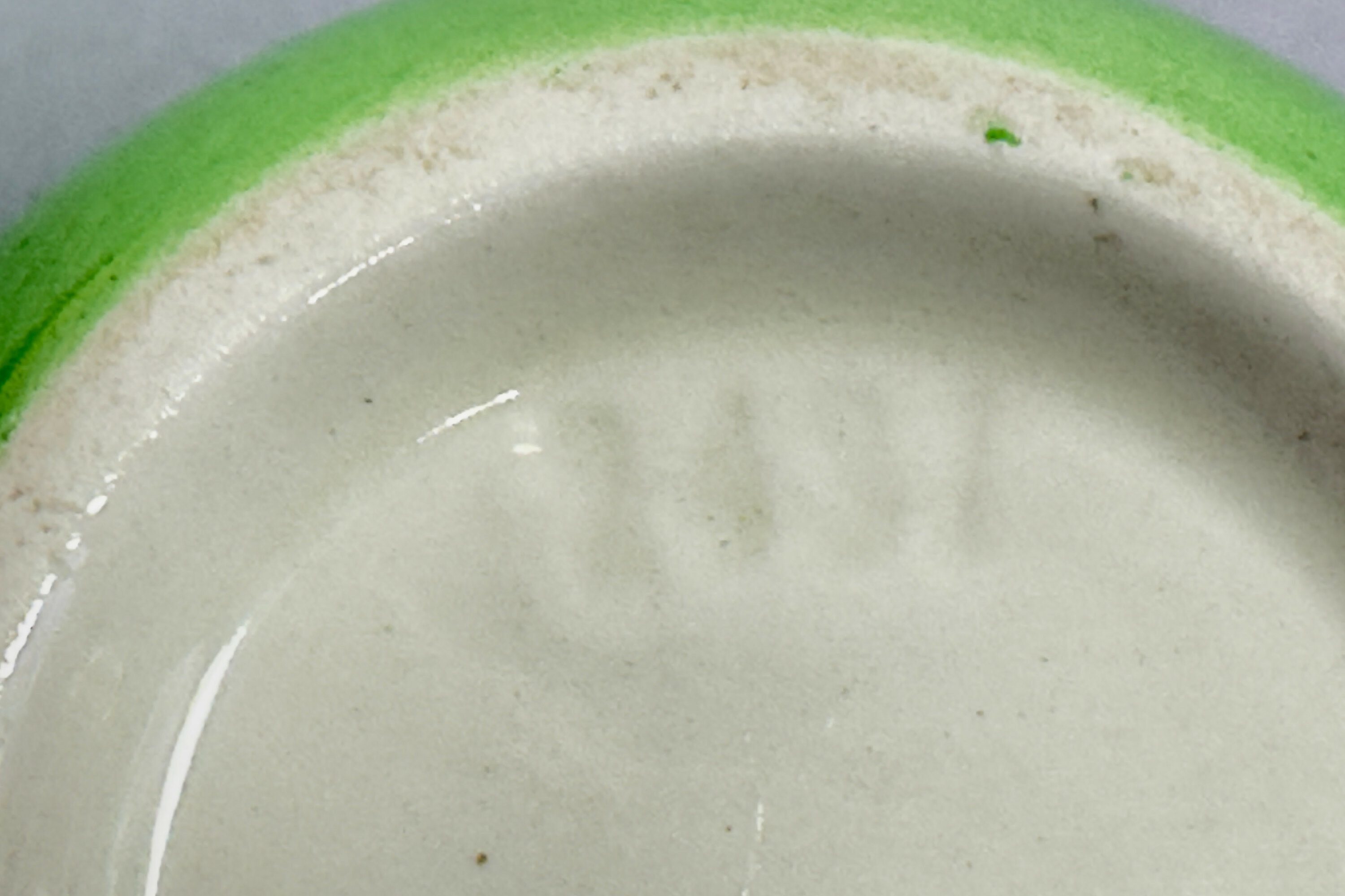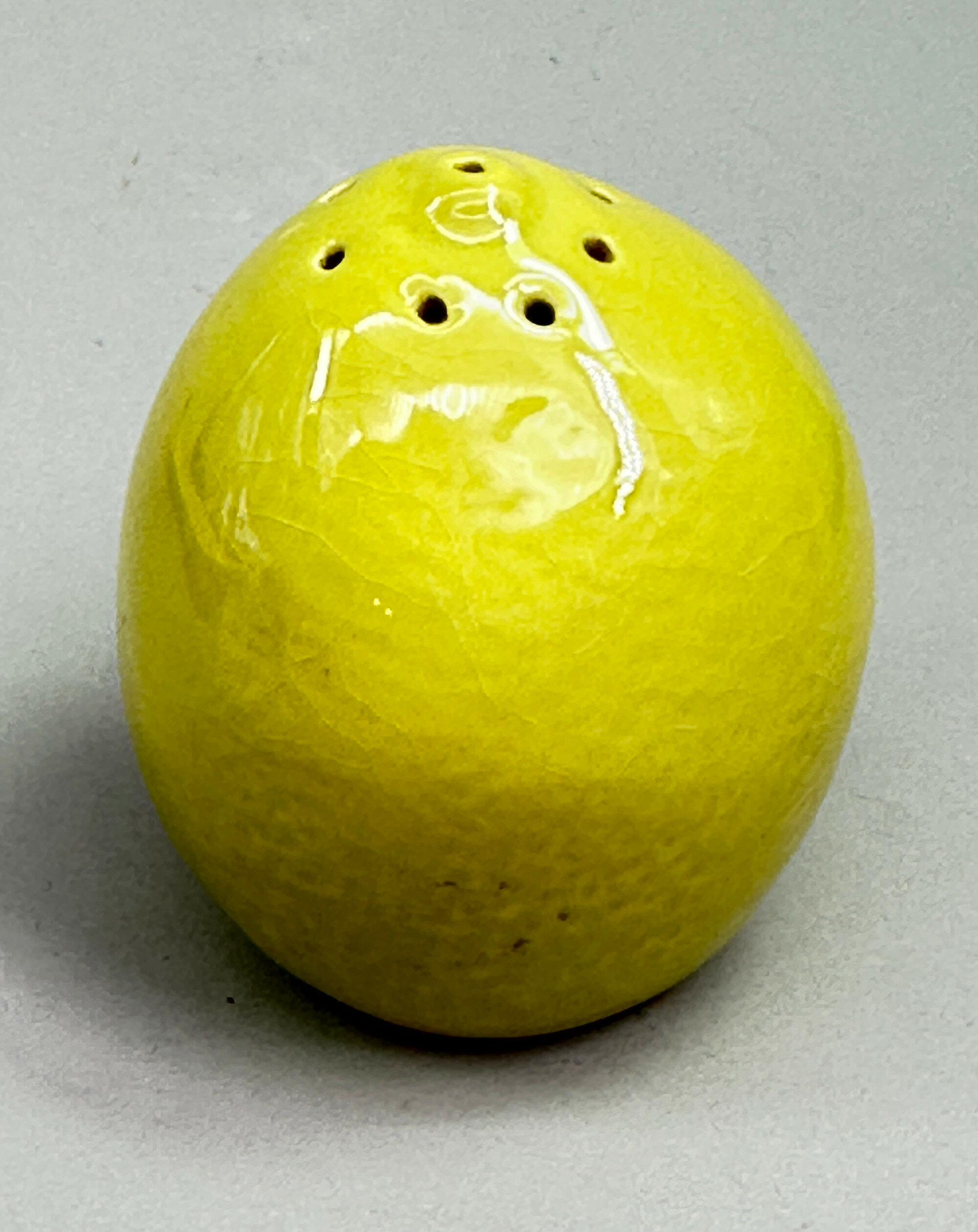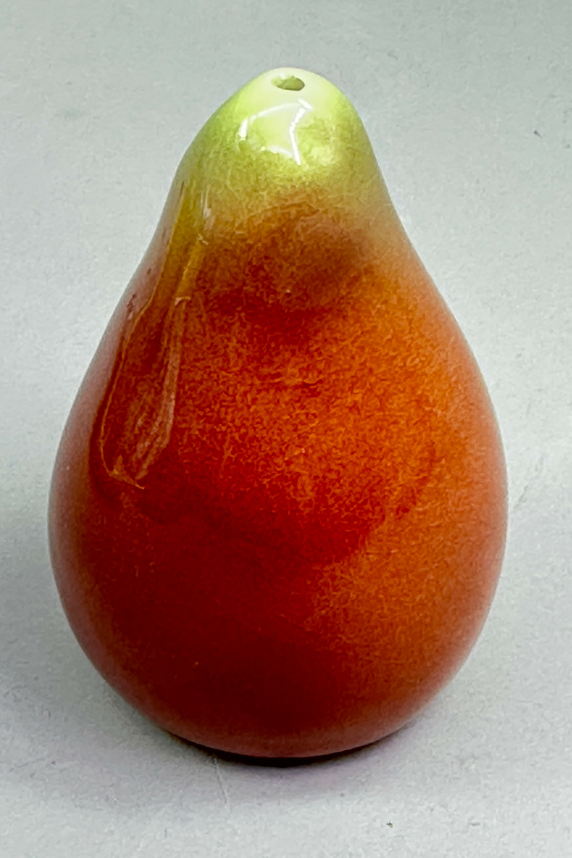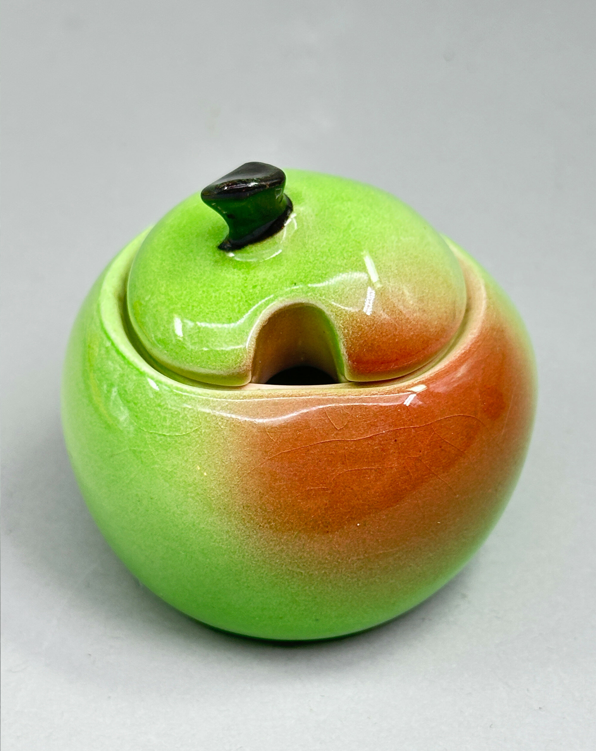 This is a fun cruet set with all the four elements in the form of fruit. On top of a yellow banana leaf tray sit a lemon pepper pot, a russet red pear salt pot and a green and red apple mustard pot. The apple and the tray have impressed numbers underneath ‘2431’ and the tray has printed marks in black ‘Carlton Ware’ ‘Hand Painted’ [in script] ‘Made in England’ ‘ “Trade Mark” ’ ‘Registered’ ‘Australian Design’.Carlton Ware was the trade mark used by the pottery manufacturer Wiltshaw and Robinson, whose premises were located in Stoke on Trent, four years after the firm’s establishment in 1890. The well known script mark was introduced in 1928. The firm mostly concentrated on decorative giftware and new methods of production introduced in the 1920s put it at the forefront of the earliest Art Deco pottery pieces produced, firstly with designs originating from Tutankhamun’s tomb and then with pieces with an Oriental chinoiserie influence. Tablewares were also produced and this cruet set is an example of the imaginative designs made after the second world war and most likely dates to the 1950s. The appeal is obvious and today this set, complete with the original stoppers for the salt and pepper, can fulfil both a practical and decorative function.
