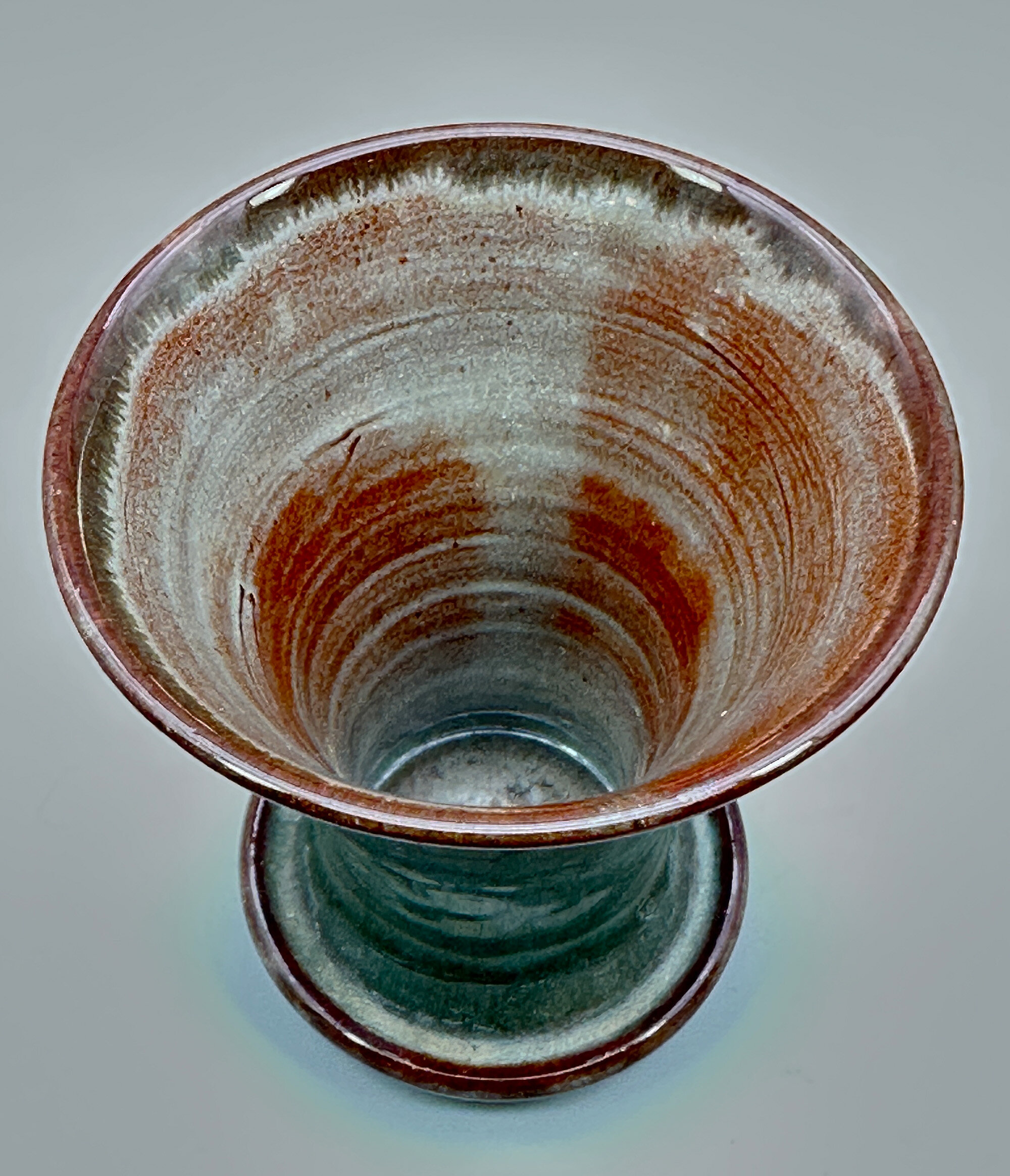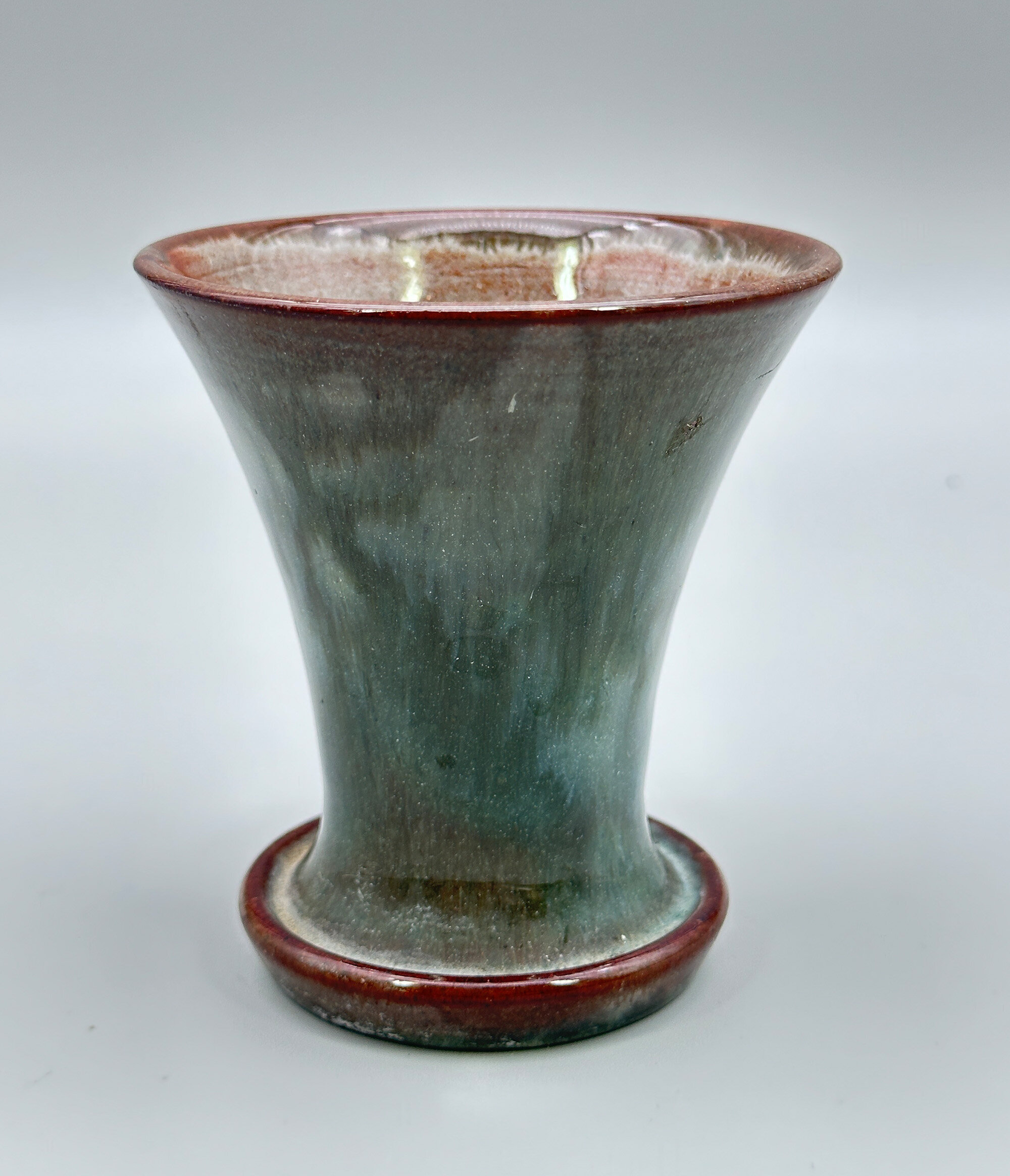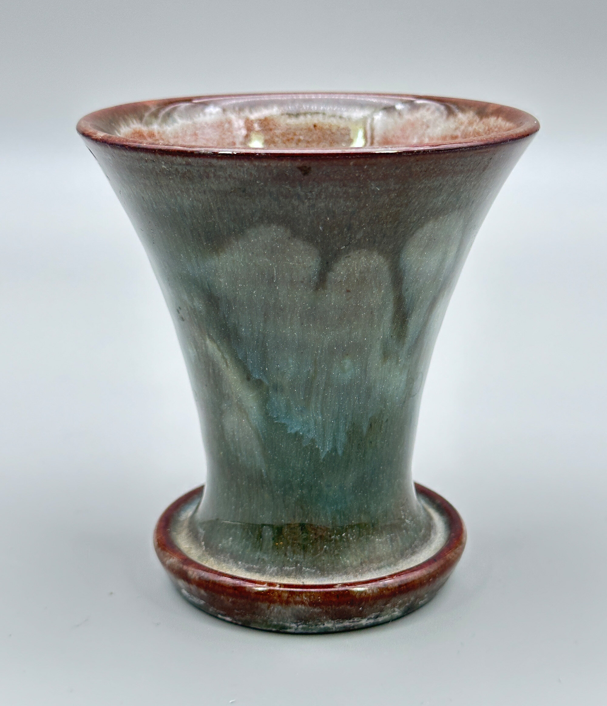 A studio pottery beaker of broad flaring form with a stepped base, channelled at the top, the interior glazed with pronounced potting rings and the base also glazed with an incised script mark ‘Ewenny Pottery’, the main body coloured in mottled grey/green and the interior and base in mottled brown.There has been a pottery at the small Welsh town of Ewenny since 1610, the area around being, at the time, a fertile source of clay. In the early 1800s Evan Jenkins married Mary, the daughter of then owner John Morgan, and this began a period of ownership by the Jenkins family which continues today, the studio and shop being run by Alun Jenkins and his daughter Caitlin, who is the eighth generation member of the business (see image XXXX). Their mark can be seen at ‘British Studio Potters’ Marks’ by Eric Yates-Owen and Robert Fournier (2nd edition 2005 p157). Production has tended to concentrate on modest utilitarian items, hand potted and finished with the distinctive glazes for which the studio is known which involve dipping the pot in one glaze adding another with the splash technique and firing the item so that the two glazes fuse. The effects seen on this beaker are typical of their work as is also the clear evidence of hand throwing. Ewenny pieces are made and sold today, but the current catalogue does not list items exactly similar to this, so a late twentieth century dating is the most likely.