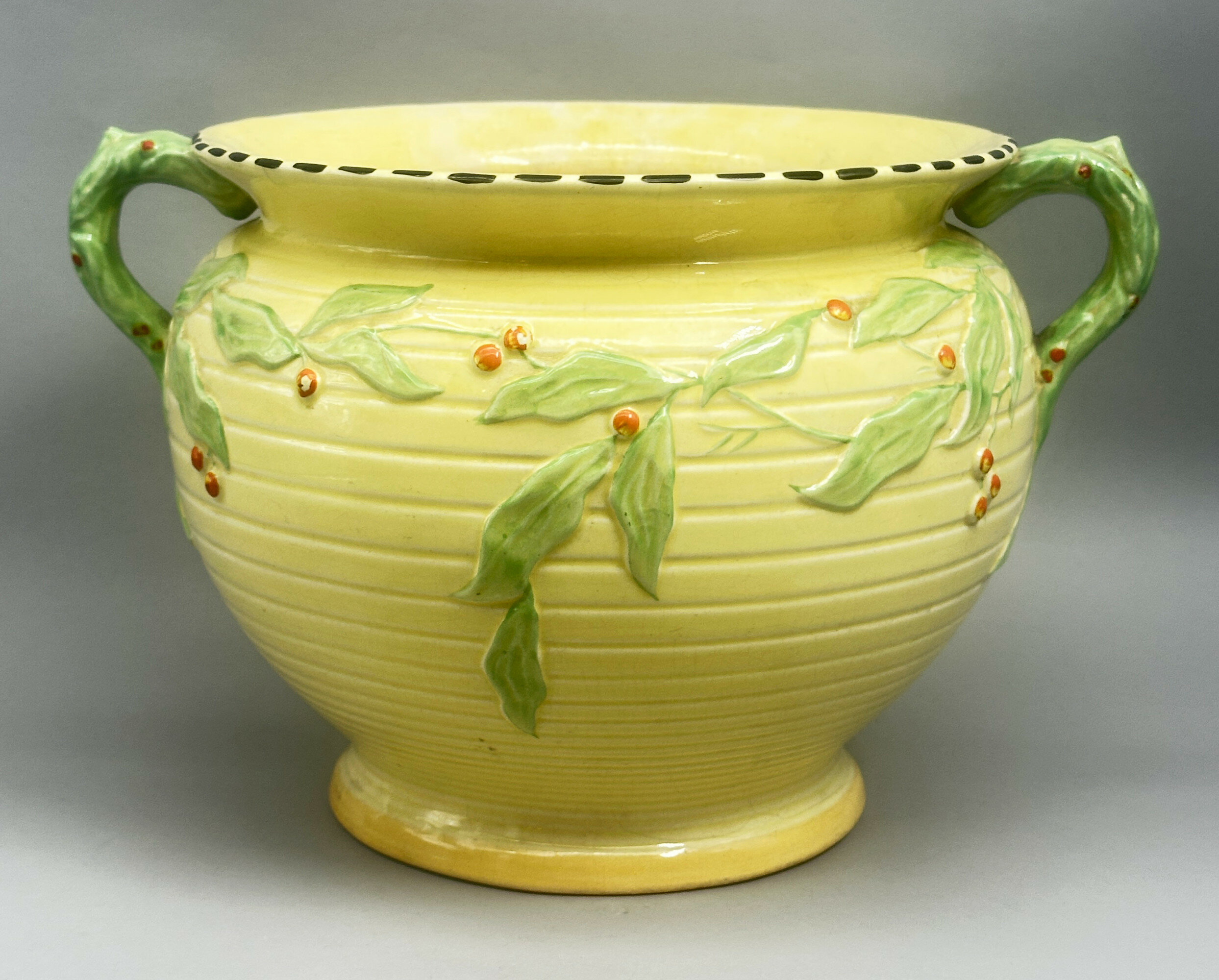 A circular jardiniere of globular form, the body ridged with a spreading foot below and a flaring rim above, two branch handles to the side, glazed overall in yellow, in part with a light craquelure, with polychrome raised moulded decoration of a mallard duck amidst foliage with berries, the interior glazed yellow and the base similarly glazed yellow with a craquelure effect and with a circular stamped mark ‘ENGLAND’ ‘LG’ [cipher] ‘FALCON WARE’ and impressed marks ‘MALLARD’ ‘MADE IN ENGLAND’.Falcon Ware was the trade name for pieces produced by Thomas Lawrence, later Thomas Lawrence (Longton) Ltd, a business founded by Thomas Lawrence in 1885 which moved to the Falcon works, Longton, in 1895. In the same year he took his nephew, John Grundy into partnership and around 1920 Grundy became the Managing Director. Thomas Lawrence died in April 1932 and John Grundy became the sole proprietor until his death in 1938 when the business was sold to Grundy's son-in-law Mr Richard Hull (jnr) and Mr. E.J. Dennis and the name was changed to 'Thomas Lawrence (Longton) Limited'. At the same time the firm merged with Shaw and Copestake Ltd of which Richard Hull was a Director but the two businesses still operated independently until 1962 when the Thomas Lawrence business was fully subsumed by its partner with the ‘Falcon’ name ceasing to be used two years later in 1964.