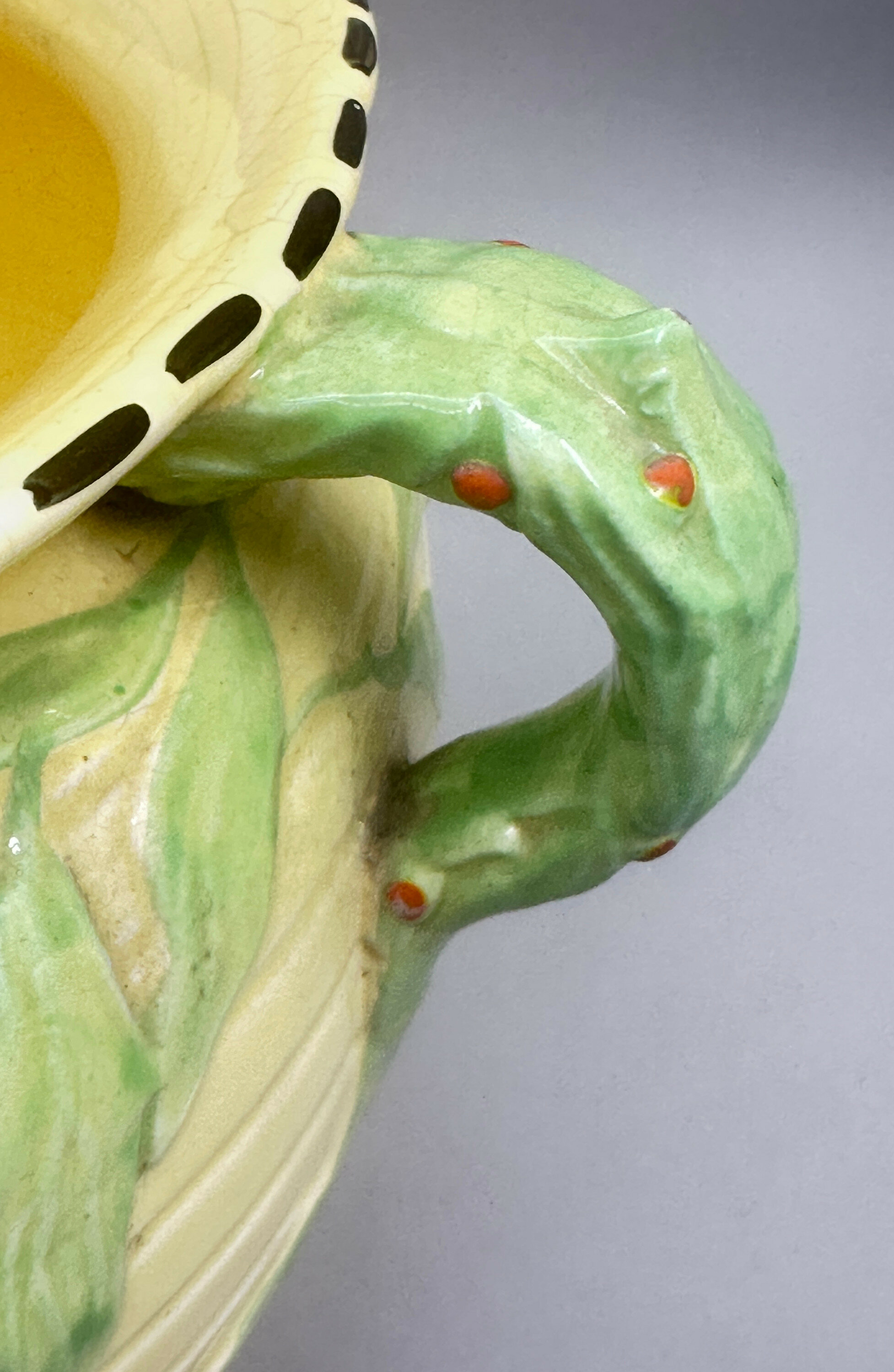 Falcon Ware was known for colourful and decorative designs often with naturalistic themes. This jardiniere is an excellent and unusual example. The cipher ‘LG’, for Lawrence and Grundy, which is not so often found, implies a dating to the 1930s which corresponds with the general style of the piece with its hint of Art Deco associations.