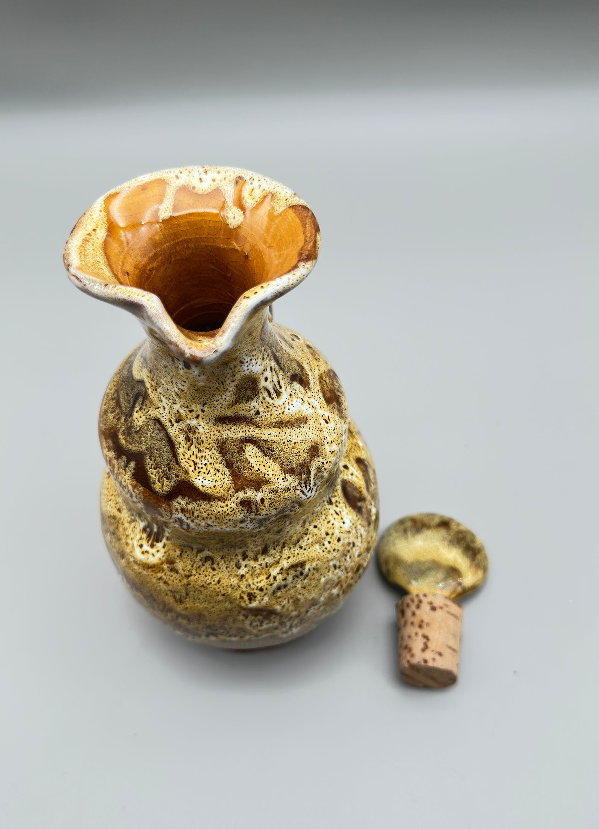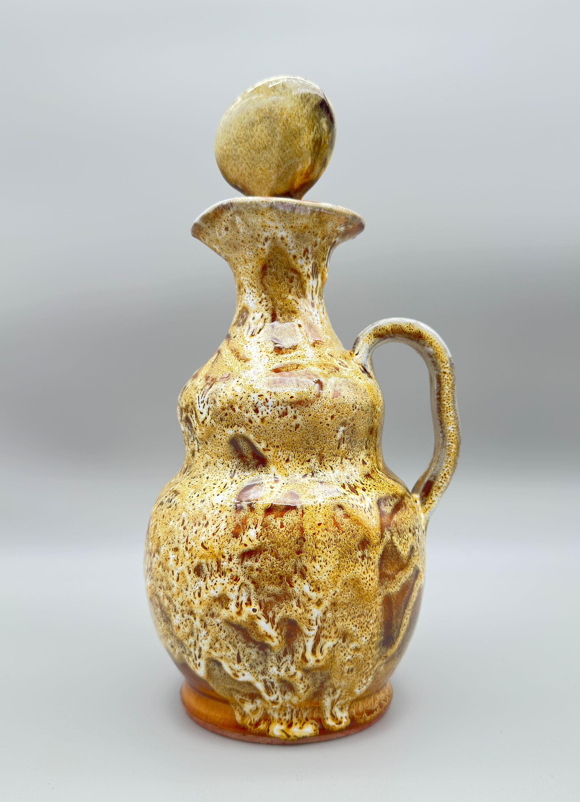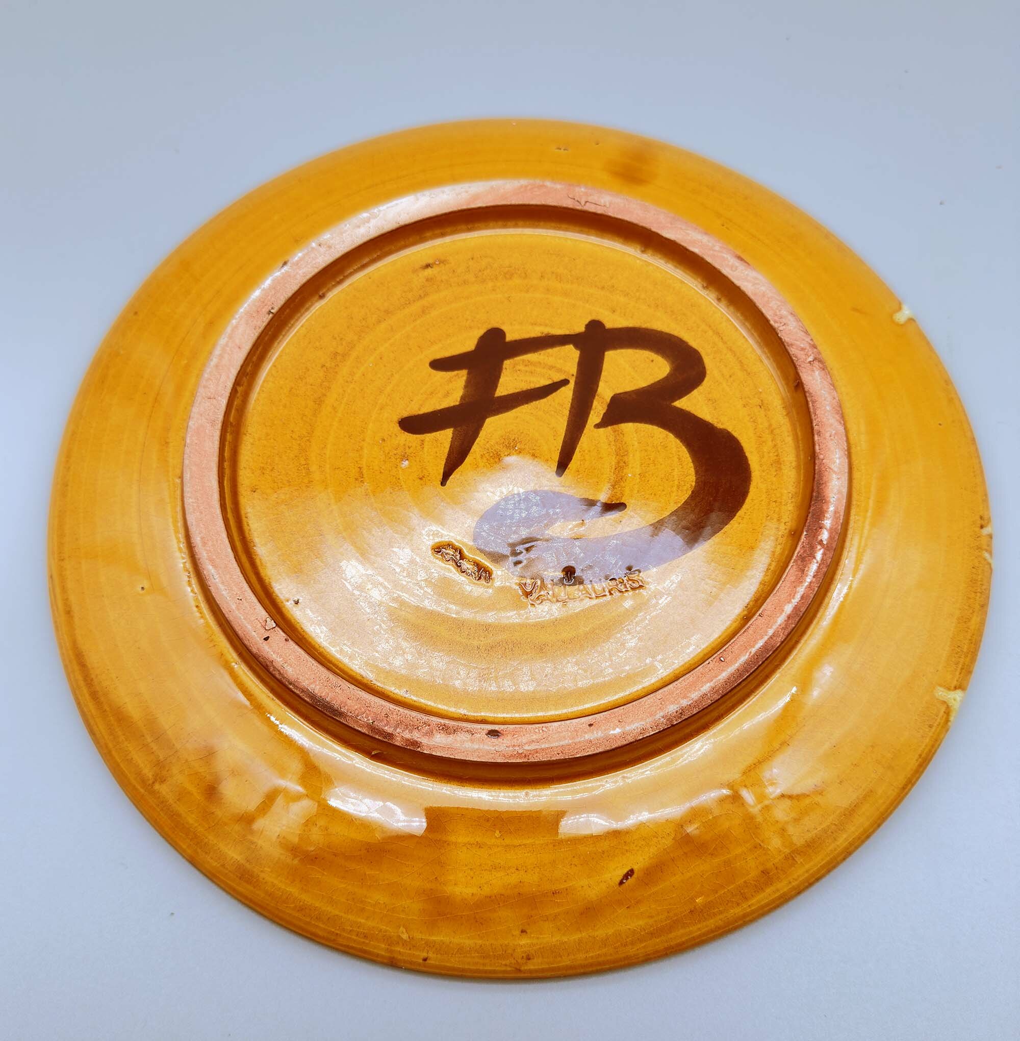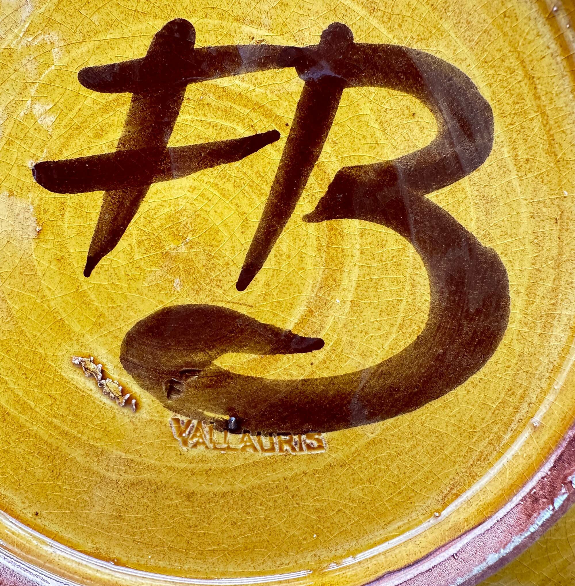 There are many items to be found with the Bongiovanni mark, usually a flowing ‘FB’ as here, but sometimes his first name, Francis, is written followed by ‘B’ and some pieces, probably the later ones, have an impressed script mark ‘F Bongiovanni’. Usually there is an impressed mark for Vallauris as well, which again occurs here. Little is known about him but much of his output comprised jugs and dishes although various serving sets were also produced including ones for tea and even fondue. The liqueur service seems to be the rarest of these and complete sets in perfect condition are not often found. The jug is almost double gourd in form with a flat circular stopper terminating in a cork which suggests its use for liqueur or spirits which would require an airtight seal. The thick glaze employs a variety of ‘splash’ effects in tones of mustard and brown with speckling in addition, a complex mixture to achieve. It trickles down unevenly towards the base, revealing the terracotta clay of the body which is also seen on the foot rim. The interior of the base is glazed and has a stamped mark ‘Vallauris’ with the initials ‘F’ ‘B’ boldly written in black. The six cups, with broad ovoid bodies and flaring rims, complement the form of the jug and the set is completed by the circular tray, glazed at the back apart from the foot rim and similarly marked as the jug. Both the cups and the tray also employ similar glaze effects with the distinctive speckling.