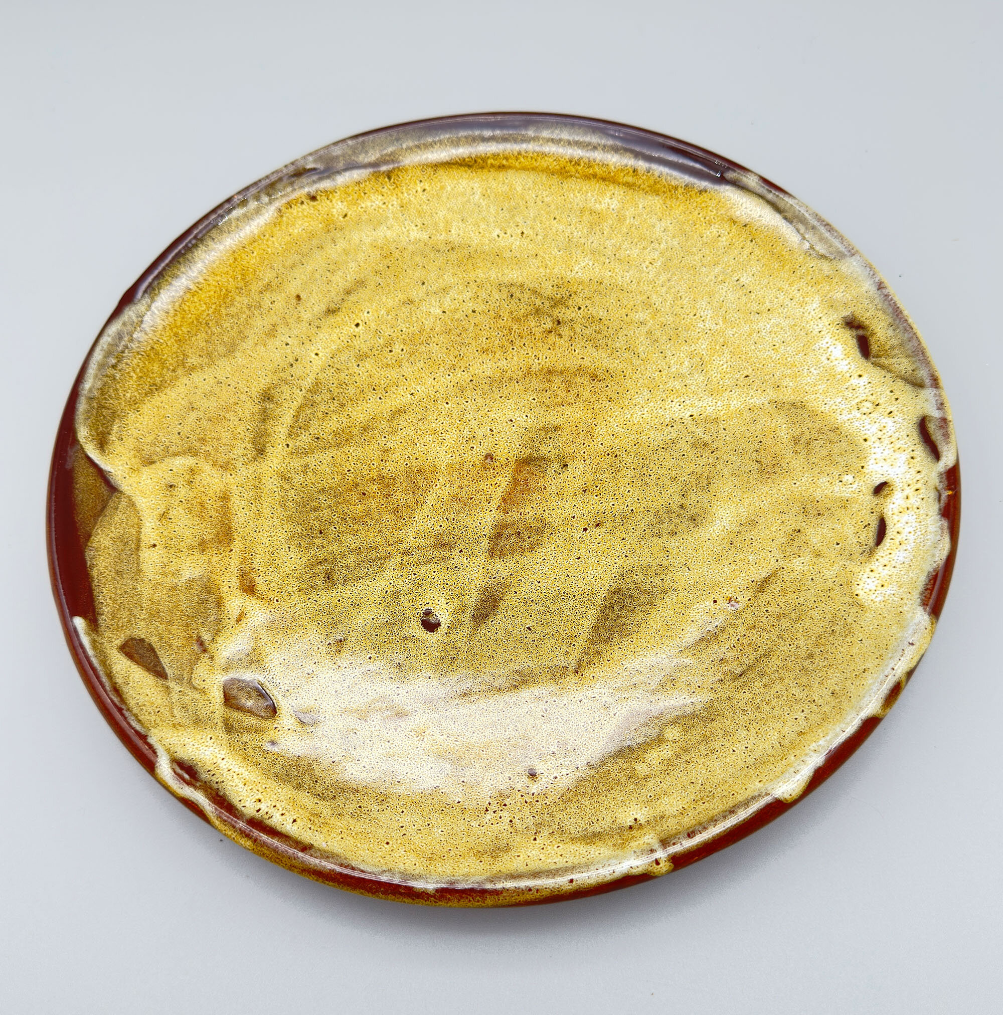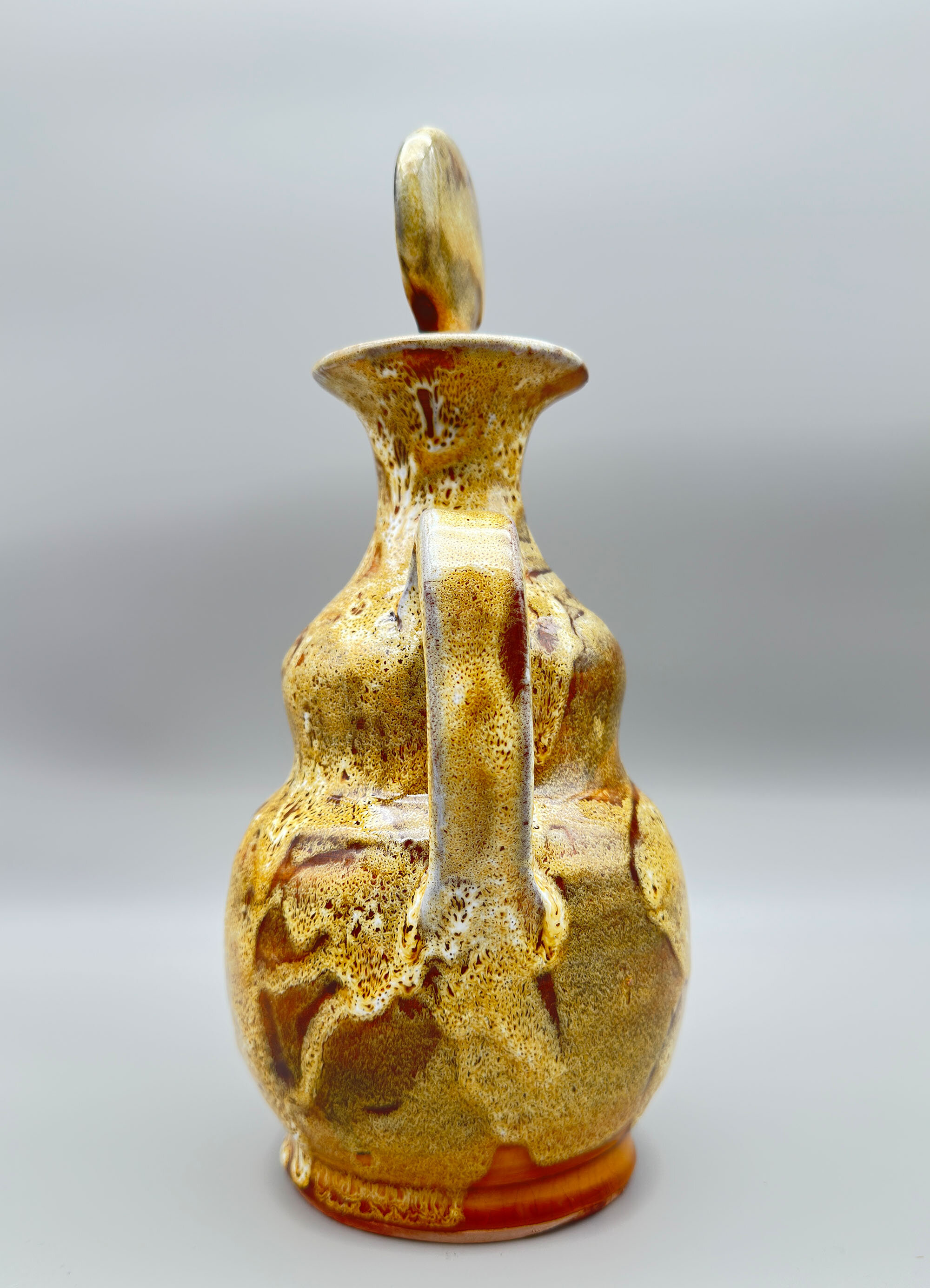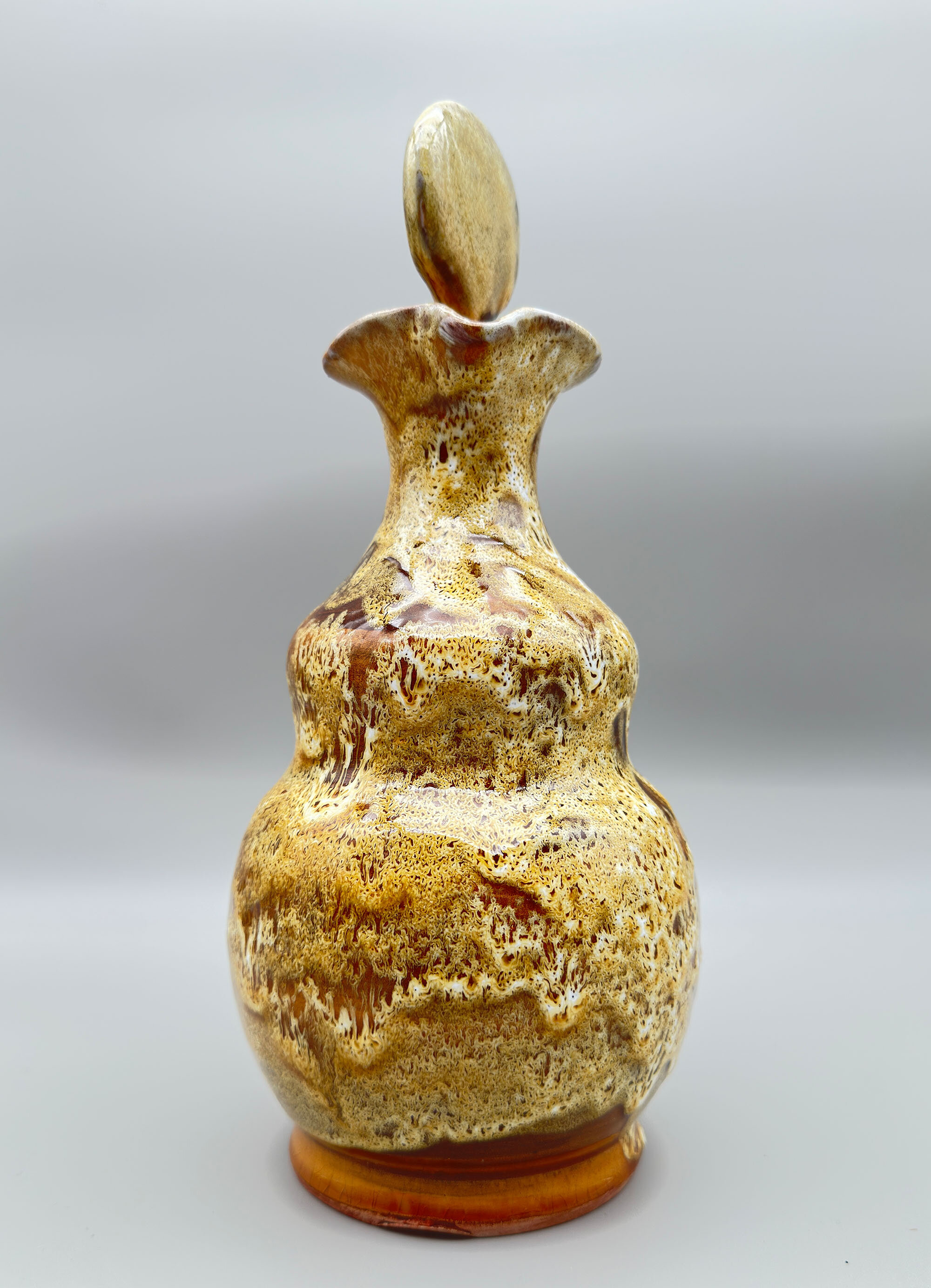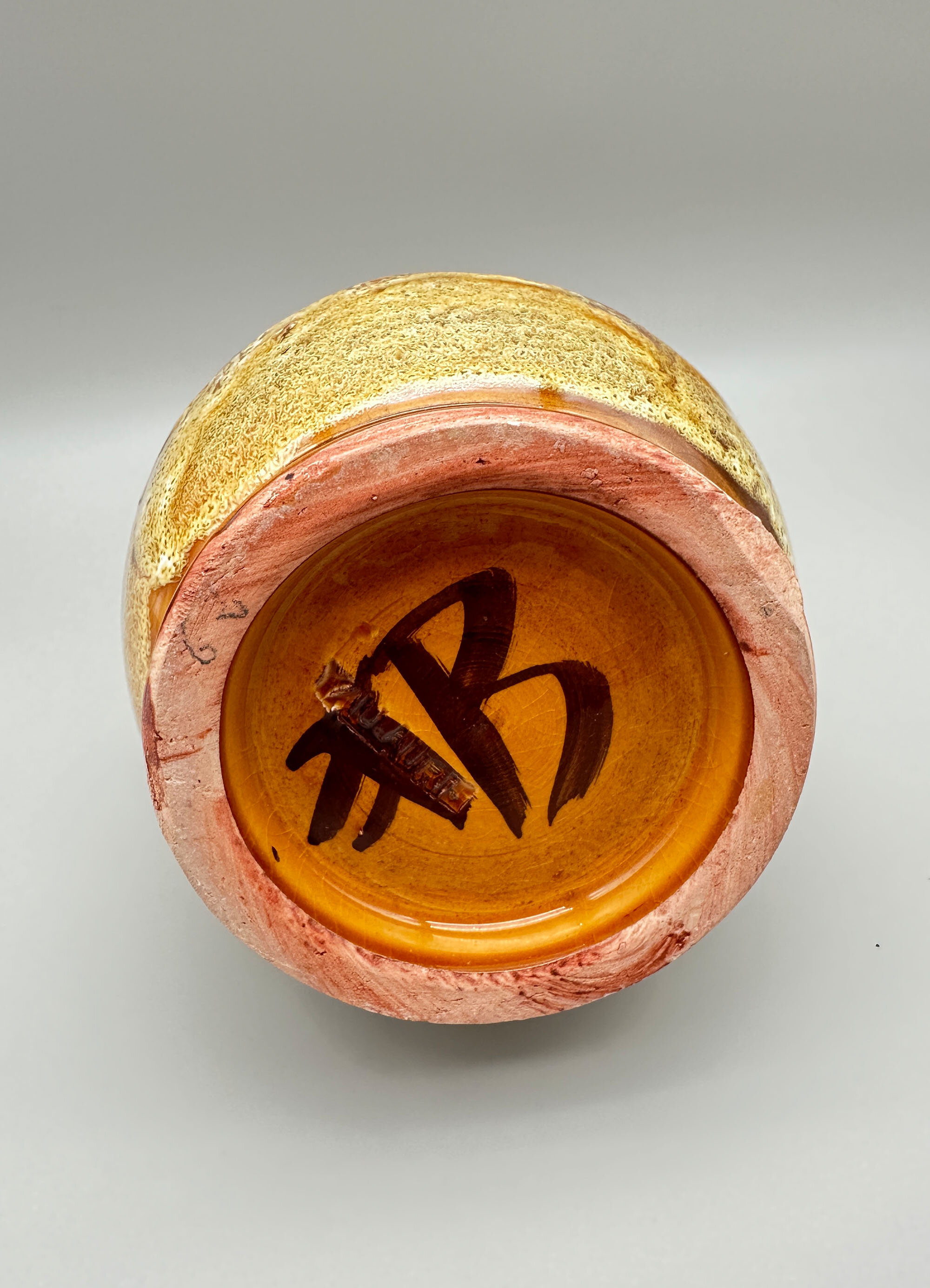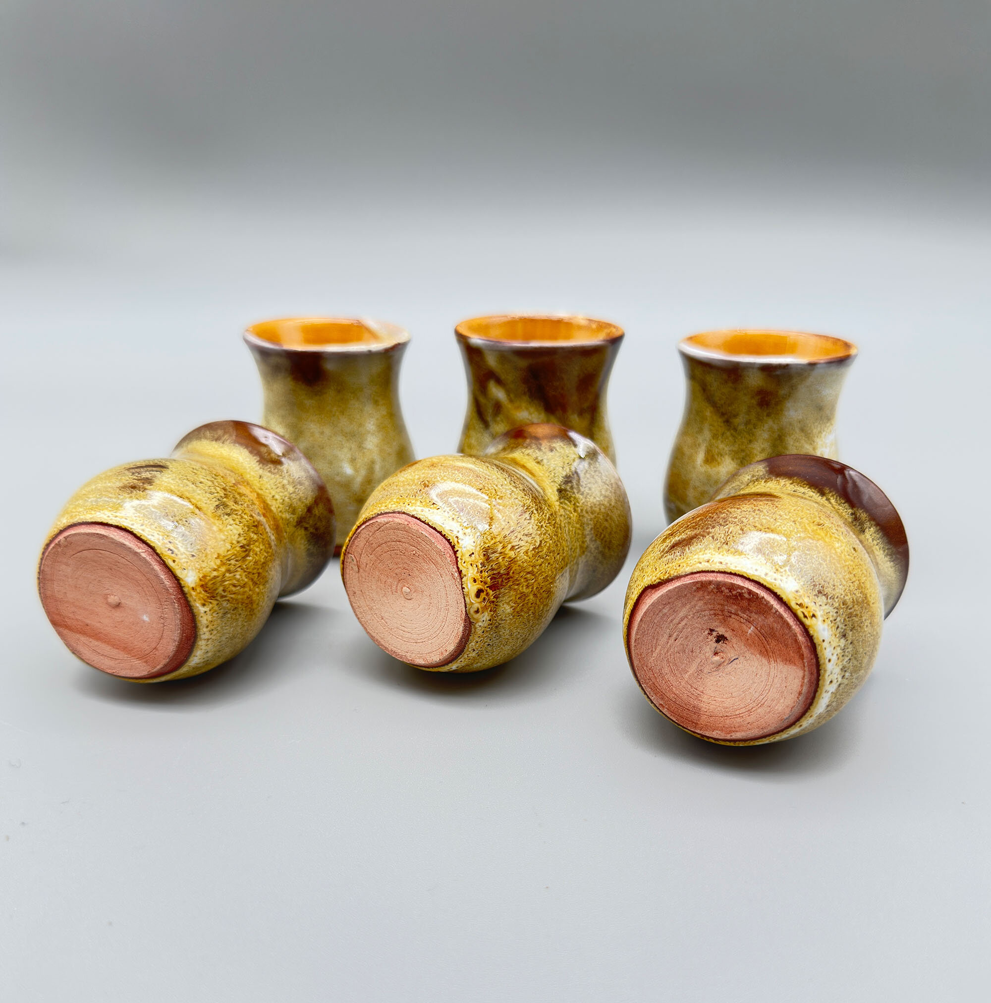 There are many items to be found with the Bongiovanni mark, usually a flowing ‘FB’ as here, but sometimes his first name, Francis, is written followed by ‘B’ and some pieces, probably the later ones, have an impressed script mark ‘F Bongiovanni’. Usually there is an impressed mark for Vallauris as well, which again occurs here. Little is known about him but much of his output comprised jugs and dishes although various serving sets were also produced including ones for tea and even fondue. The liqueur service seems to be the rarest of these and complete sets in perfect condition are not often found. The jug is almost double gourd in form with a flat circular stopper terminating in a cork which suggests its use for liqueur or spirits which would require an airtight seal. The thick glaze employs a variety of ‘splash’ effects in tones of mustard and brown with speckling in addition, a complex mixture to achieve. It trickles down unevenly towards the base, revealing the terracotta clay of the body which is also seen on the foot rim. The interior of the base is glazed and has a stamped mark ‘Vallauris’ with the initials ‘F’ ‘B’ boldly written in black. The six cups, with broad ovoid bodies and flaring rims, complement the form of the jug and the set is completed by the circular tray, glazed at the back apart from the foot rim and similarly marked as the jug. Both the cups and the tray also employ similar glaze effects with the distinctive speckling.