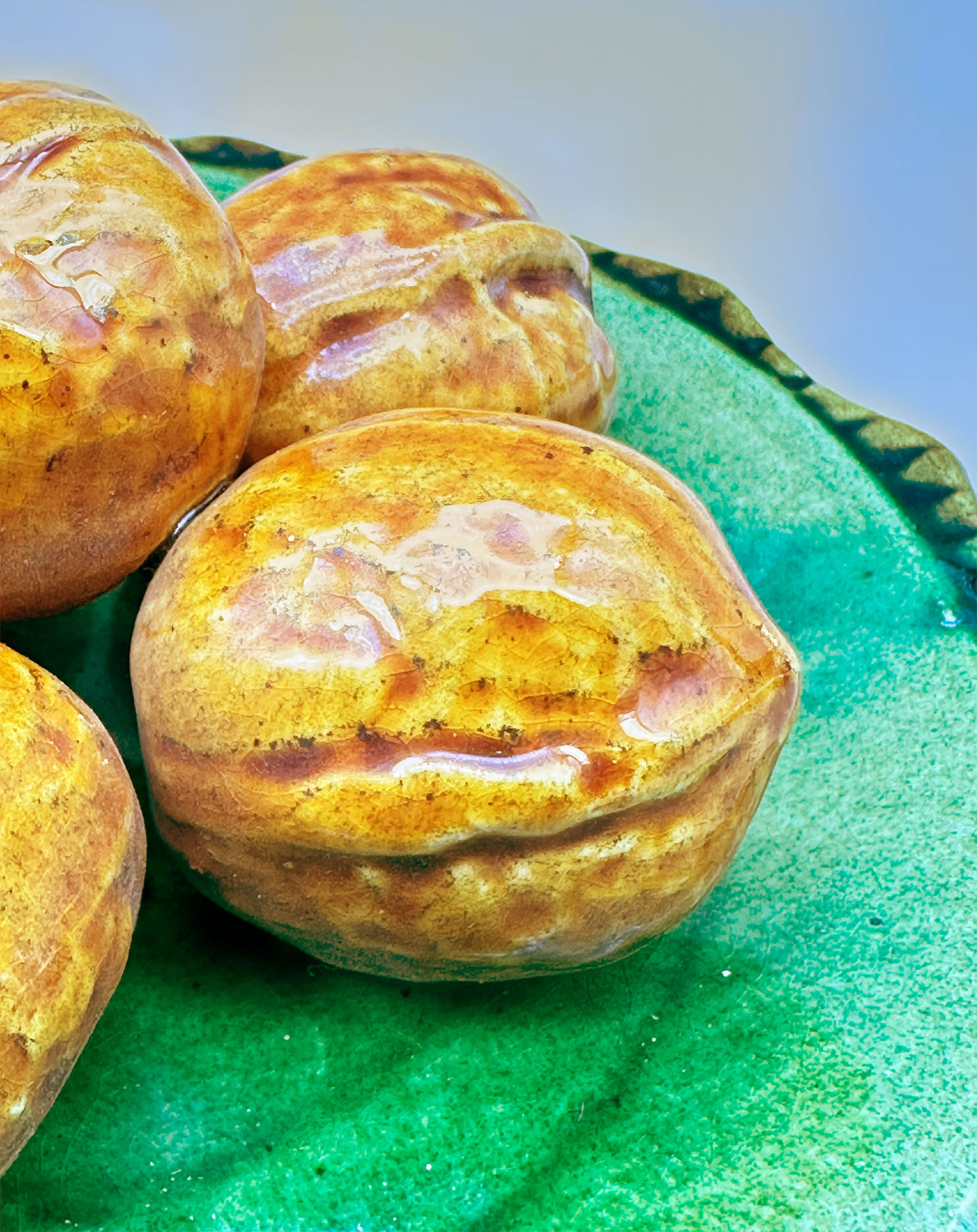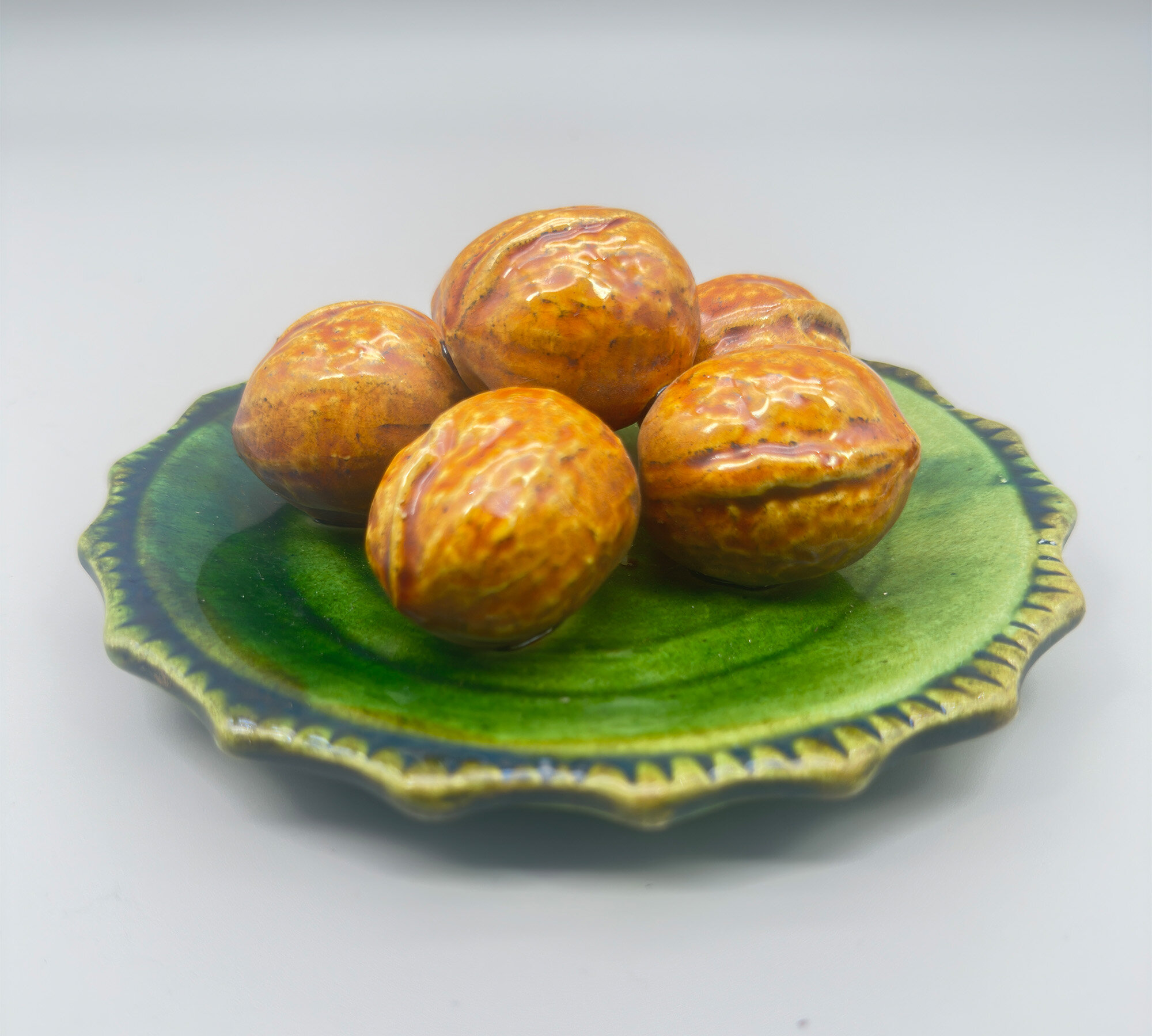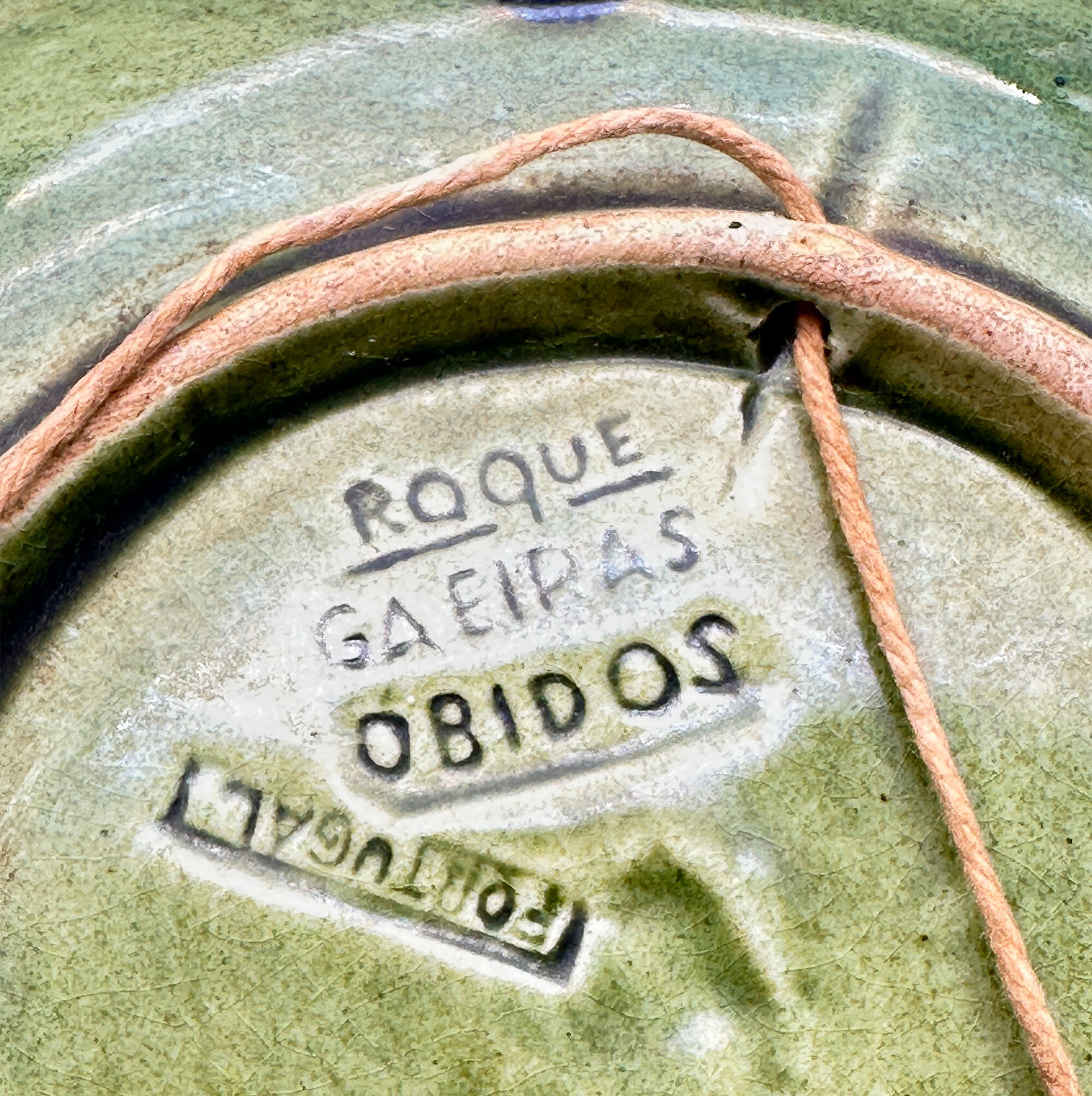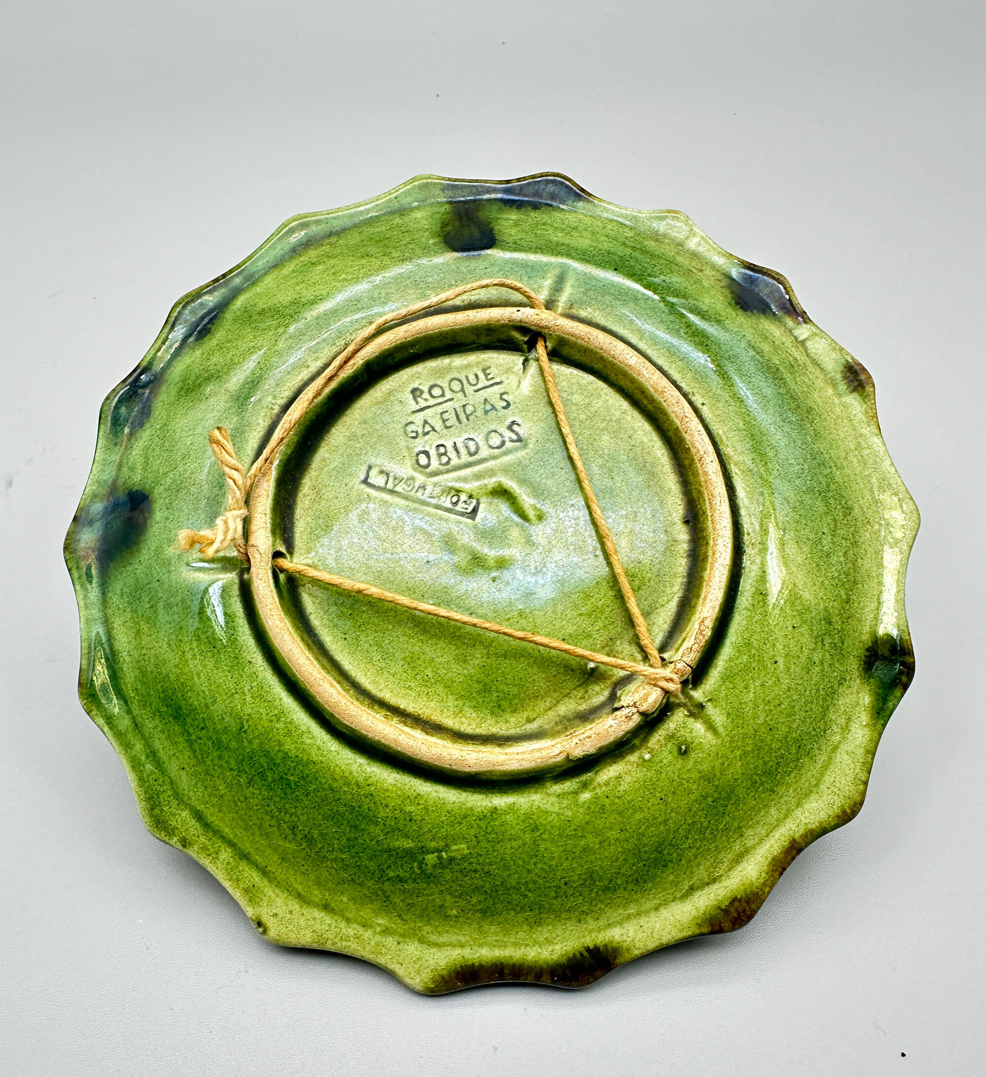 A ceramic dish, brightly glazed in the majolica style with a trompe l’oeil representation of walnuts resting on the surface, the base pierced for hanging and with impressed marks ‘Roque’ ‘Gaeiras’ ‘Obidos’ ‘Portugal’. Roque Gaeiras was a producer of pieces termed majolica although the glaze effects used here are a very distant relation to the early tin glazed Italian and Spanish wares which share the name. Nineteenth century majolica made in England and the continent employed a wide variety of brightly coloured glazes applied to an extensive range of elaborate forms and sometimes looking back to the productions of the famous sixteenth century French ceramicist, Bernard Palissy, who specialised in producing platters with naturalistic wildlife designs including snakes and lobsters surrounded by plants (see image 8). Gaeiras made similar wares but also this simpler design with a small pile of walnuts. Obidos, where his pottery was situated, is in the Oeste region to the north of Portugal about an hour’s drive from Lisbon and with substantial mediaeval remains (see image 7). Gaeiras produced his majolica ware there in the second half of the twentieth century and produced many pieces which successfully recreate those of his celebrated predecessor.| Size: | Width (max) 15cm, Ht 5.5cm, Base 8.2cm |