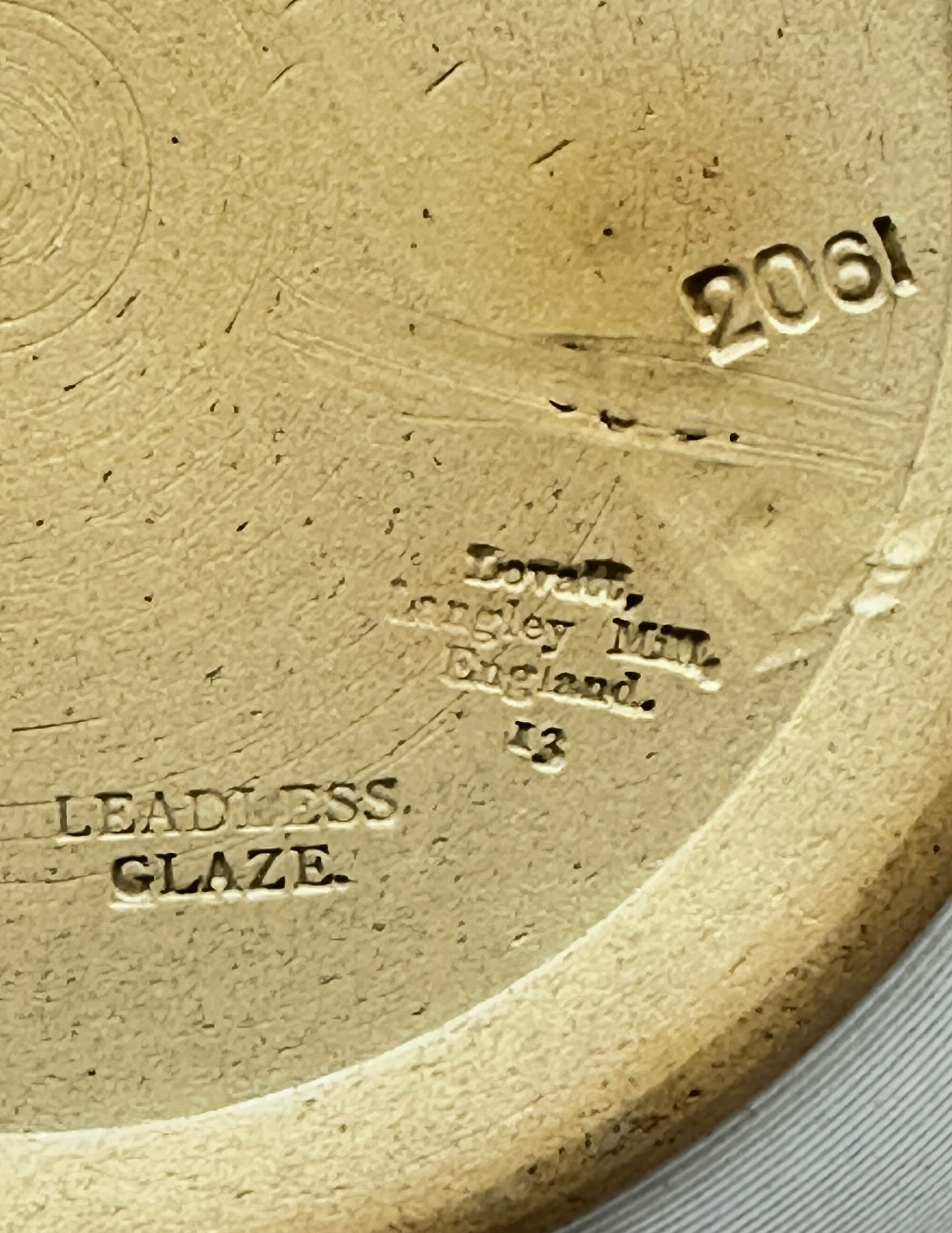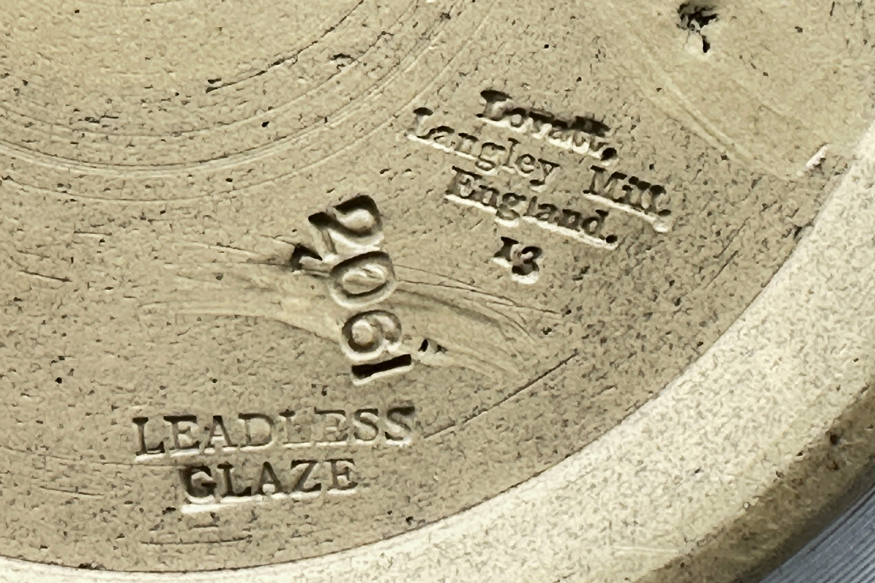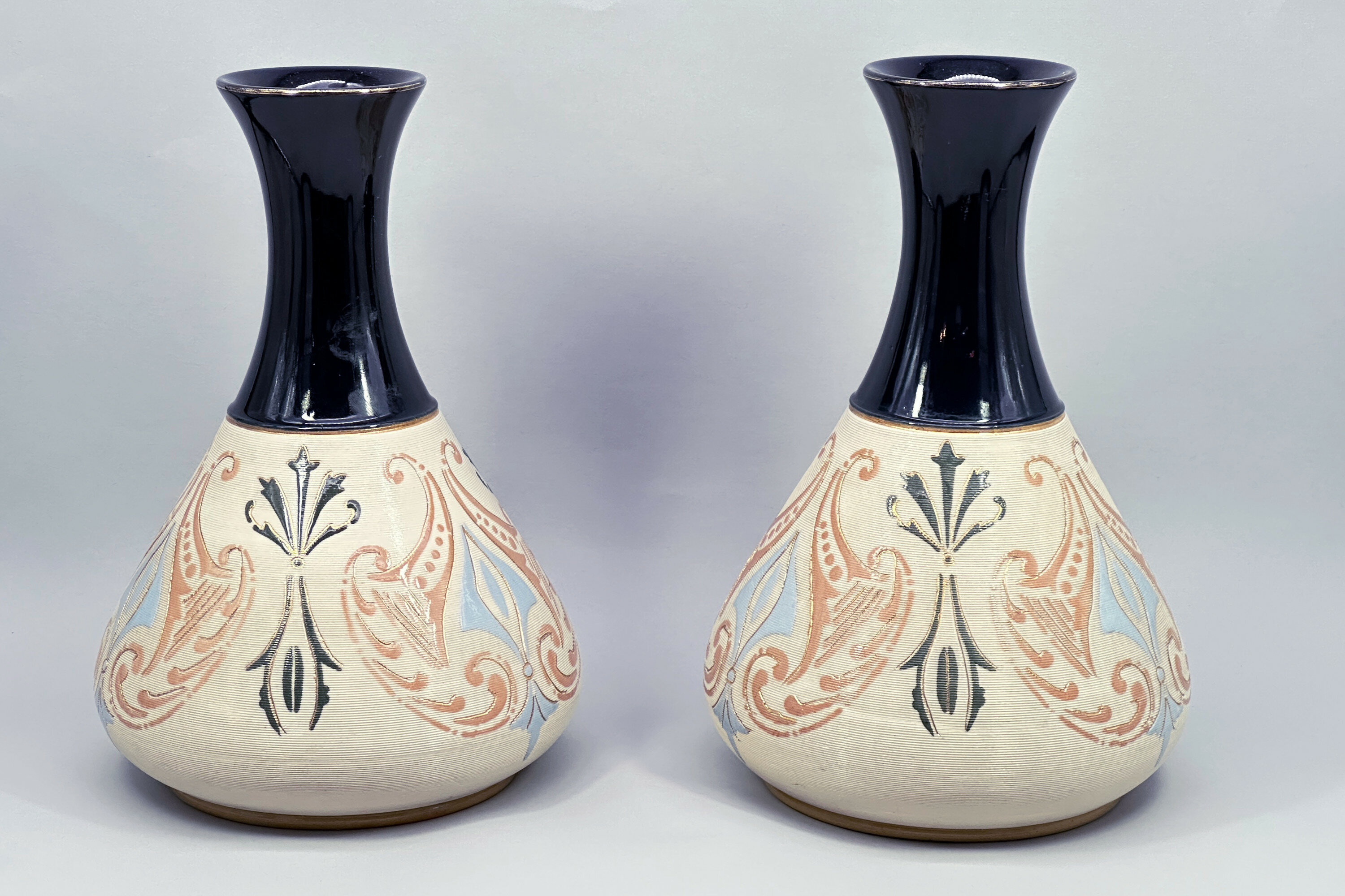 The Langley Mill Pottery was located in Langley Mill, Derbyshire on the Derbyshire – Nottinghamshire border. From its establishment in 1865 to its final closure in 1982, it went through five distinct periods of ownership, producing a wide range of stoneware ranging from utilitarian items and to high quality art pottery. This pair of vases dates from the third company that traded there, Lovatt and Lovatt. The Lovatt family had entered into partnership with the owner of the founding business at Langley Mill, James Calvert. From 1895 the business was in sole control of the Lovatt family and traded as ‘Lovatt and Lovatt’ until 1935. The early years of the twentieth century proved to be something of a zenith for them and a wide range of art pottery pieces were made which enjoyed great popularity. Production techniques were streamlined without a reduction in quality and in 1905, leadless glazes were introduced. These are proudly announced on the base of this pair of vases which are a fine example of the Lovatt and Lovatt style and probably date to 1913, indicated by the impressed numbers for that year.
