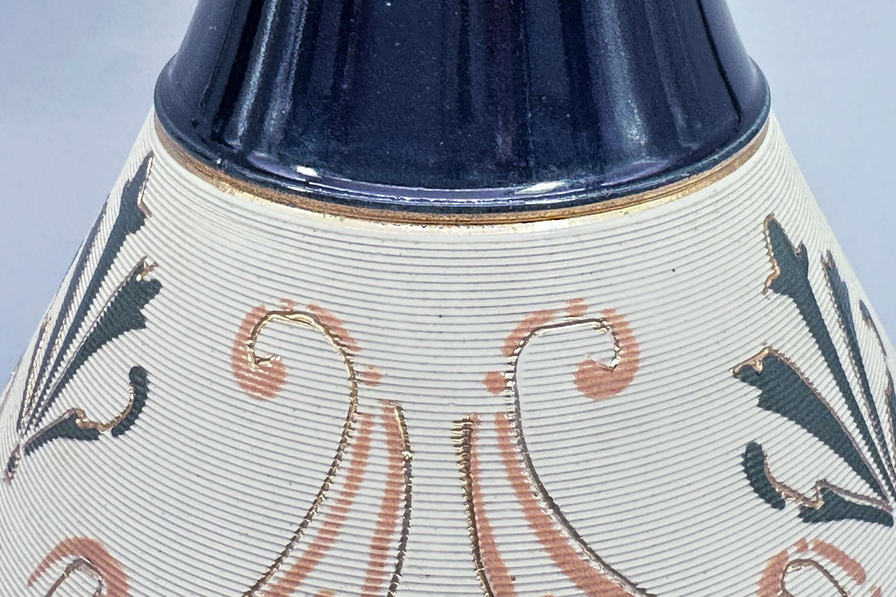 A pair of earthenware vases of broad conical ovoid form, with narrow concave necks and a slightly flaring rim, the bodies decorated with stylised floral arabesques on a cream ‘threaded’ ground, the necks and interior rim in blue and the bases unglazed with impressed marks ‘Lovatt’, ‘Langley Mill’, ‘England’, ‘13’ and impressed numbers ‘2061’ with ‘LEADLESS GLAZE’ slightly below.