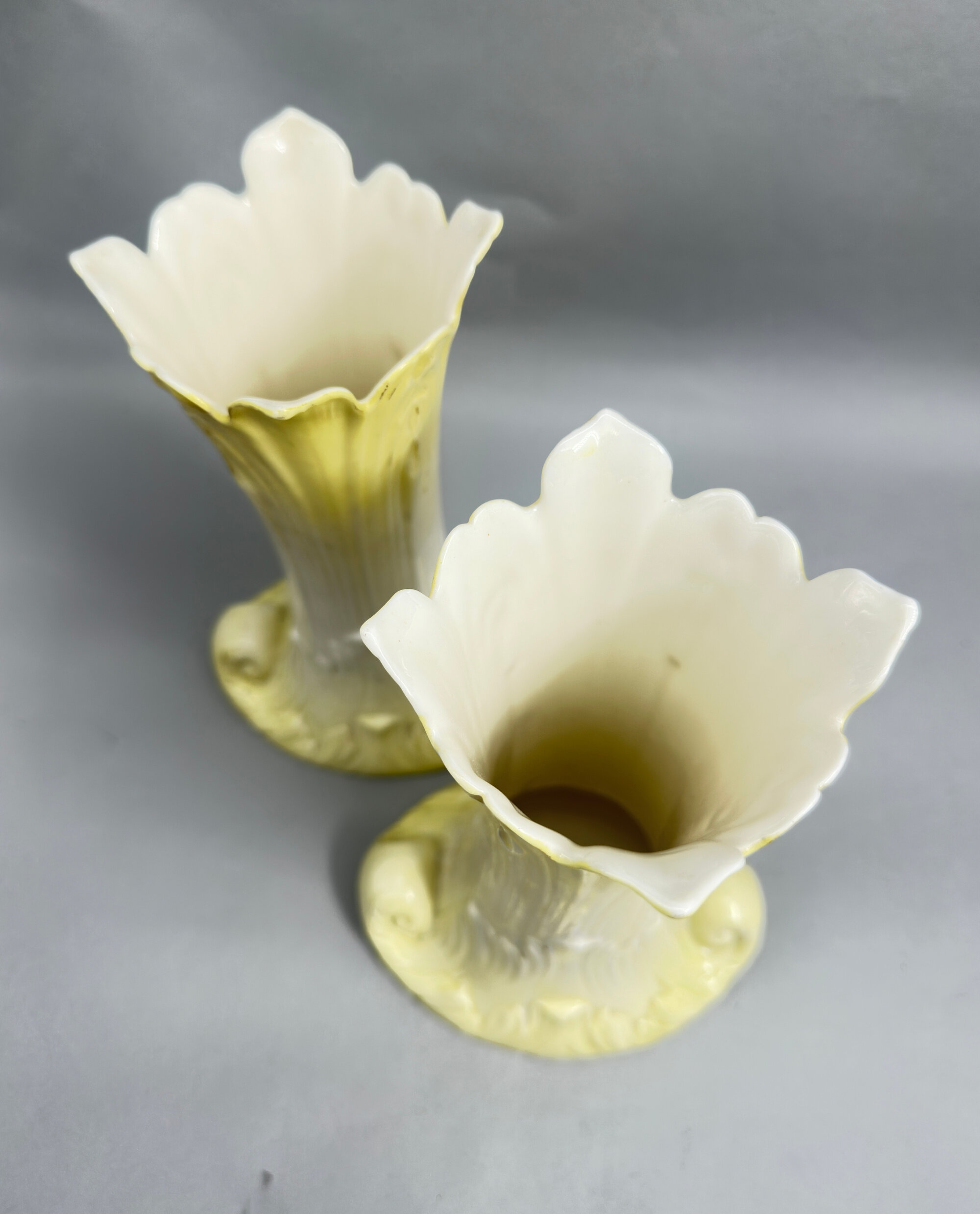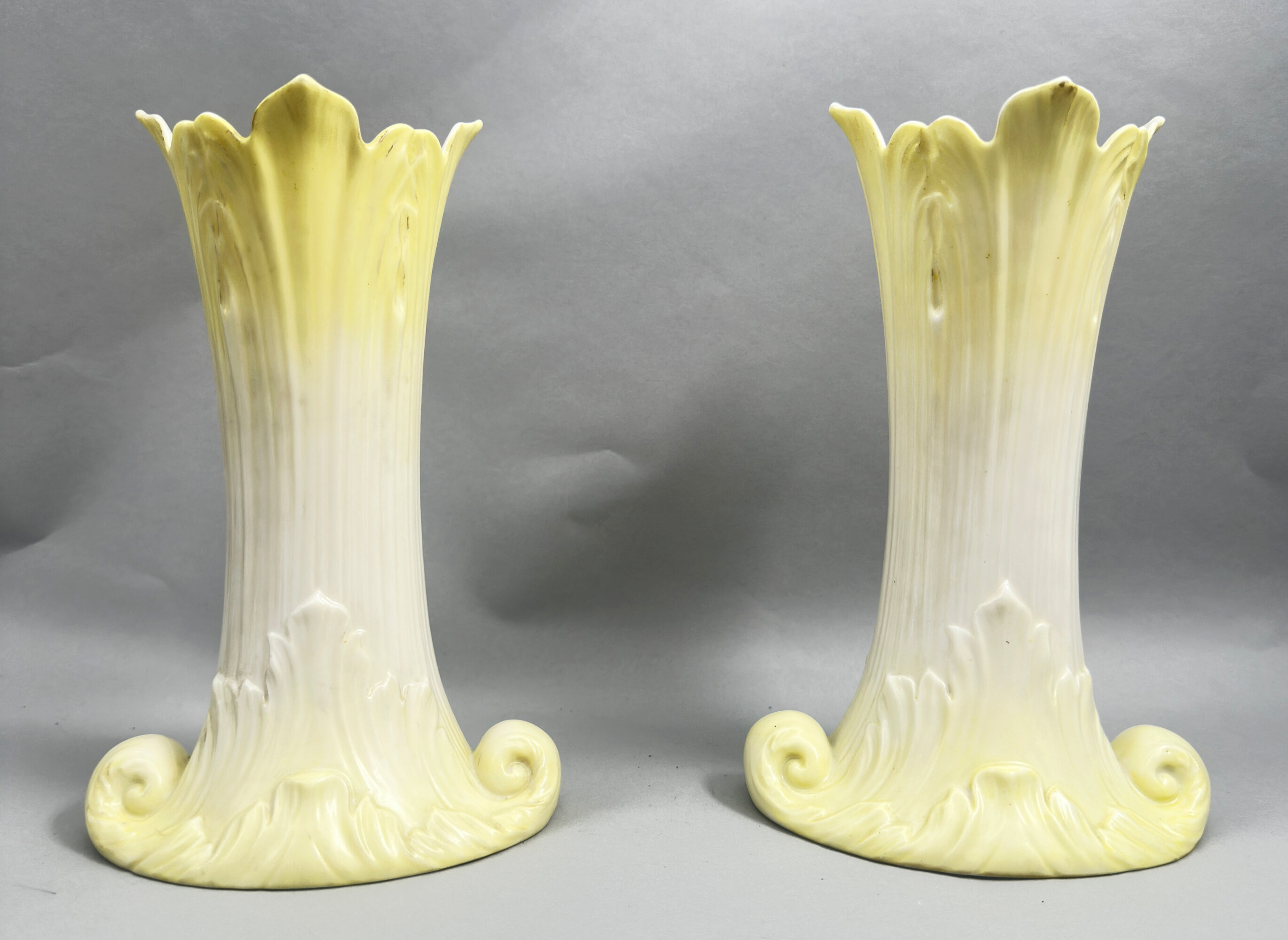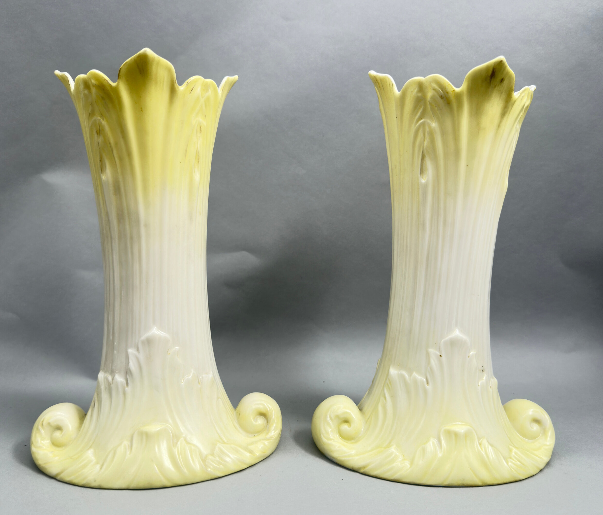 A pair of Vases of ovoid organic form, the concave bodies with flaring necks and spreading bases all modelled as stylised leaves, the cream coloured glaze at the centre merging into yellow at the top and bottom, the bases glazed white with identical printed marks, a shield with the wording ‘G&Co Established 1801’ surrounded by a circle of words ‘Royal China Works Worcester’ with below ‘.England.’ ‘L’ ‘973’ ‘G’ (separated by a line).The influence of the Art Nouveau movement, with its emphasis on organic and plant forms, is clearly seen here. The vases date to the early 1900s and were made by the ‘Grainger and Co’ branch of the celebrated Royal Worcester factory. The first porcelain factory at Worcester was set up in 1751 by John Wall (a doctor) and William Davis (an apothecary), along with 14 other businessmen. Fifty years later in 1801 Thomas Grainger (1783–1839) started a rival company ‘Grainger’s Worcester Porcelain’ and during the nineteenth century both companies traded successfully. However following the death of George Grainger, the son of Thomas Grainger, in 1889 the Grainger factory was sold to Royal Worcester who continued manufacture on its old rival firm’s St.Martin’s Gate site until finally closing the works in 1902. Ivory style porcelains were one of the specialities of this brief manufacturing period and the date mark ‘L’ which appears on these vases is for the year 1902, just before the two concerns were completely merged.