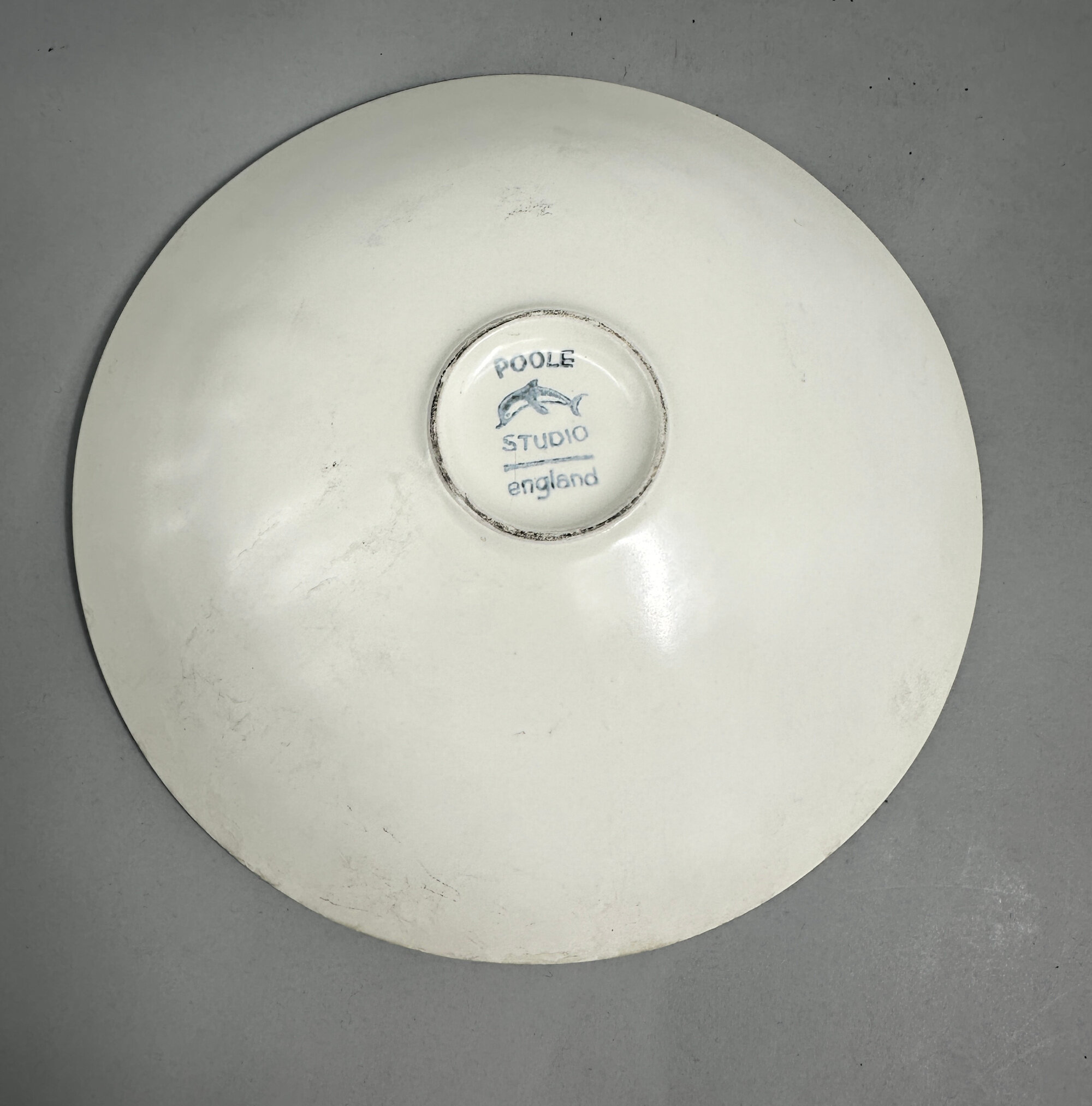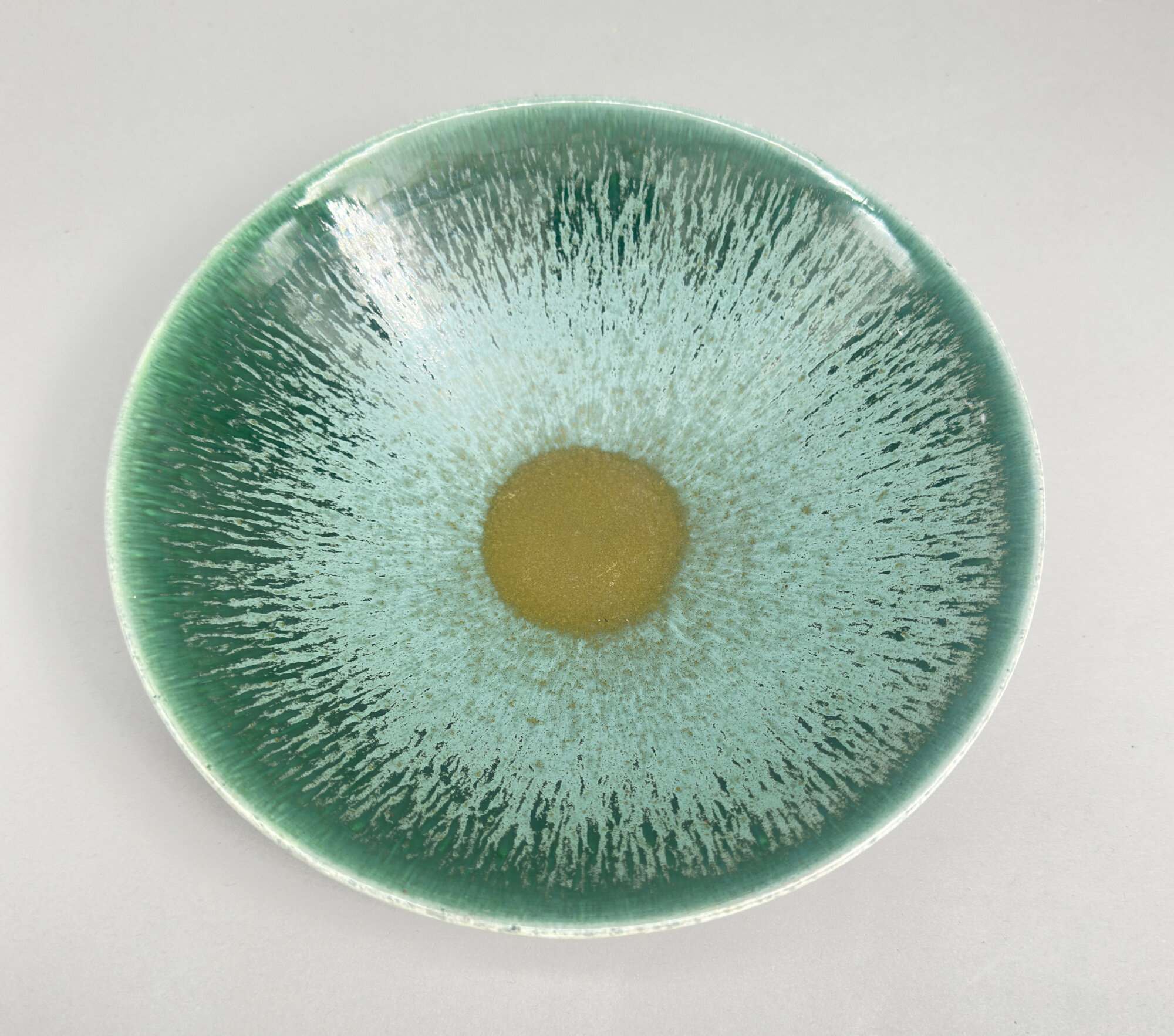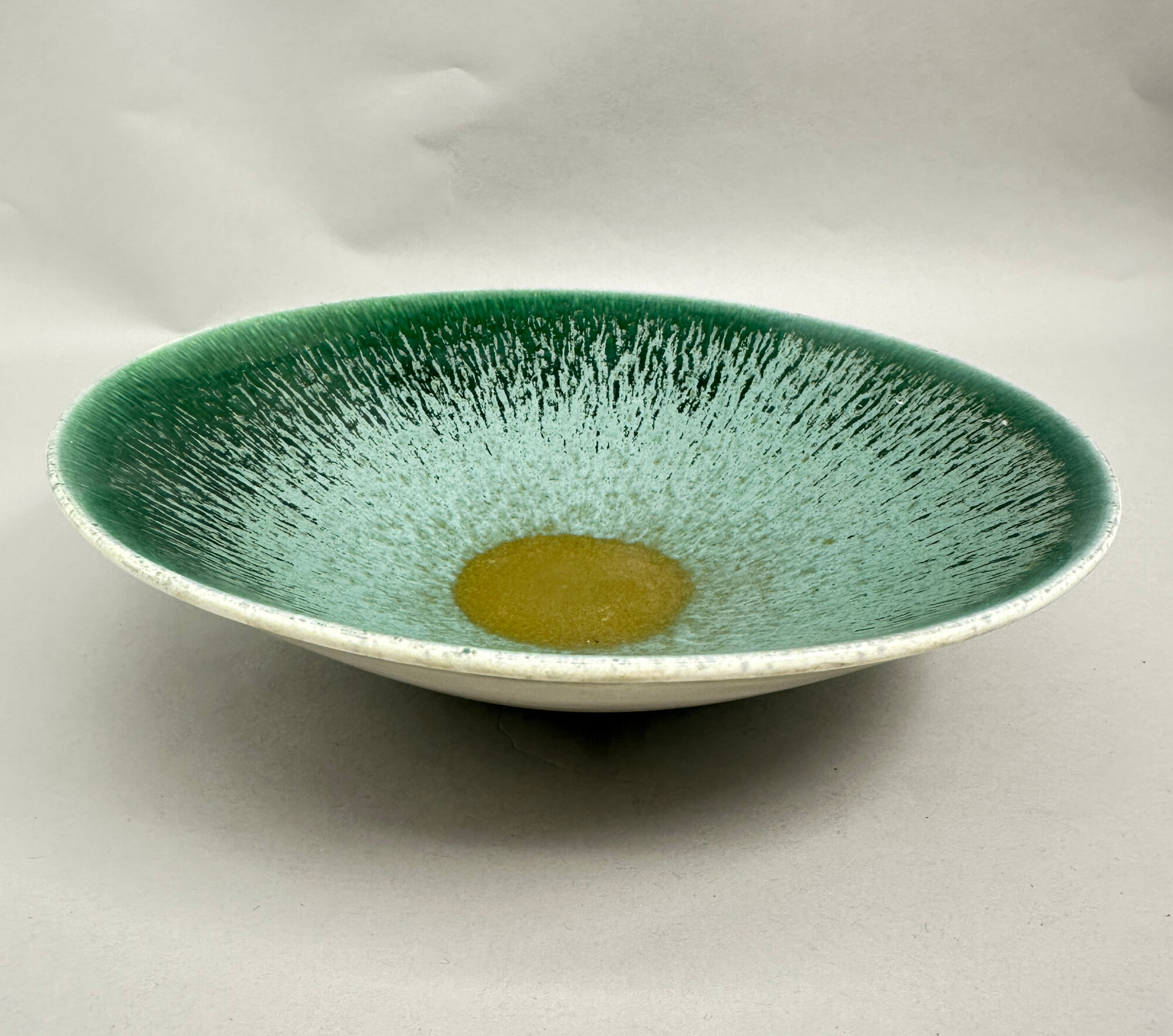 A shallow bowl of flattened near inverted conical form, the surface decorated with light green splash glazes on dark green splash glaze ground surrounding a central speckled gilt glaze disc, the reverse plain with a dark cream glaze and underglaze blue marks to the centre of the foot ‘POOLE’ ‘STUDIO’ ‘england’ separated by a dolphin and a line respectively.Both the form and some of the glaze effects here reflect much earlier Chinese ceramic pieces which is fully consistent with the ‘studio pottery’ style of this piece. Poole Pottery established an art pottery studio within their factory in 1958 which, following the Scandinavian model, produced high quality studio ceramics alongside designs for new ranges until 1966 when they were replaced by the new Delphis, Atlantis and Aegean pottery lines which began production a year later. Dating here is therefore fairly precise and this bowl is an excellent example of ‘studio’ wares produced which could often equal the work of other independent studio potteries.