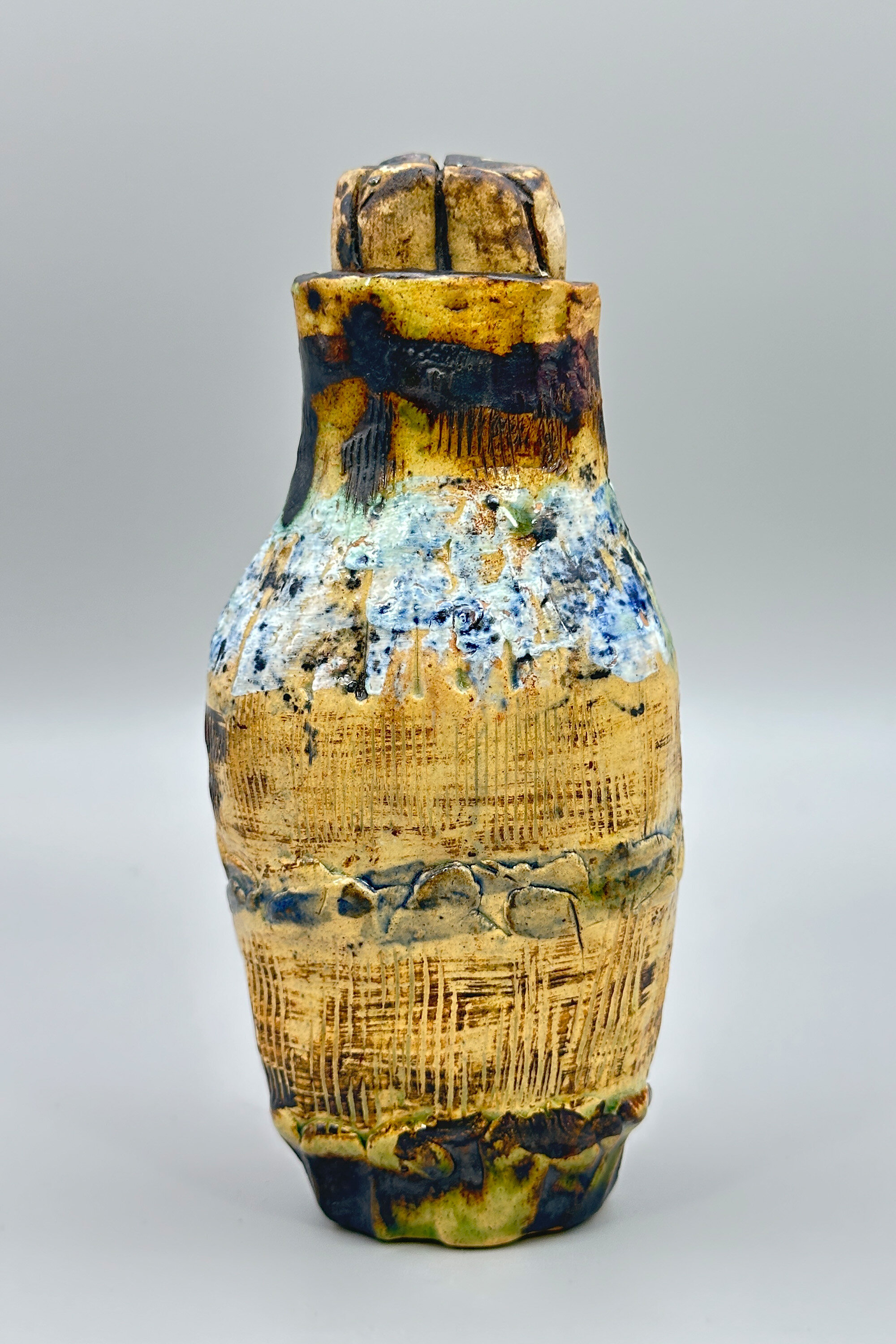 Primitive studio pottery Flask and Cover, signed, possibly Allison Weightman, C20th