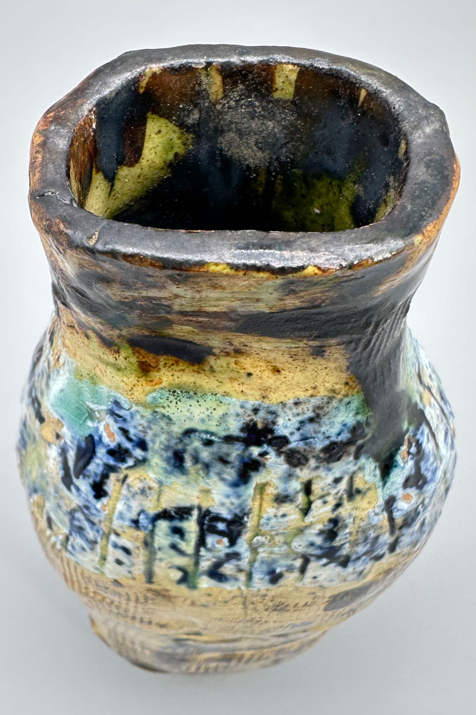 This is a primitive, almost rustic, stoneware flask and cover the body of rounded flattened ovoid form with a short neck and the stopper of an ill defined shape with notching at the top, matt glazed in browns and mustard with scratch pattern decoration and three irregular bands of splash glaze at the shoulder centre and base in blues, greens and browns, the glaze at the bottom dripping over onto the unglazed base and with an impressed mark. The mark seems to resemble that of the potter Allison Weightman (born 1963; see image 11) who specialises in decorative wares in raku, stoneware and porcelain and also sculptural wall pieces, for which this might have been a test piece since nothing else like it seems to be on the market at the moment. The illustration of her mark, which apparently depicts impressed sheep vertebrae at ‘British Studio Potters’ Marks’ by Eric Yates-Owen and Robert Fournier (2nd edition 2005 p526) is very similar to what we have here (see image 10) and while apparently ‘one off’ this flask is consistent with other pieces by her which have been described as follows ‘Allison creates hand-built vessels and forms that relate to her love of the natural environment. The rich depths to her glazes are achieved through her development of multi-layering and multi-firing the work she produces.’ (Edinburgh Design School website).| Size: | Ht (overall) 15.2cm (flask) 13.5cm, Stopper 2.8cm, Width (max) 6.8cm, Depth (max) 5cm, Base 4.2cm x 3.5cm (max) |