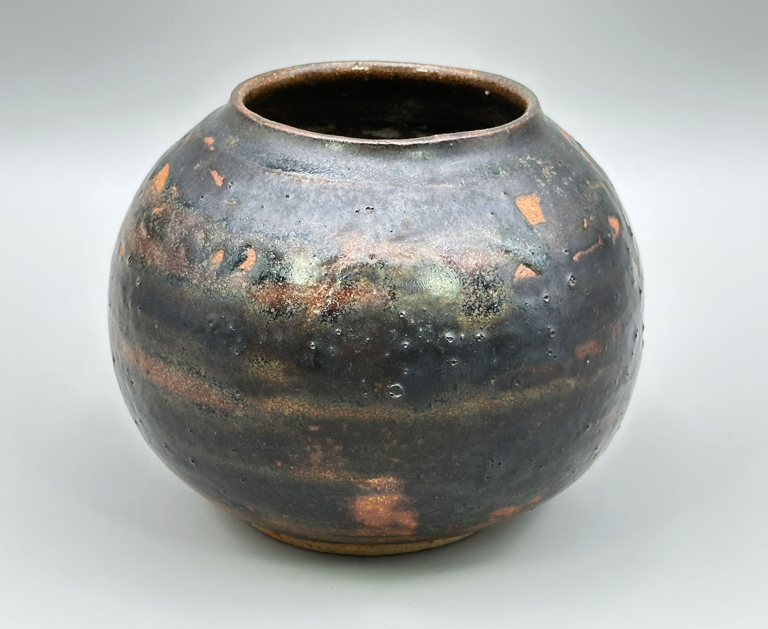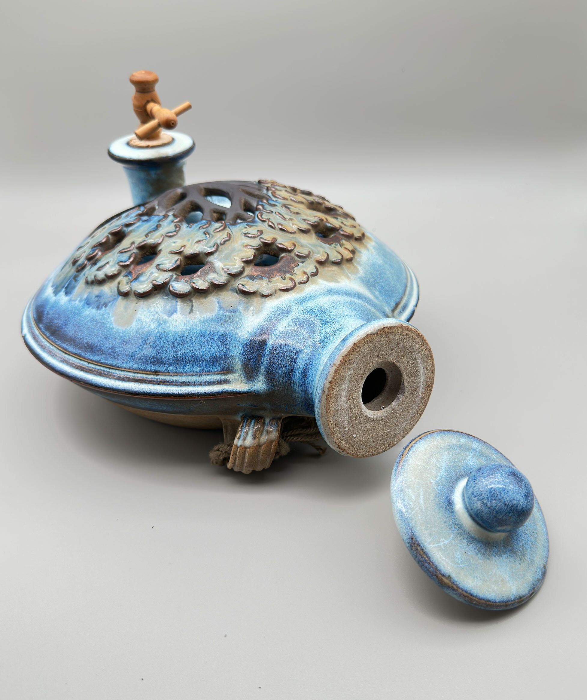 A stoneware ceramic wall flagon or vase, the body circular and glazed to the front and the top of the back in a mottled blue, the centre with a polychrome raised and modelled design of a tree, the base with a circular tap and cork spigot, the top with a circular screw thread cover and knob finial, the back unglazed with a textured effect, with two ridged loop handles for hanging (fitted with the original cord) and an impressed circular mark ‘SE’ along with the price tag (£110.00) and the address of the Shepherd’s Well Pottery.Simon Eeles was one of the two sons of David and Patricia Eeles who started the studio Shepherd’s Well Pottery in Hampstead, London in 1955, moving to Mosterton, Beaminster, Dorset in 1962, see ‘British Studio Potters’ Marks’ by Eric Yates-Owen and Robert Fournier (2nd edition 2005 p152). Simon began working with his parents in 1979 and was to soon specialise in stoneware although in later years he took an interest in the Japanese ‘raku’ type glazes for which he gives demonstration classes today. His earlier stoneware pieces seem to have focused on decorative utility items and do not appear to be commonly available now. Priced in the 1980s/1990s at £110 this wall flagon was clearly something of a demonstration piece at the time and remains so today.
