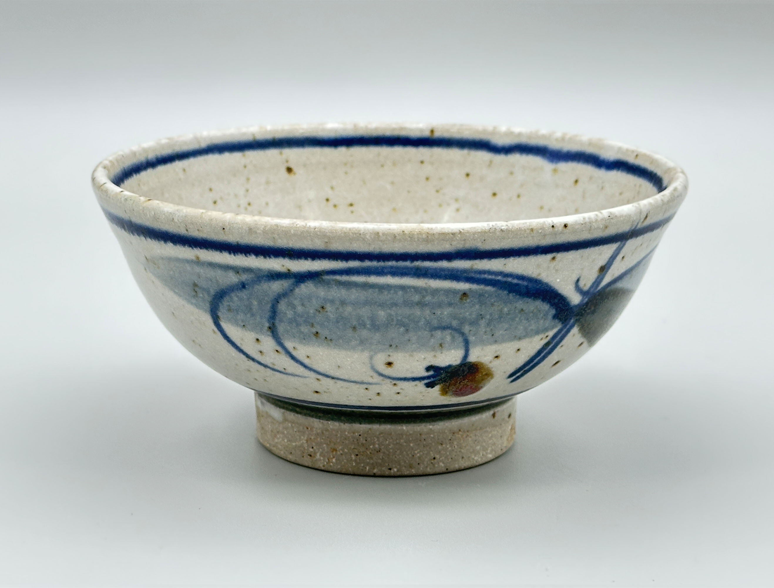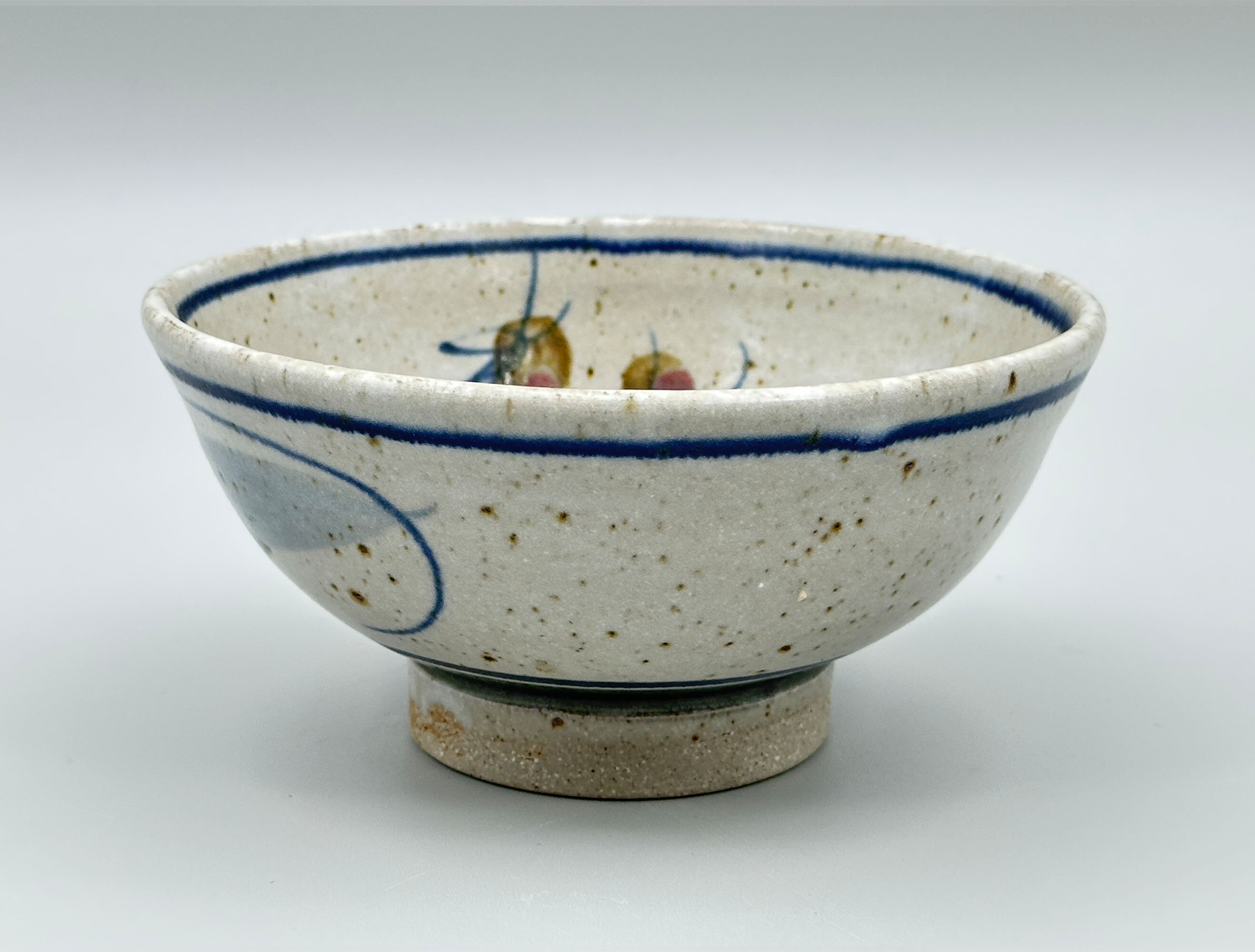 This is an elegant studio pottery bowl, the deep incurving sides above a short cylindrical foot, covered overall in an off white speckled glaze with decoration in blue, dark ‘copper’ red and grey, the exterior with leaves and berries sprouting from a branch and blue circles with a grey border, the interior with in blue, the interior with two blue circles, two berries and a grey roundel at the centre, the base with a small impressed mark.