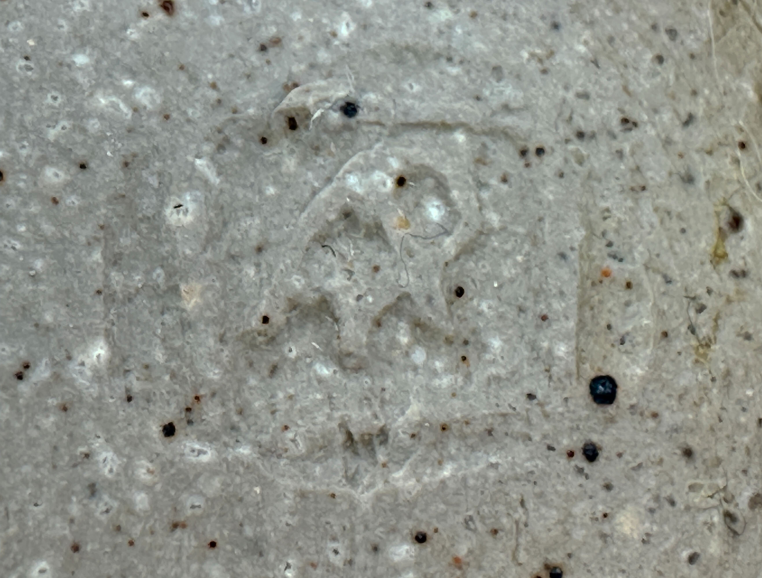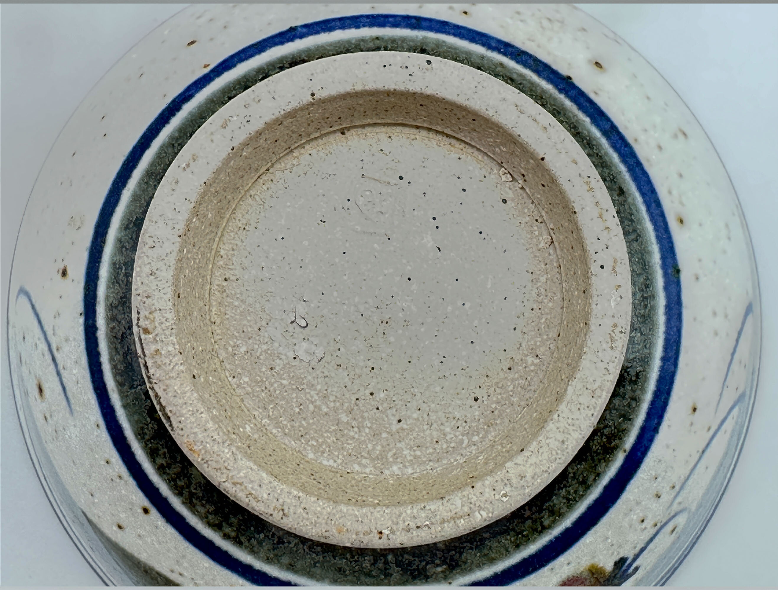 While it is not absolutely certain the mark on this piece is possibly that of Derek Clarkson (1928-2013). Clarkson trained at the Manchester college of Art between 1944-47 and Burnley School of Art from 1959-61 and then combined a successful lecturing career with the making of his own work which is now to be found in international and private collections including the Victoria and Albert Museum, London. In 1980 he retired from lecturing to focus on his work as a potter, continuing to produce pieces of great skill and attraction until his death in 2013. There are other pieces signed by him which strongly resemble the bowl here (see images 11,12) making it a possibility that this is his work. Certainly, the potter who created this piece and impressed his mark at the bottom was clearly accomplished and this bowl is more than worthy to stand comparison with pieces by more famous contemporaries.