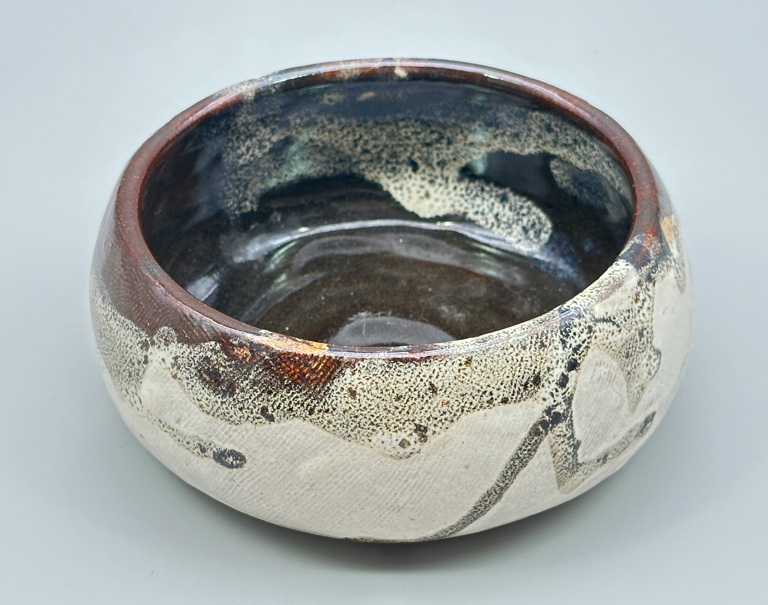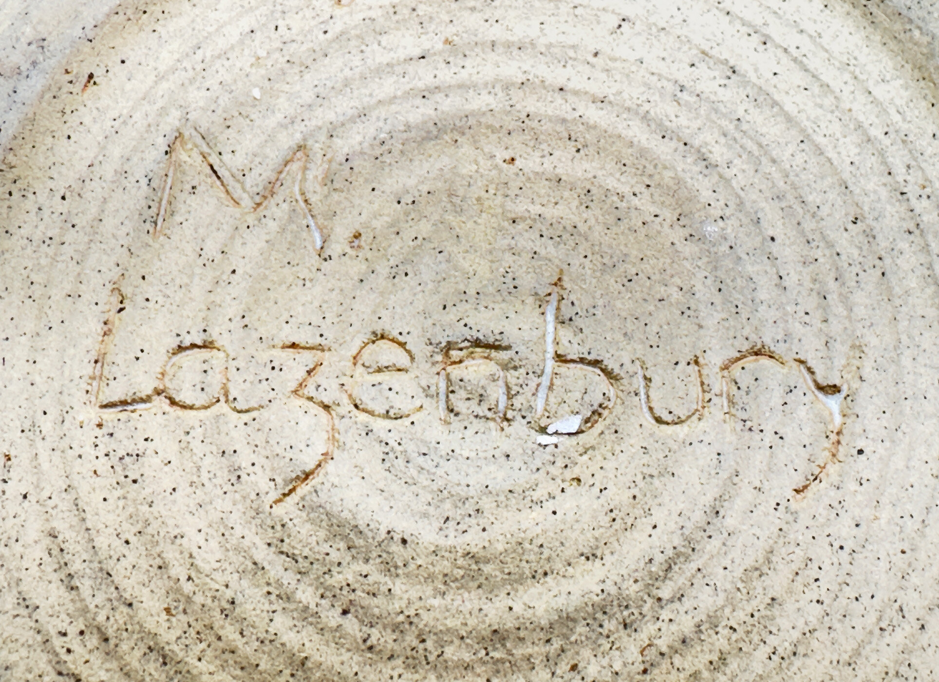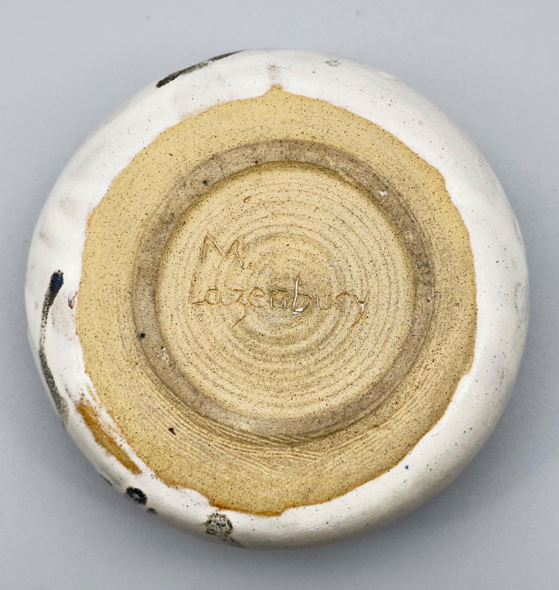 A studio pottery circular bowl, the walls incurving towards the top and base, the exterior glazed in cream with comb line markings with highlights in grisaille and brown splash glazes, the interior predominantly glazed in brown and the base unglazed, showing the stoneware body with pronounced potting rings within the foot and an incised signature ‘M.Lazenbury’. For the time being the potter of this piece can only be identified by the name inscribed but he or she was clearly an accomplished artist since the pleasing form combined with glaze effects which take after Japanese ‘Yukishino’ wares in which a natural, soft white or cream-colored glaze is combined with, earthy brown and green speckles and tones. The splash glaze effects are an addition to this but are fully in the tradition of the work of other rather better known artists making this bowl a pleasing addition to a collection of studio ceramics which reflect Japanese taste.