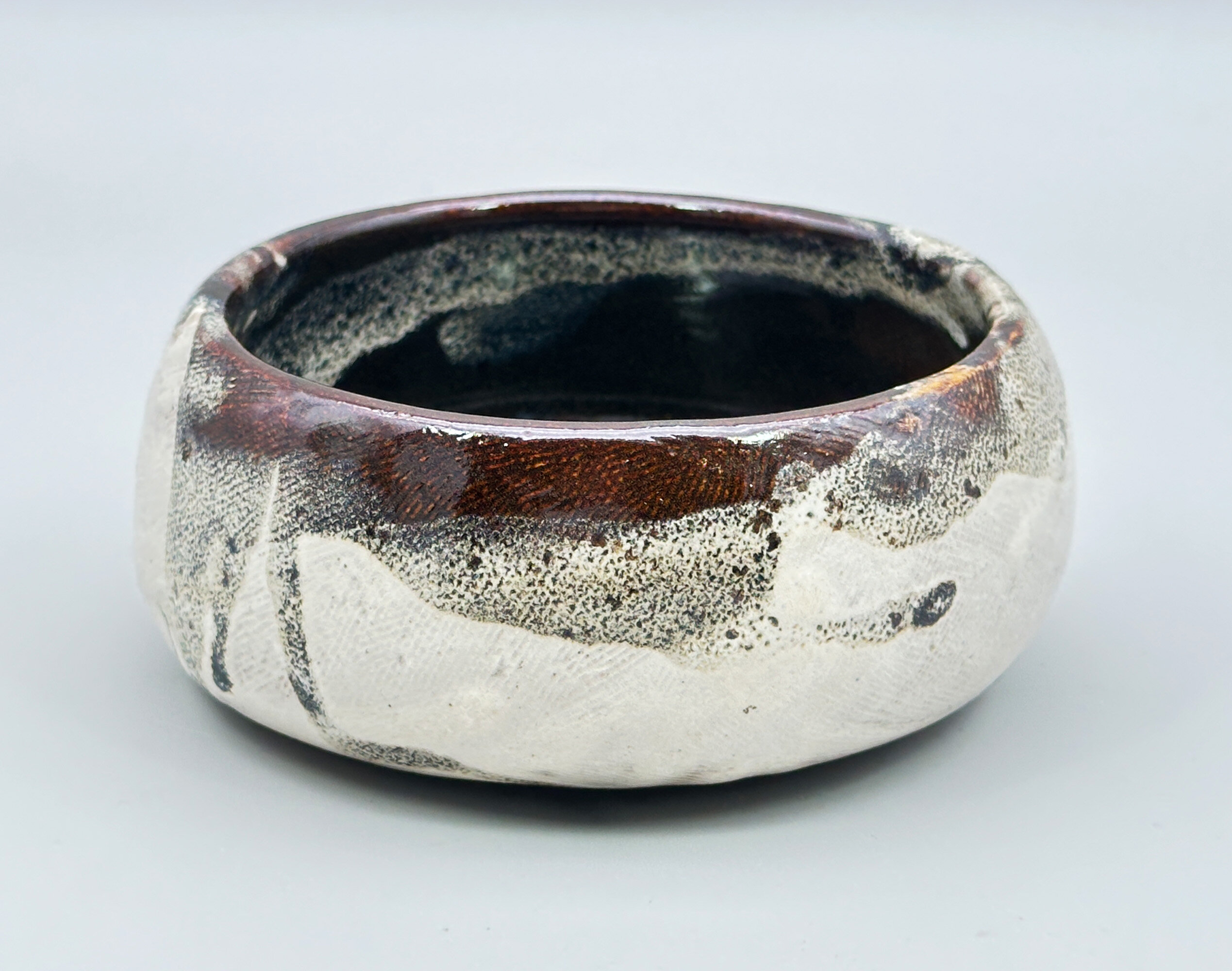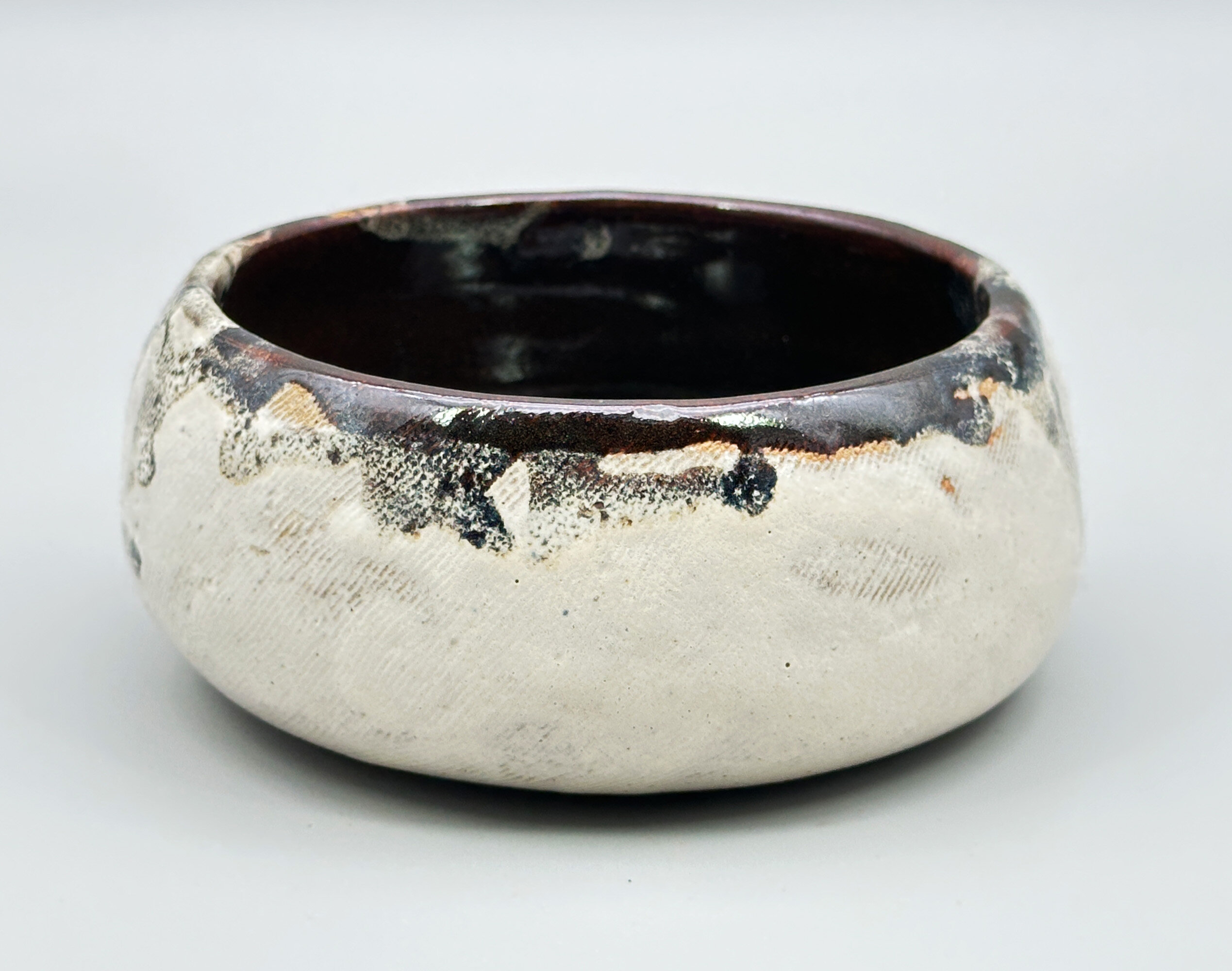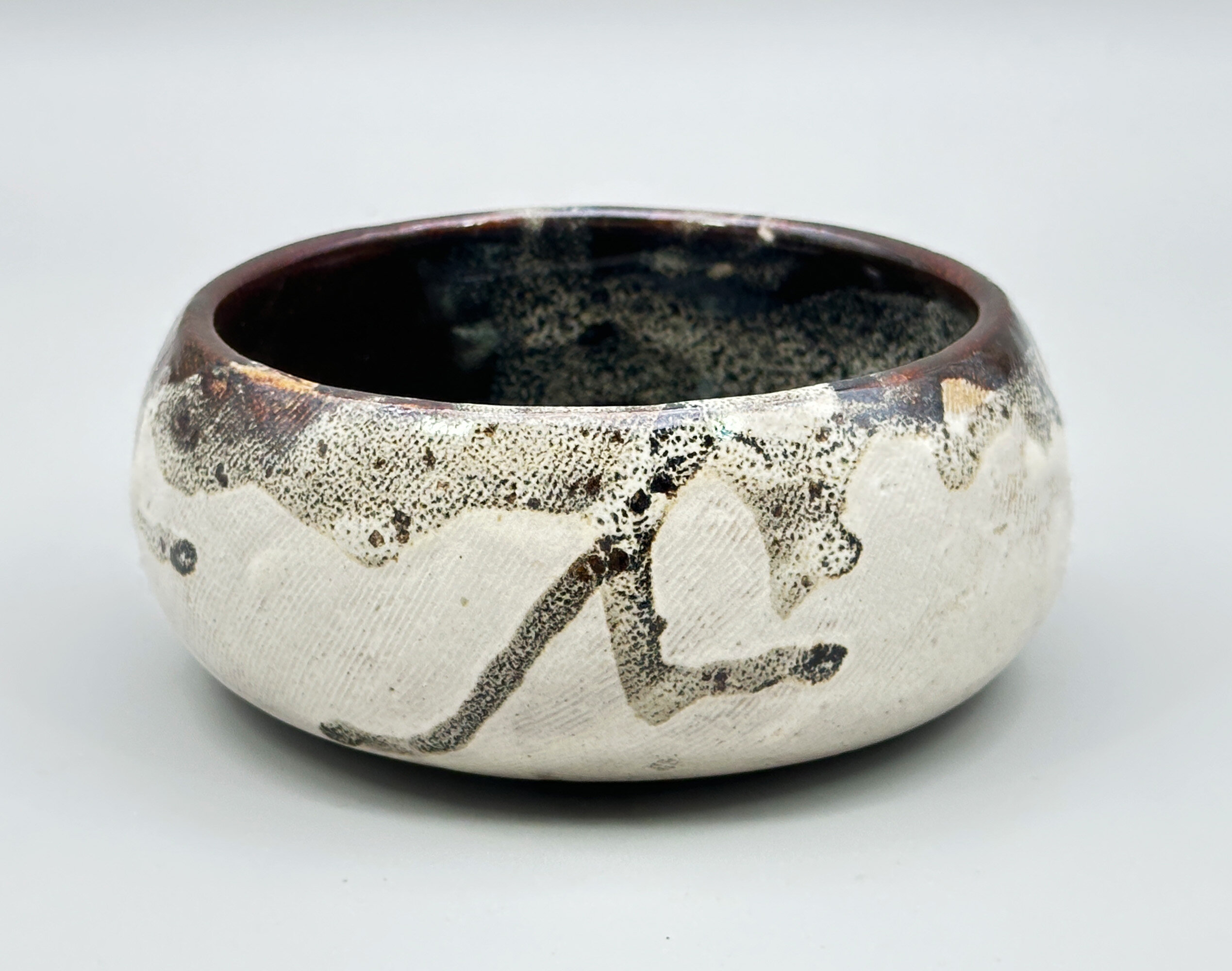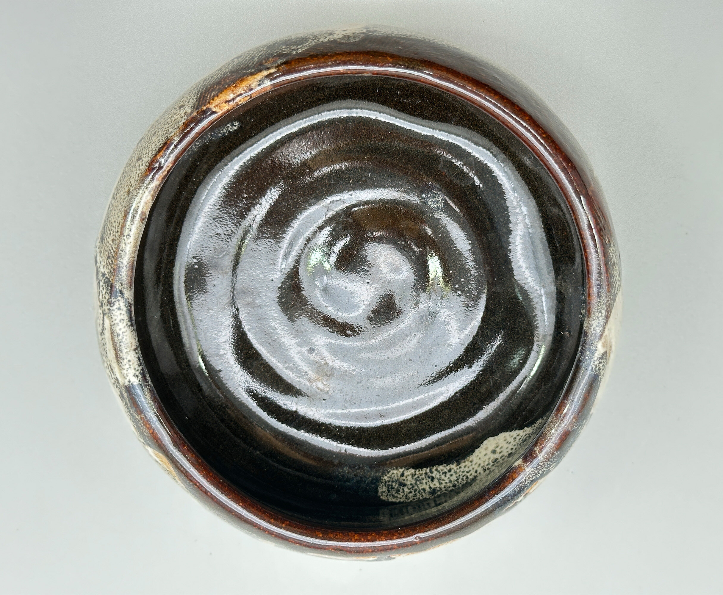 A studio pottery circular bowl, the walls incurving towards the top and base, the exterior glazed in cream with comb line markings with highlights in grisaille and brown splash glazes, the interior predominantly glazed in brown and the base unglazed, showing the stoneware body with pronounced potting rings within the foot and an incised signature ‘M.Lazenbury’. For the time being the potter of this piece can only be identified by the name inscribed but he or she was clearly an accomplished artist since the pleasing form combined with glaze effects which take after Japanese ‘Yukishino’ wares in which a natural, soft white or cream-colored glaze is combined with, earthy brown and green speckles and tones. The splash glaze effects are an addition to this but are fully in the tradition of the work of other rather better known artists making this bowl a pleasing addition to a collection of studio ceramics which reflect Japanese taste.