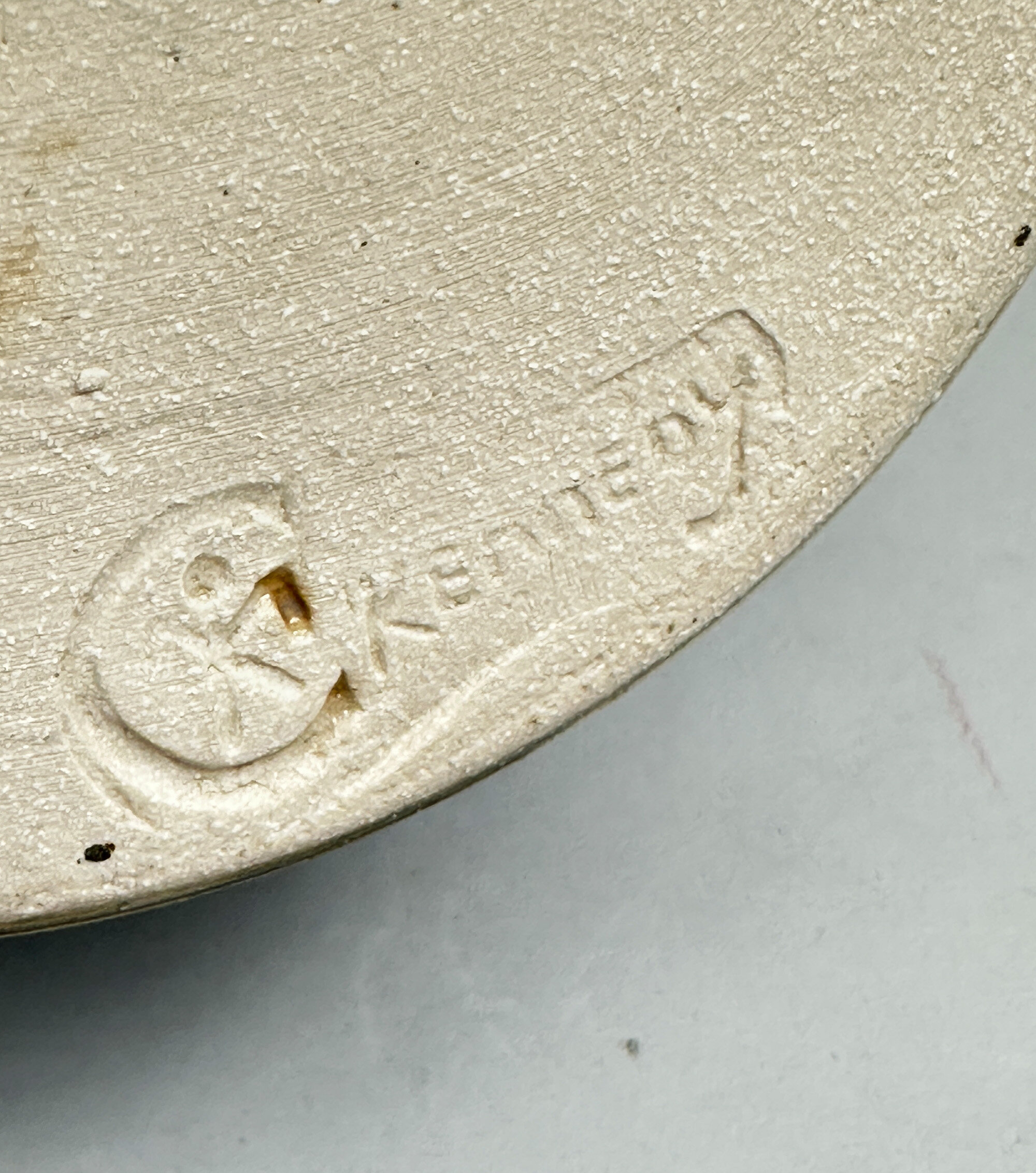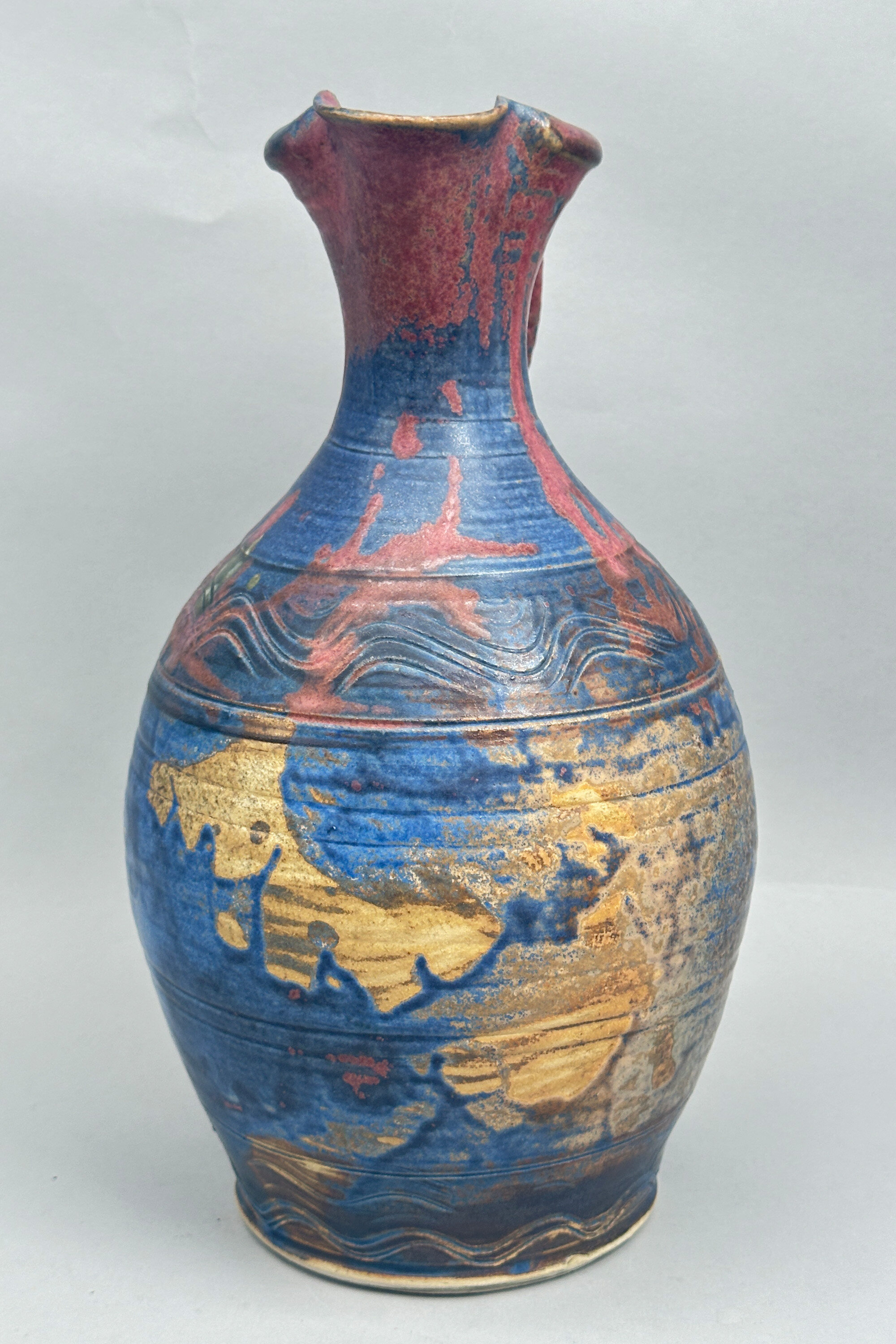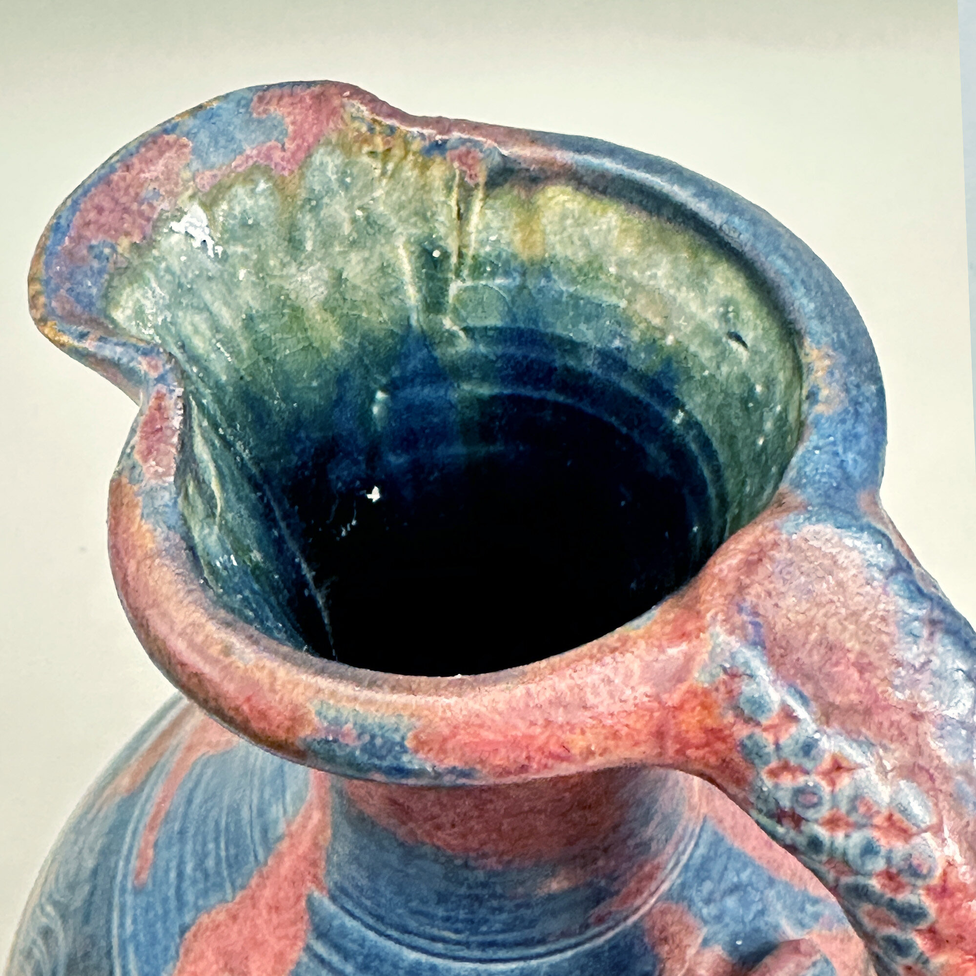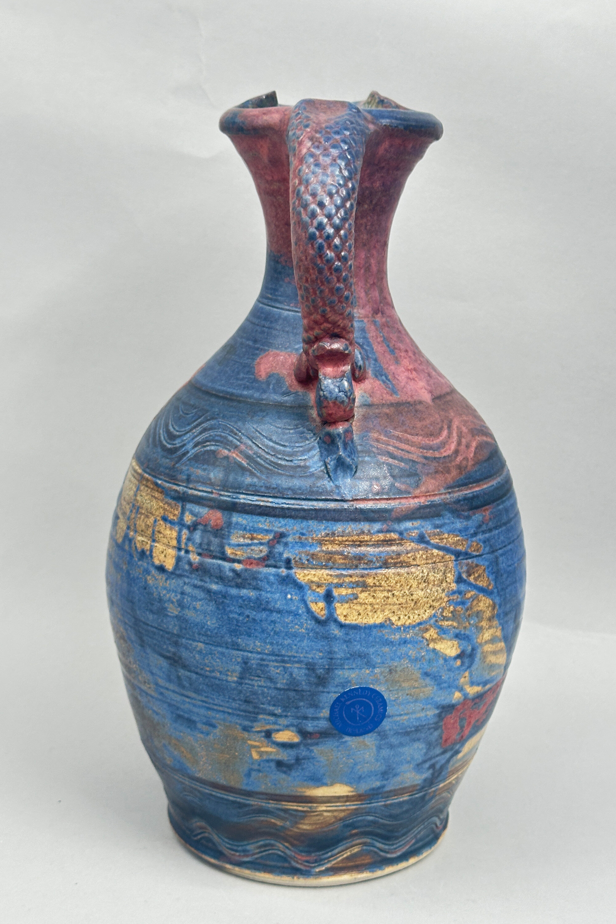 A studio pottery jug, the ribbed body of ovoid form with two bands of incised waves, the slender concave neck flaring out towards the top galleried rim with a modelled spout and opposite a loop handle in the form of a serpent, glazed overall with abstract designs in tones of blue, purple and gold, the flat base unglazed with an incised mark.Both the incised mark at the base and the small round sticker (see image 9) show this to be the work of the distinguished Irish Potter, Michael Kennedy who established his first studio at Sligo, Co Sligo, in 1979 and then a second studio at Gort, Co Gallway. Kennedy was a prolific and popular ceramic artist who was also happy to pass on his skills guiding many young potters at the start of their careers, some of whom went on to open successful potteries of their own. His work at Sligo was distinguished by the imaginative use of purple, pink and blue glazes of which this jug is an excellent example. There are various forms of his signature but the one here, possibly mainly used on his earlier works, is perhaps the most typical, a stick figure within a circle followed by the letters ‘Kennedy’. Michael Kennedy sadly died unexpectedly in 2021, but his works live on and can be seen in homes and galleries in Ireland and abroad.