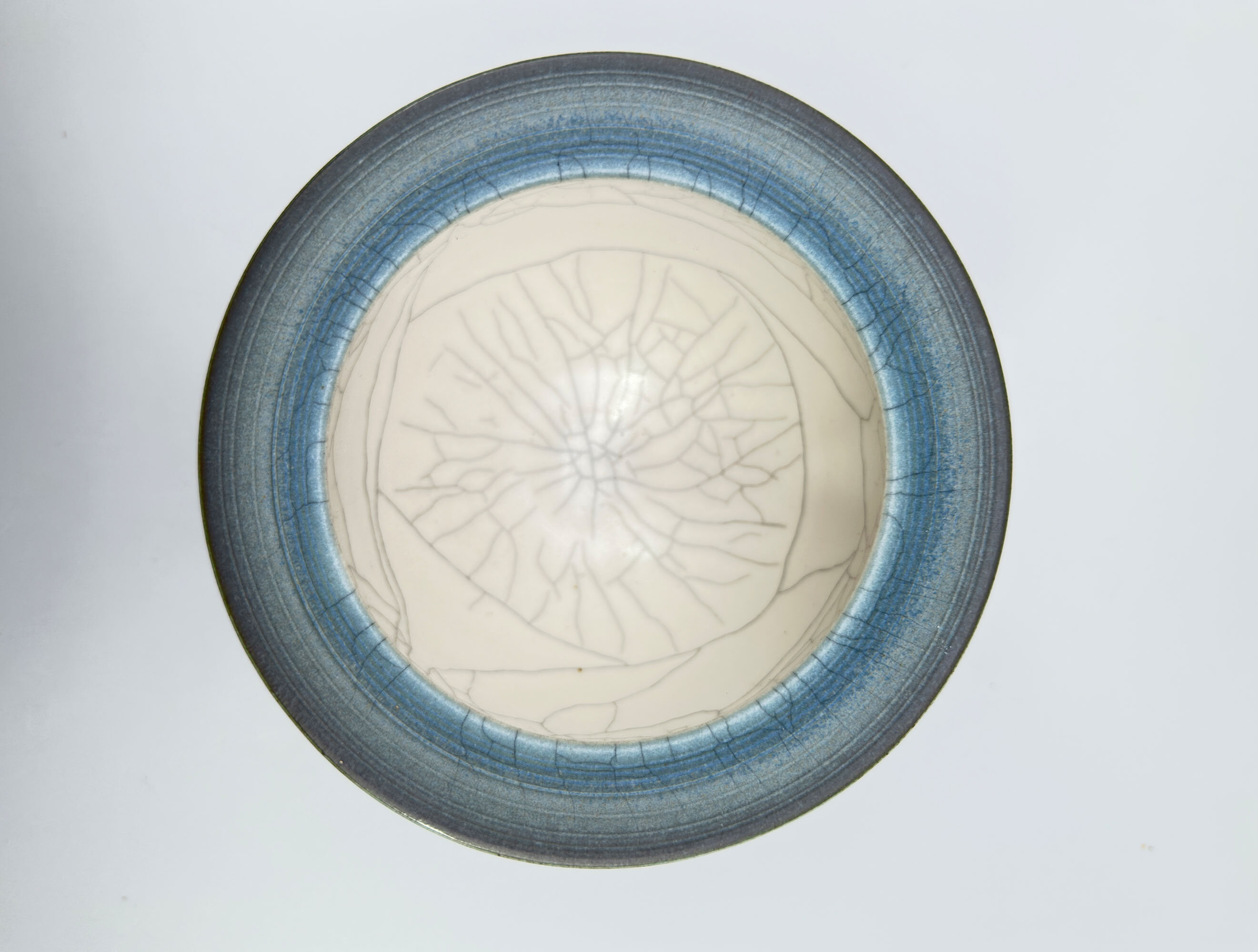 A ceramic vessel of near goblet form, the globular circular body above a slender slightly concave foot and flaring outwards to the broad rim, the base countersunk, the glaze with carefully controlled craquelure effects in cream and blue, the interior of the base glazed black and with a stylised cipher mark ‘DW’.