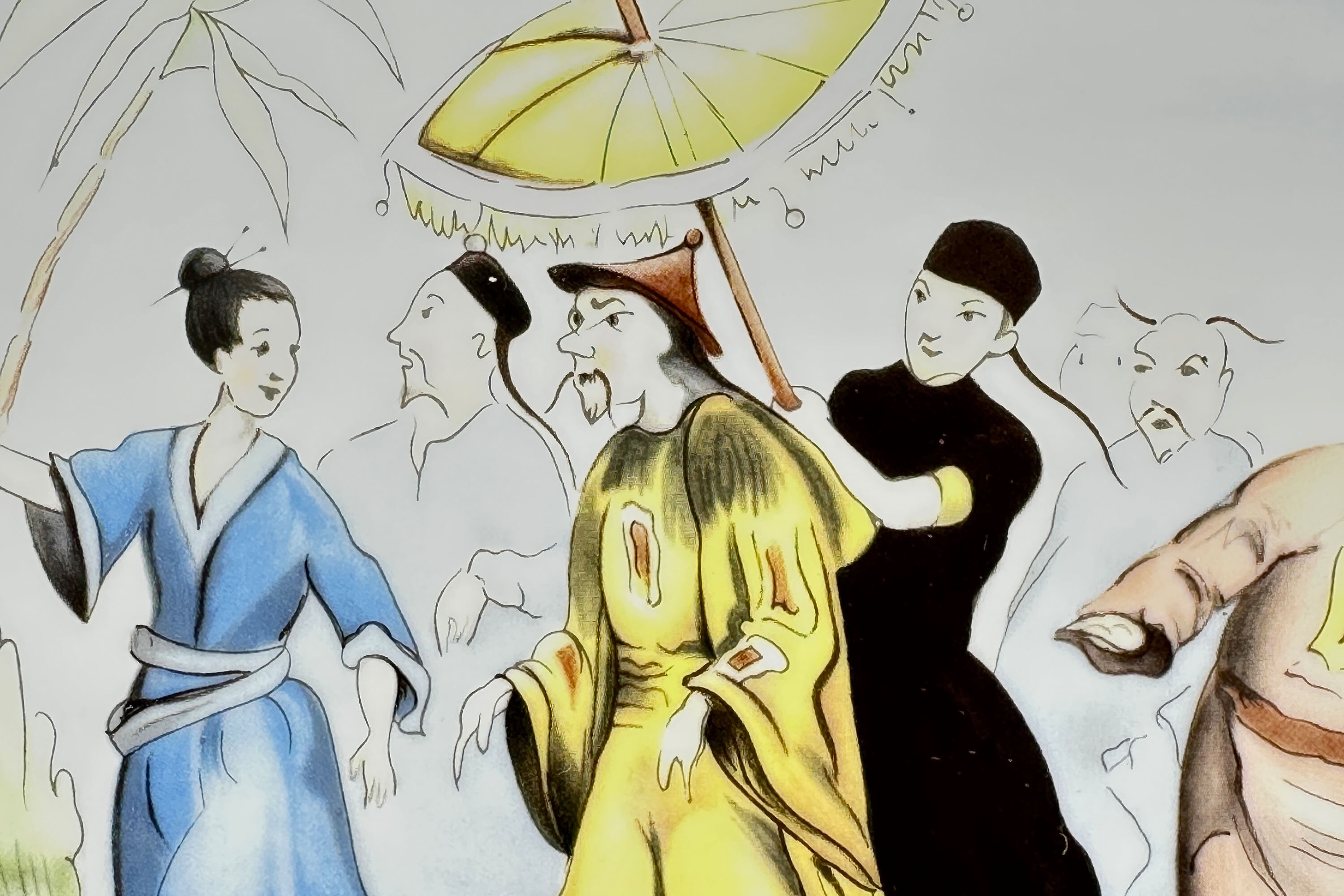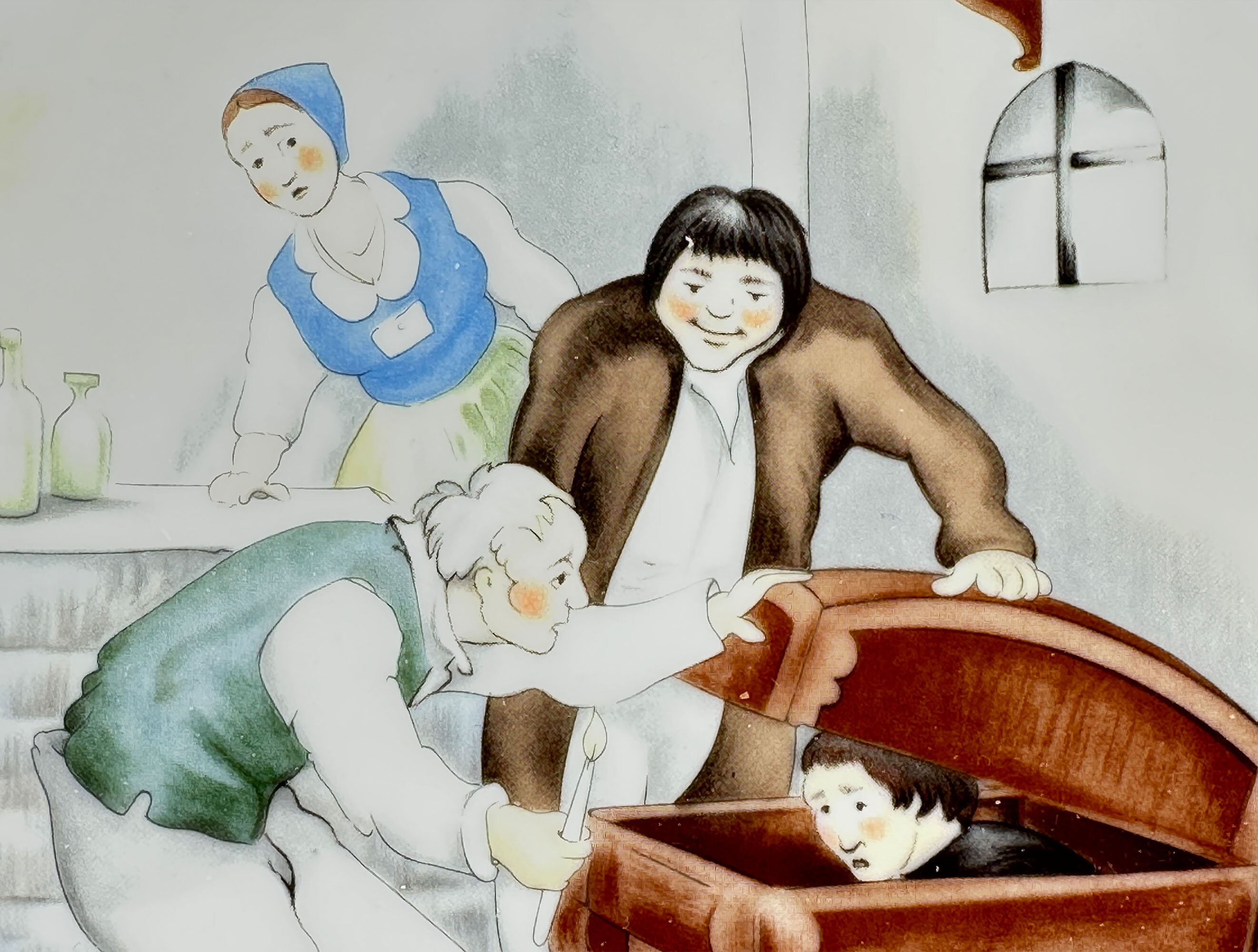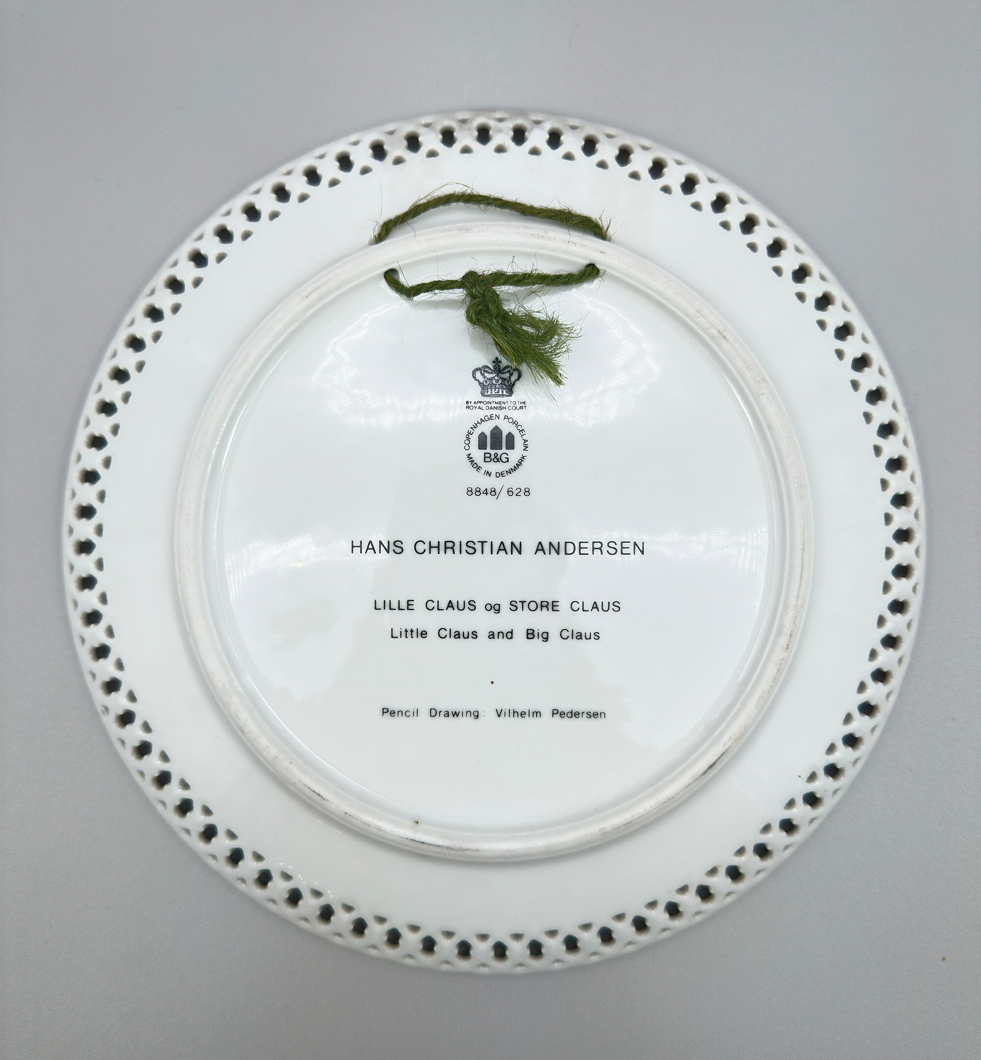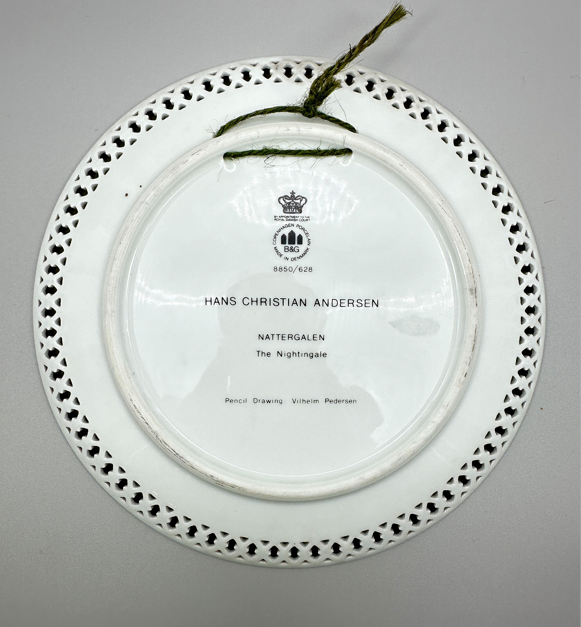 These are two plates from a series produced by the celebrated Danish porcelain manufacturers Bing & Grøndahl representing scenes from the fairy tales of Hans Christian Andersen. Made from fine quality porcelain and with gilt edged openwork borders, each plate is decorated in colour with a scene from Andersen’s stories : ‘Little Claus and Big Claus’ and ‘The Nightingale’. The plates are clearly marked at the back with the manufacturer, the scene depicted and the artist who drew it.Bing & Grøndahl was established in 1853 by the sculptor Frederik Vilhelm Grøndahl and the merchant brothers Meyer Hermann Bing and Jacob Herman Bing. Their trademark, which can be seen on these two plates, was that of three towers, which was derived from the Coat of Arms of Copenhagen. Their designs proved popular and it is said that their dinnerware service in the ‘Seagull’ pattern could be found in one in ten Danish households in the 1950s. Eventually, in 1987 the company merged with its competitor, the Royal Porcelain Factory, under the name Royal Copenhagen, but some of the pieces produced thereafter still display the initials ‘B&G’ and the three tower symbol, as here. Originally sold with fitted boxes (not included here), these plates were probably produced in the early years after the merger and are sought after as collectors’ items today.