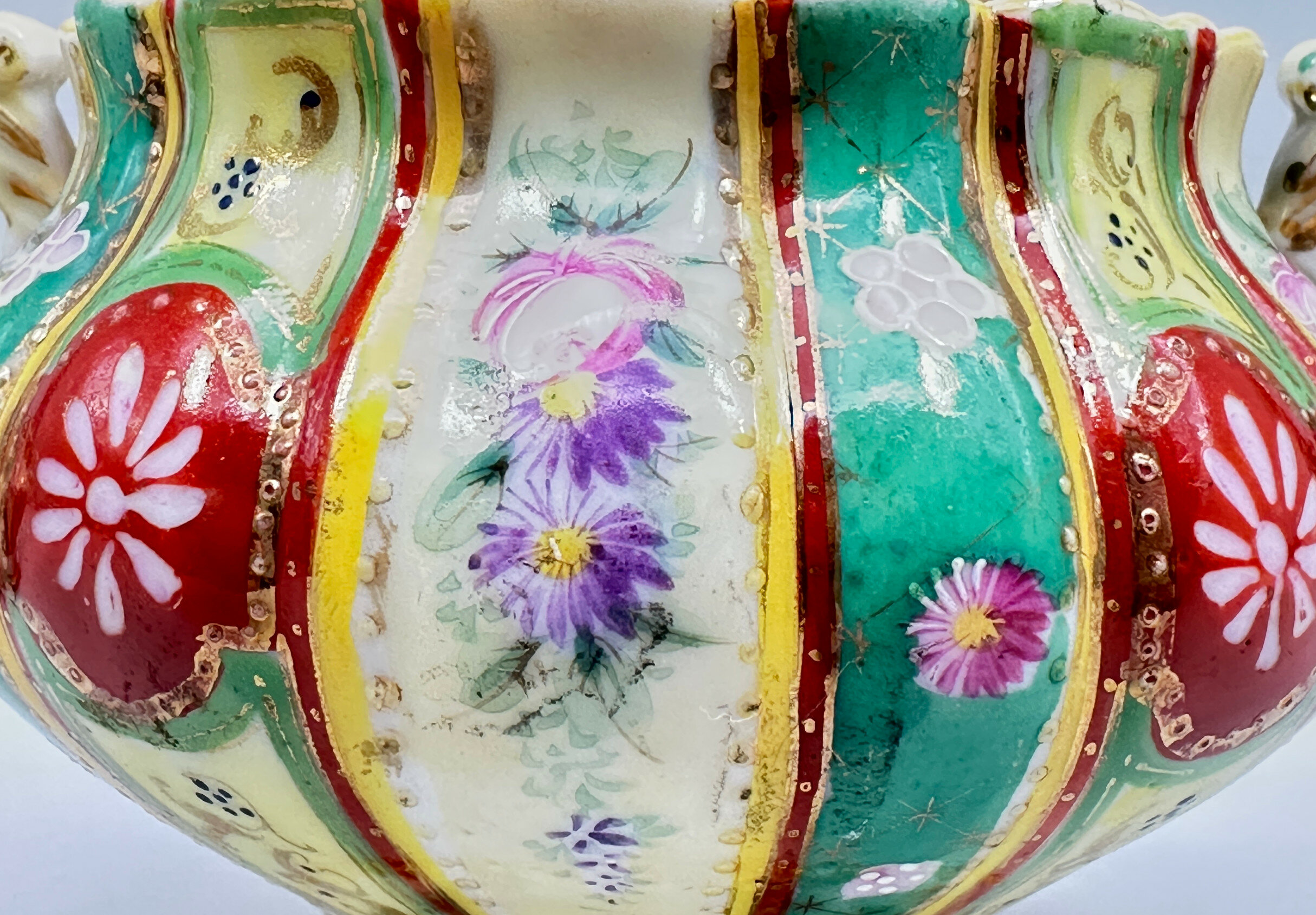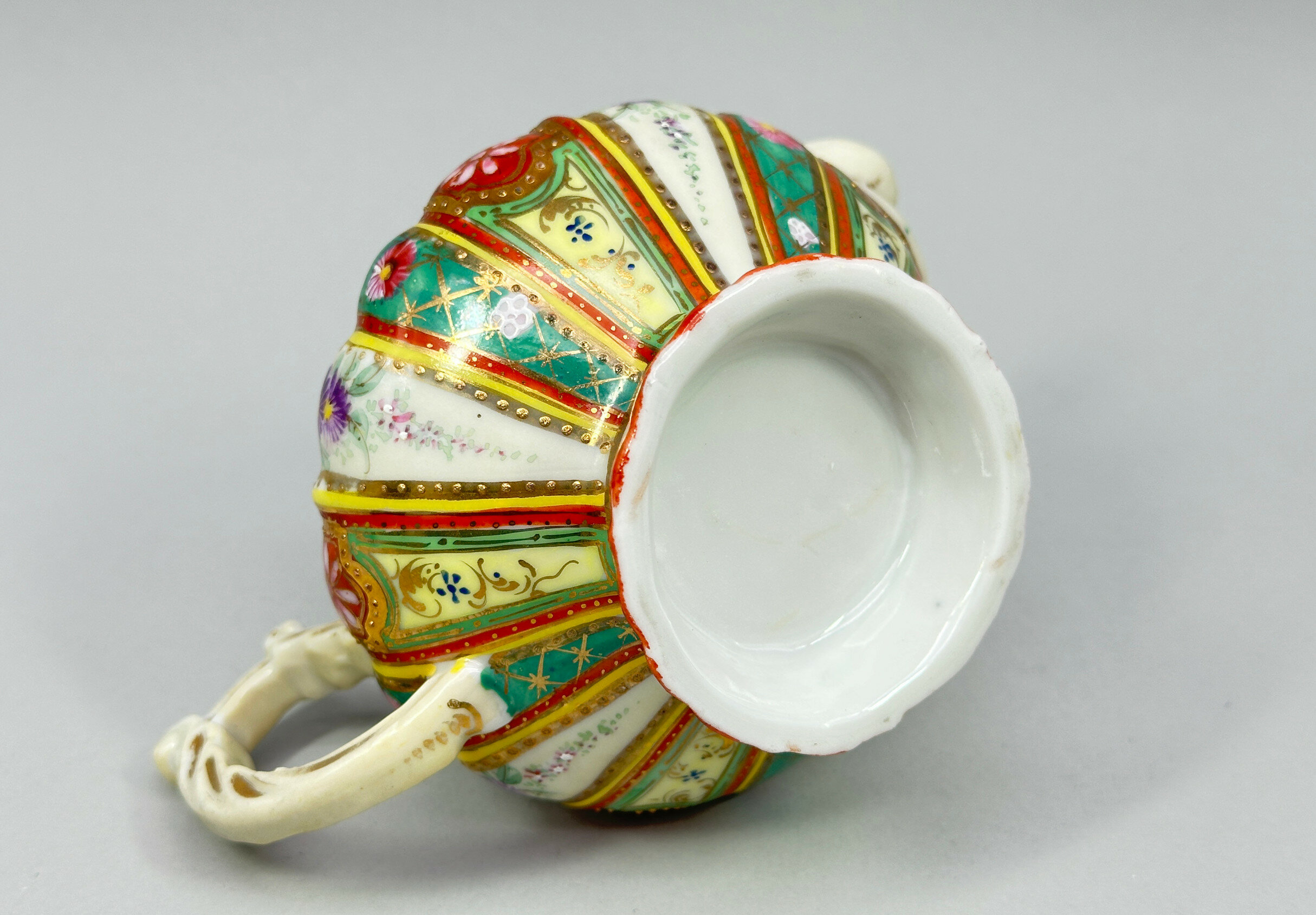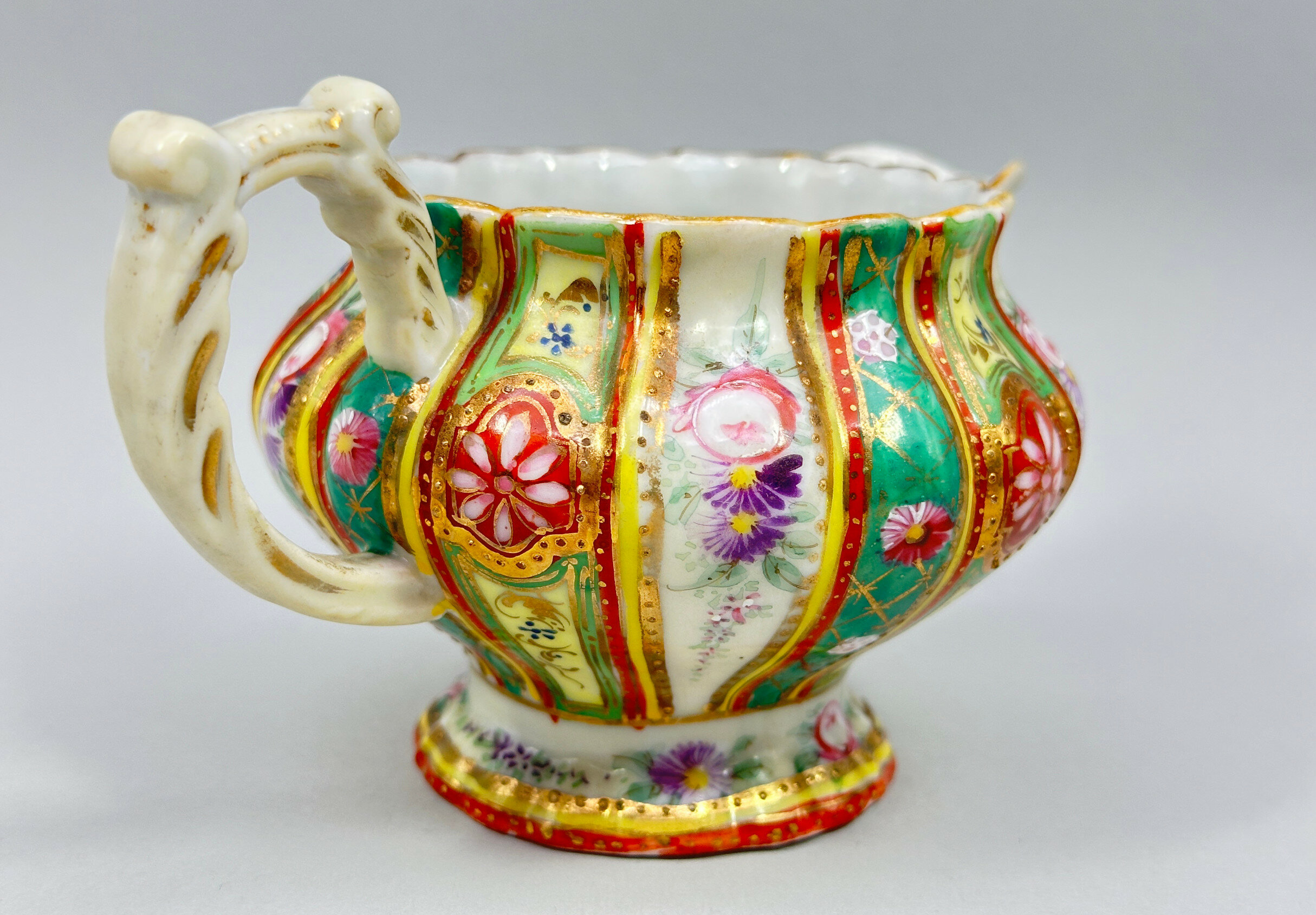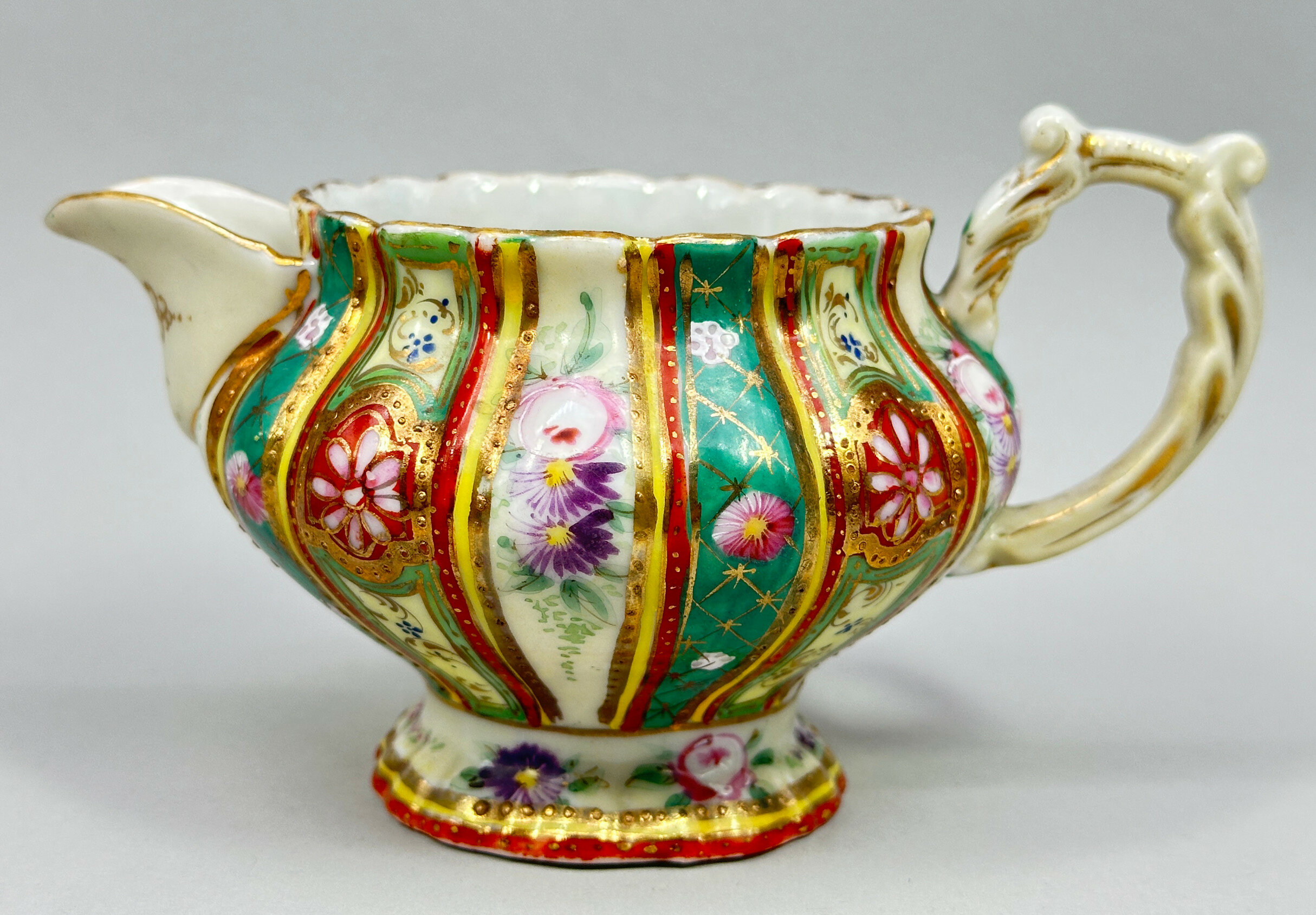This is a matching duo from an original tea service comprising a sugar bowl and cover and a cream jug. Both are elaborately formed with fluted bodies and rococo style handles and are decorated with vertical bands with floral blooms on green and yellow grounds. They are clearly continental and the style of decoration suggests porcelain made in Bohemia, now part of the Czech Republic. These pieces are known for their quality and the use of traditional techniques, often featuring hand-painted decoration, as here. Dating is probably to the 1950s with the intention to recreate and imitate earlier European styles.| Size: | Sugar is 13 cm high, 15 cm wide, Cream is 9cm high, 15cm wide |
