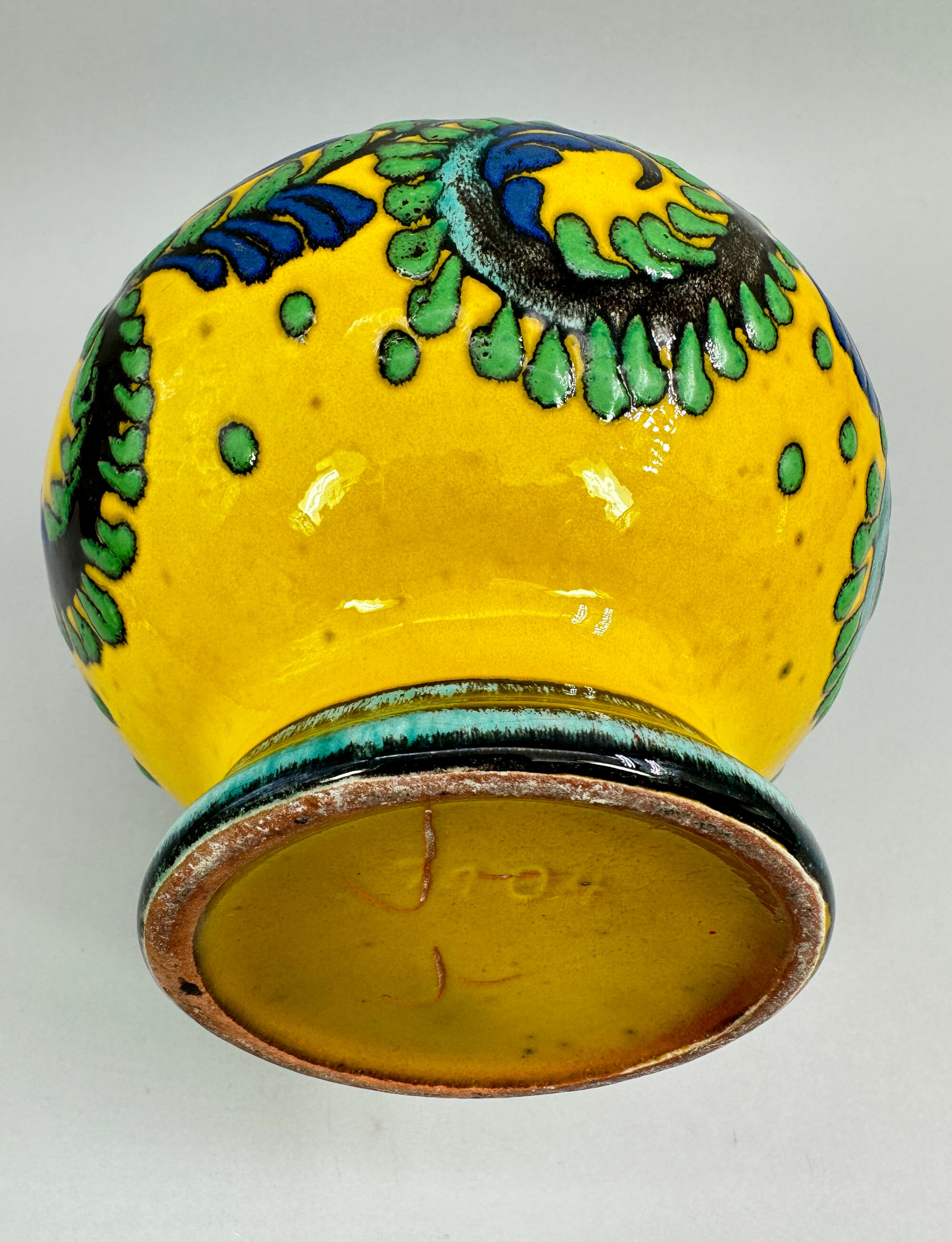 A West German Ceramic Vase, the bulbous body rising to a slightly flaring ribbed neck and with a short spreading foot, thickly glazed in yellow with green and blue enamel stylised scrolling foliage, green bands to the foot and top rim, the top interior finished in blue and the foot finished in mustard brown with an impressed mark '7104'.While not stamped with a maker's mark, vases of this type are attributed to the West German Ceramics factory Marei which produced pieces from 1949 to 2016. Marei was the commonly used abbreviation for the firm's name which was Majolikafabrik Rheinbach Jean Fuss and Sohn. The pieces are distinguished by the use of a reddish clay but this was sometimes more brown or dark brown depending on the suppliers used. Marks are usually impressed into the base although these are often just pattern numbers, as here. Many pieces are unmarked and some are stamped 'MADE IN GERMANY' or 'W.GERMANY'. The pattern number here is '7104'and is found on similar pieces with the same shape but different decoration. This vase was probably made in the 1970s and is typical of the striking designs the firm produced.