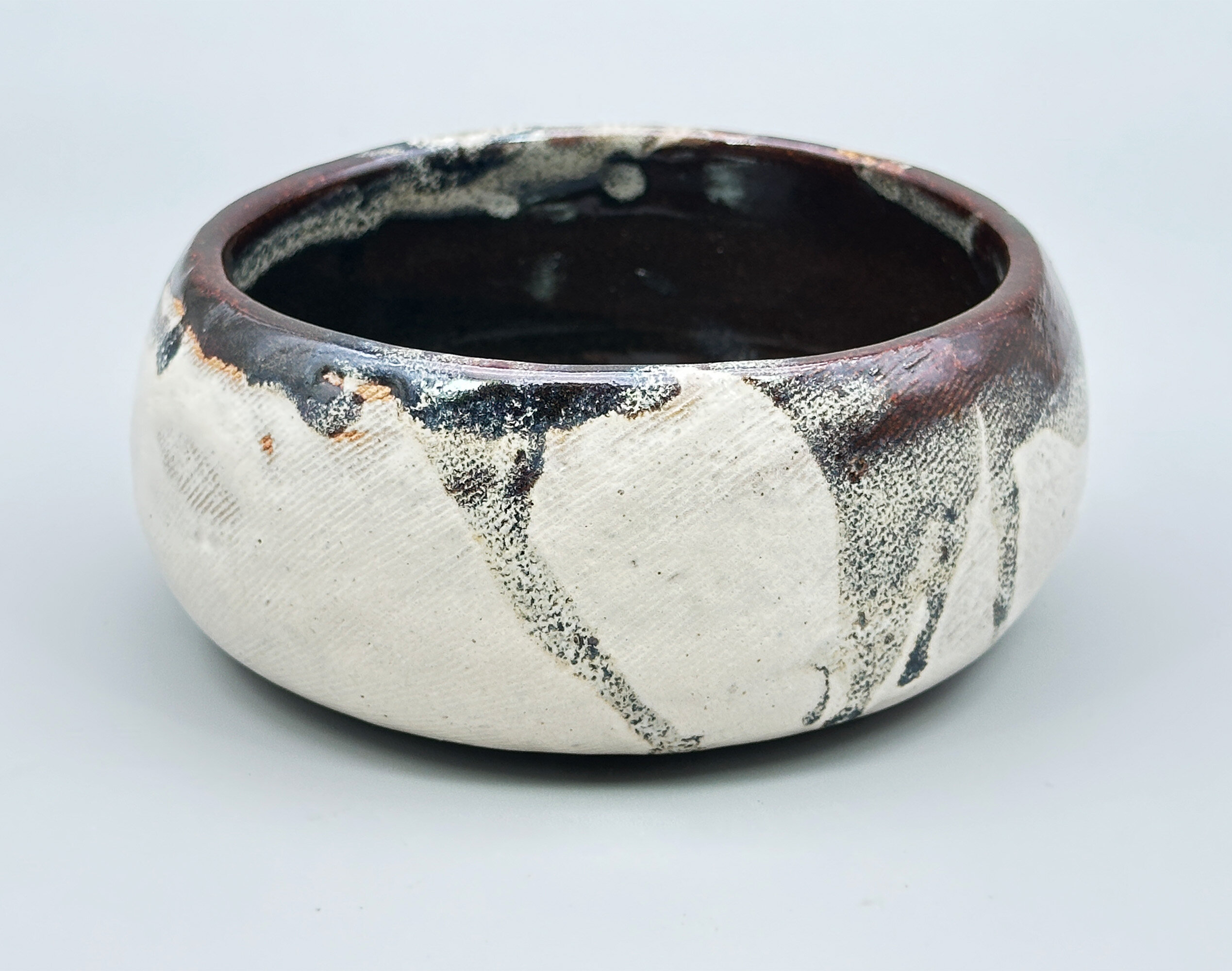 Price: £55While it is not absolutely certain the mark on this piece is possibly that of Derek Clarkson (1928-2013). Clarkson trained at the Manchester college of Art between 1944-47 and Burnley School of Art from 1959-61 and then combined a successful lecturing career with the making of his own work which is now to be found in international and private collections including the Victoria and Albert Museum, London. In 1980 he retired from lecturing to focus on his work as a potter, continuing to produce pieces of great skill and attraction until his death in 2013. There are other pieces signed by him which strongly resemble the bowl here (see images 11,12) making it a possibility that this is his work. Certainly, the potter who created this piece and impressed his mark at the bottom was clearly accomplished and this bowl is more than worthy to stand comparison with pieces by more famous contemporaries.