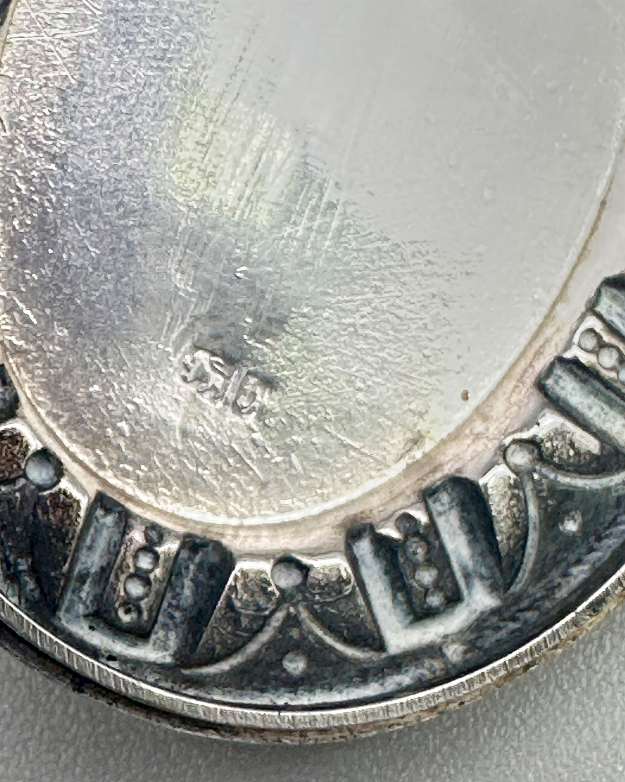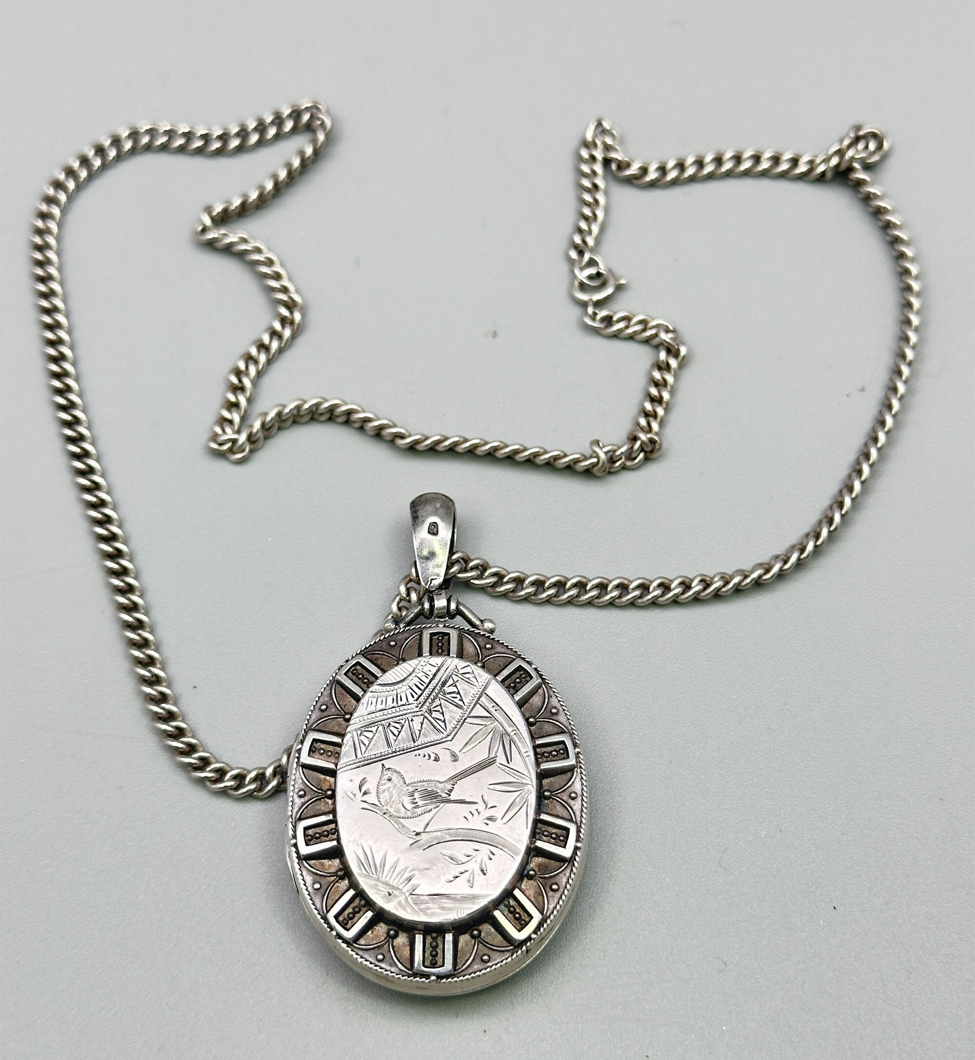 This is an amazing locket that is a perfect example of the Aesthetic Movement in Britian. This was aligned with Arts and Crafts but the Aesthetic designs featured classical and Japanese designs that were considered more opulent and elegant than the over the top designs of the Victorian period. It was a response to the mass consumerism that was taking over Britian during this time. This locket is marked with full English marks. It is paired with a belcher chain of a similar age.| Size: | Locket is 44 x 32.5 mm without the bale, Necklace is 50 gm long |